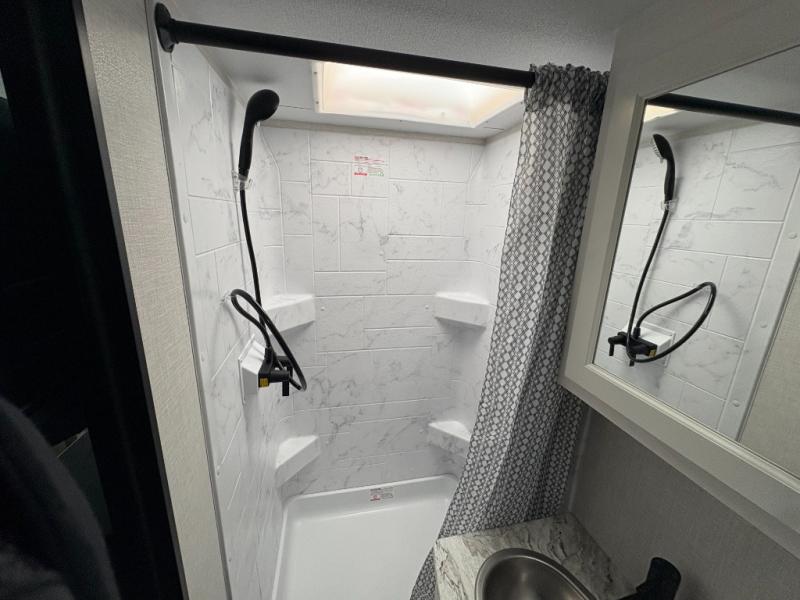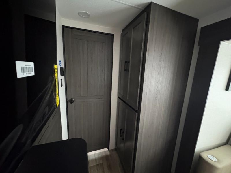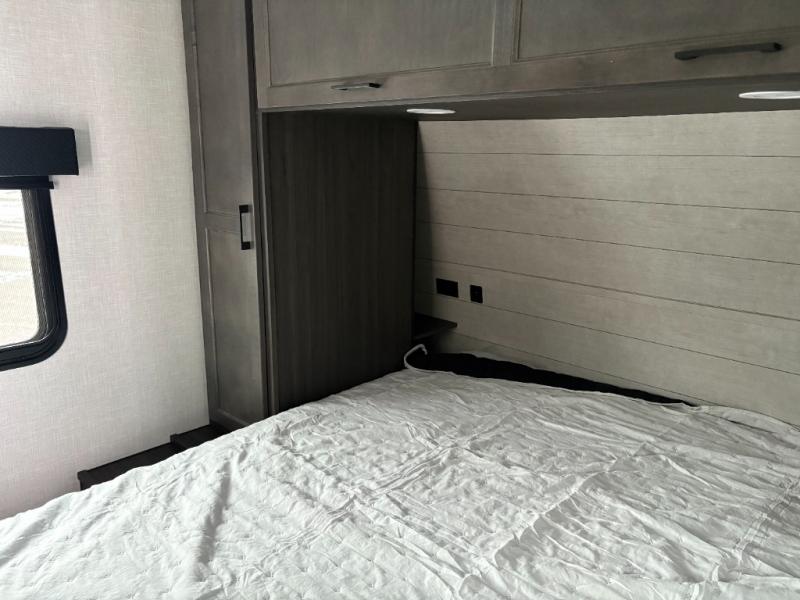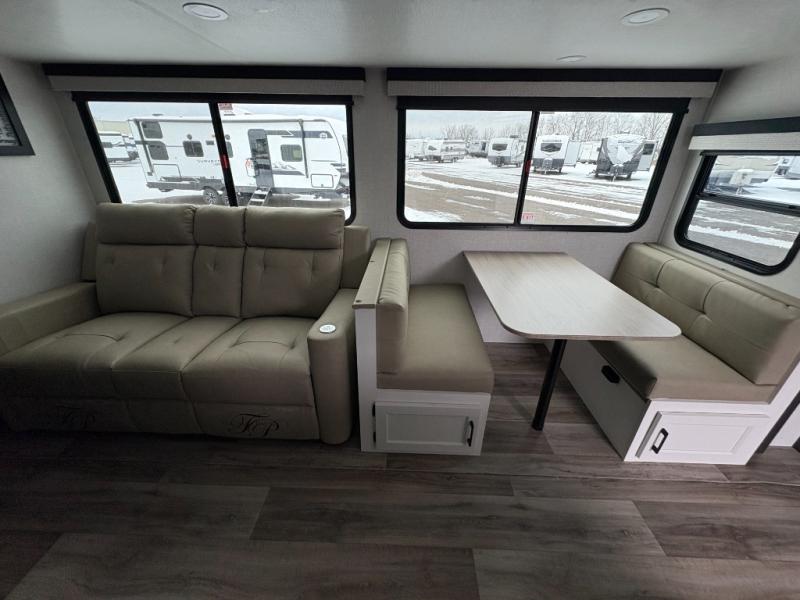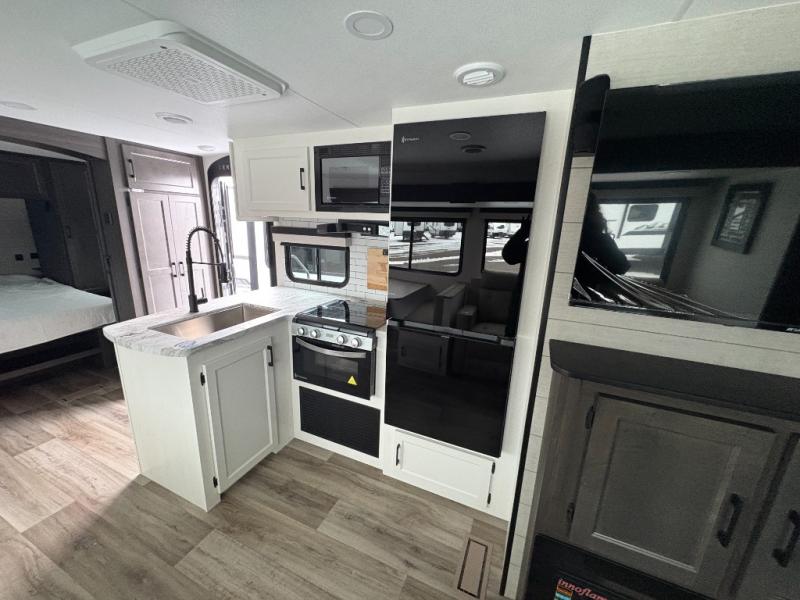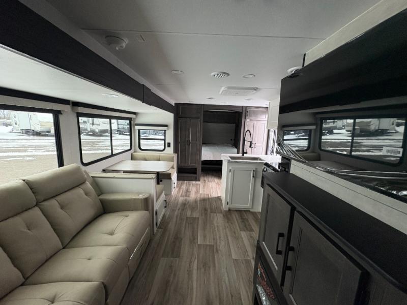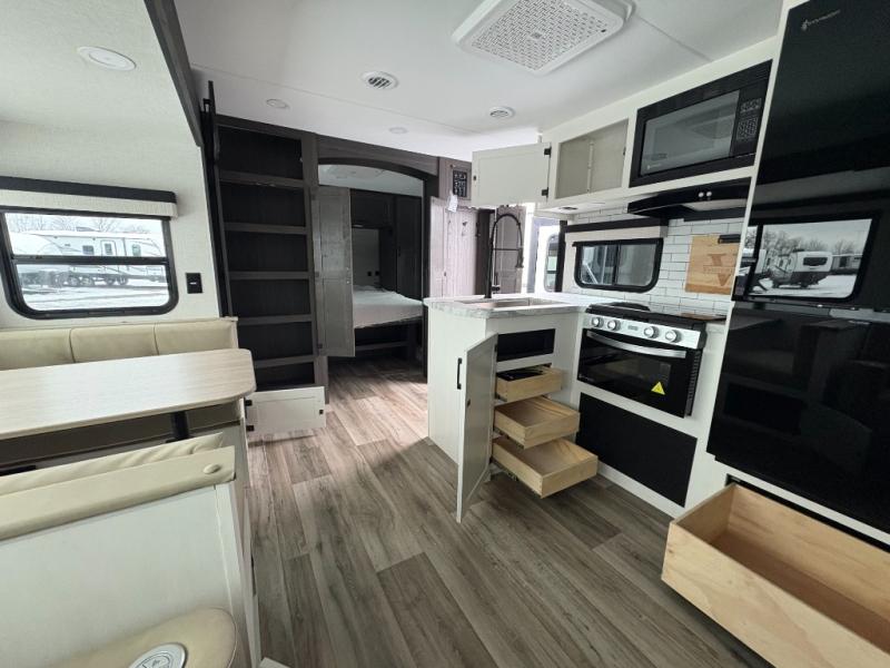 You, your kids and/or friends, and your pets can all have a relaxing camping trip in this travel trailer! The unique rear private bunkhouse has a set of 32" x 70" bunk beds, and a set of 28" x 70" bunks where the top bunk flips up, and its ability to convert into a desk, king bed, storage, or a pet palace. Just outside the bunkhouse is a full bathroom with a 30" x 36" shower to freshen up in each morning. Everyone can gather together at the 70" sofa and 42" booth dinette while watching a movie and enjoying the fireplace at the entertainment center. The front private bedroom has sliding doors to shut when you're ready to sleep on the sleep tight queen bed. Prepare your meals either indoors with the three burner cooktop or at the outside campfire café with the griddle, refrigerator, and sink!