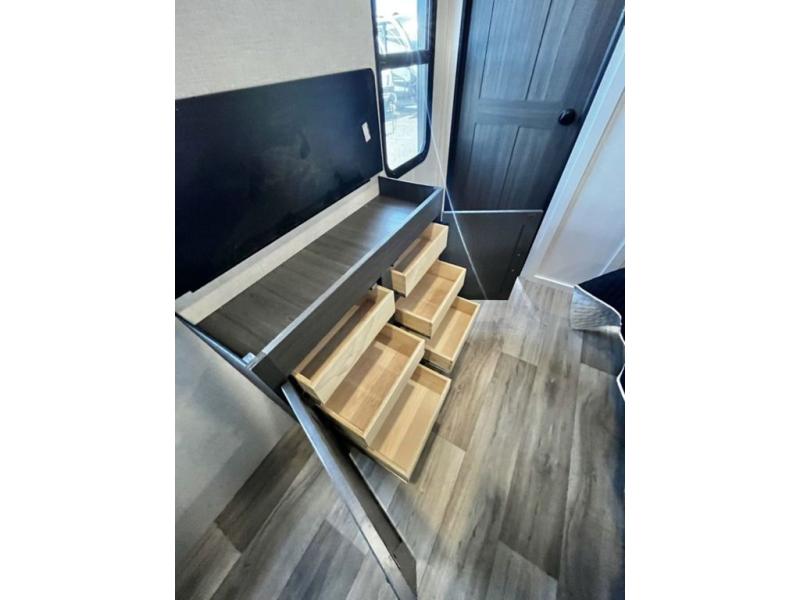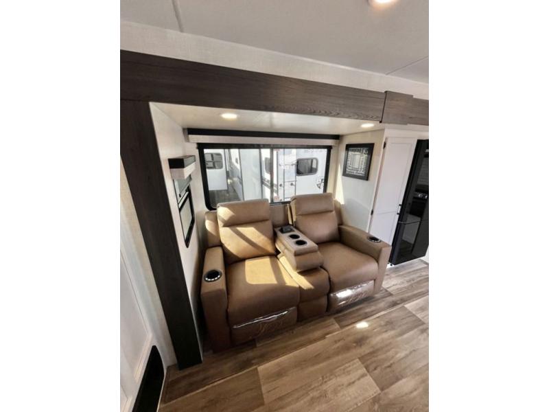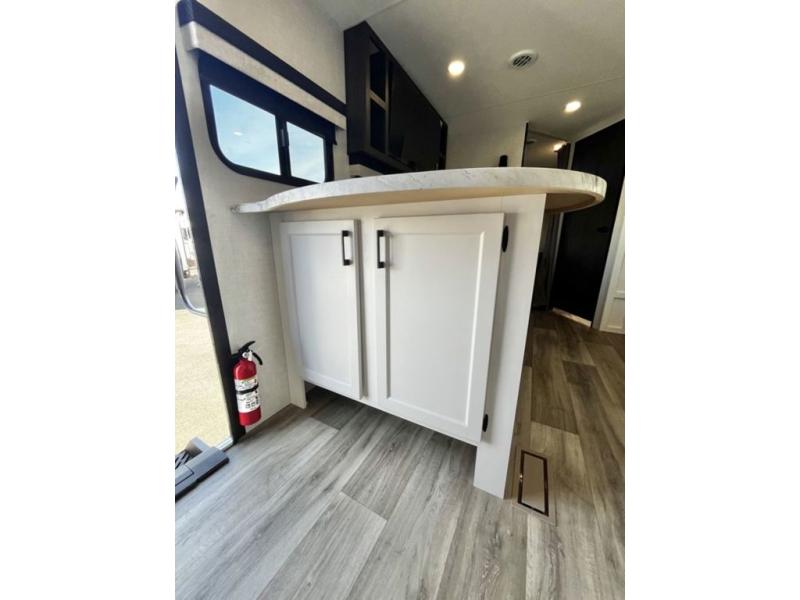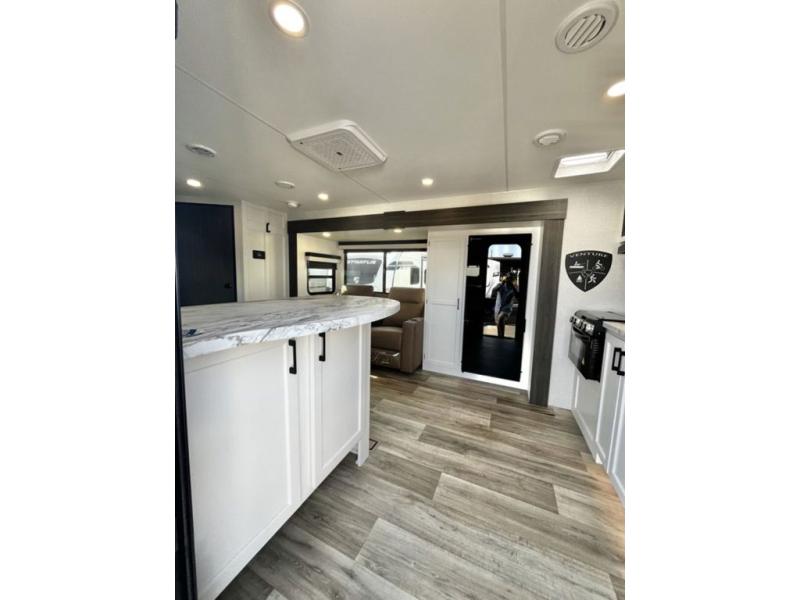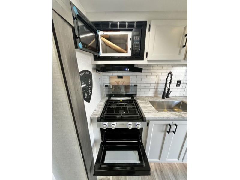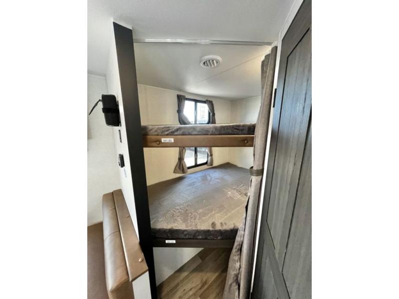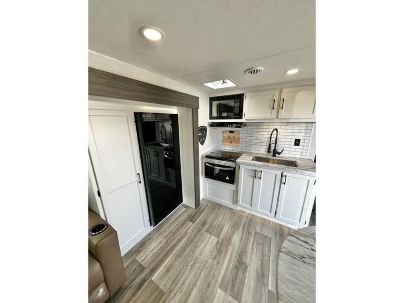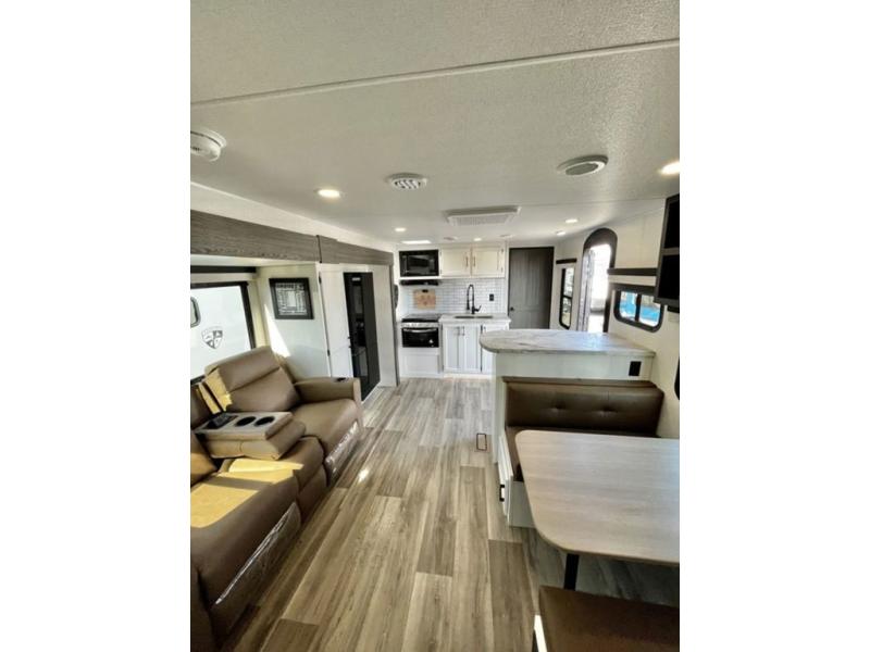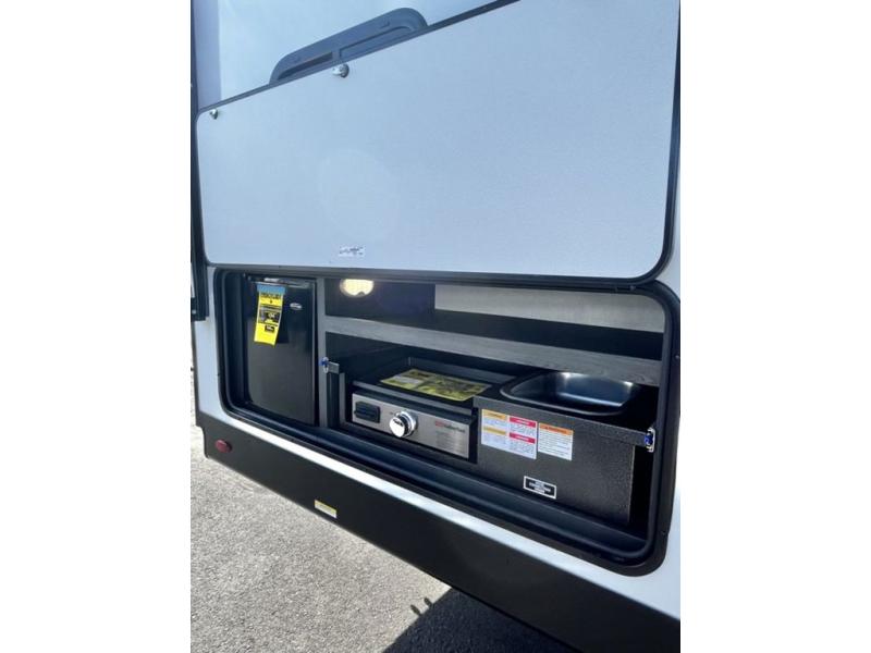 Sleep tight with your family on the road! This travel trailer is special for the whole family since it has plenty of space for sleep. First we have the 60" x 80" queen bed, the 51" x 75" double size bunk bed, you can also two people on the sit n' slide dinette and one more on the 70" sofa. Cook delicious dinner in the incredible kitchen. It includes stainless steel sink with cover and dish drying racks, three cooktop burner, 10 cu. refrigerator, pantry and an over head cabinet. However you can also have an amazing cooking time outside thanks to the outdoor kitchen, ideal ideal to share a meal with your family while enjoying nature and its surroundings. Store your belongings in the large closet beside the bed and also in the pass thru storage. Finally, take a relaxing bath in the full bathroom furnished with a 30" x 36" shower.