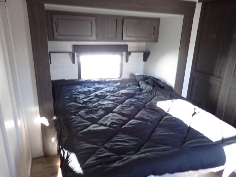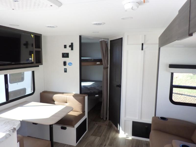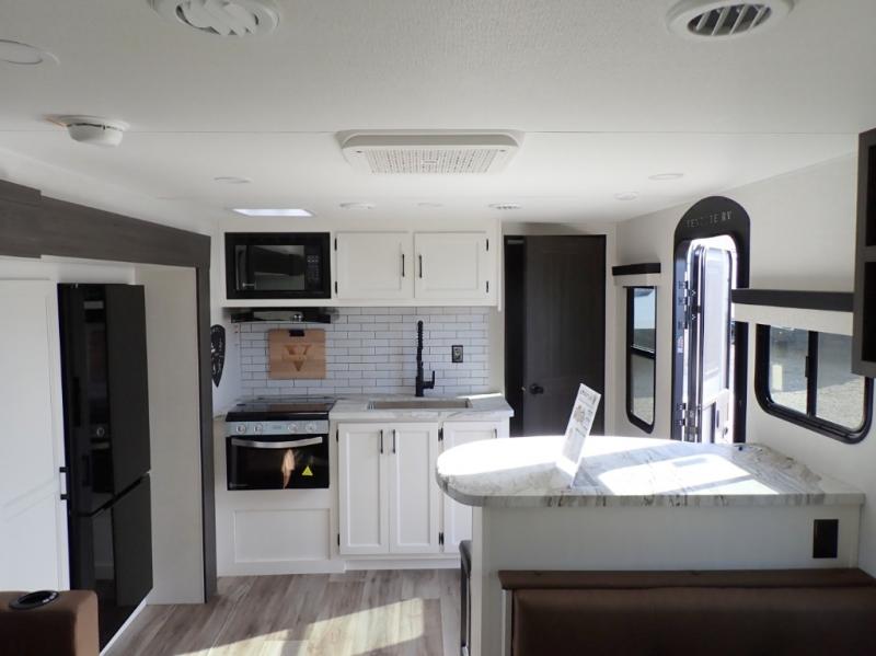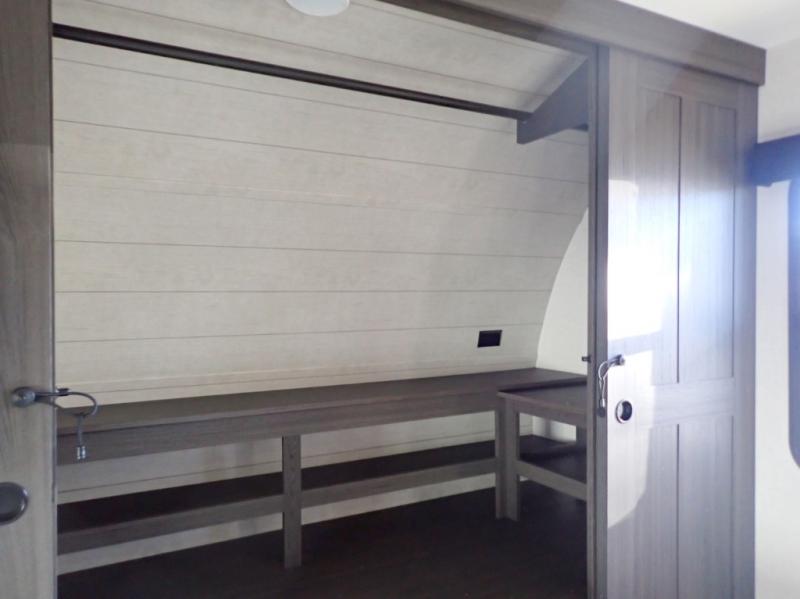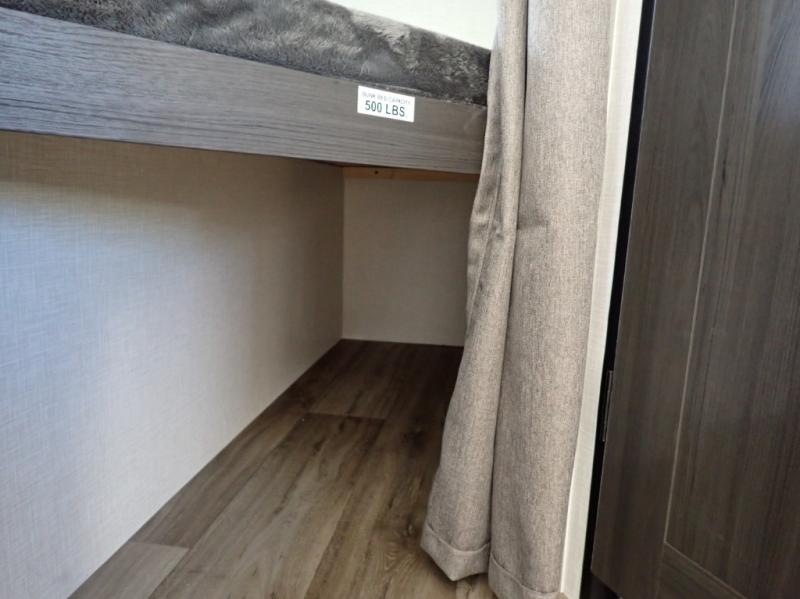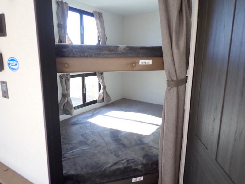 What a great family camper! The Stratus 302VBH is perfect for you and your kiddos! Room to sleep 8! Private front bedroom with slideout. You will appreciate the extra room having an east/west queen bed will provide. There's also a huge front closet. Rear double over double bunks. When you factor in the breakfast bar, the really stylish Modern Farmhouse decor, the outside kitchen, and all the storage options both inside and out, you truly have a winner in this family-focused bunkhouse.