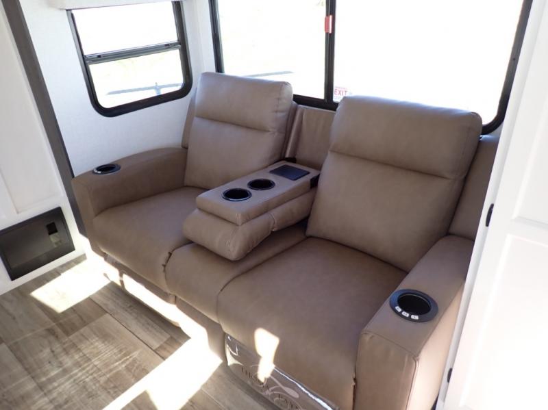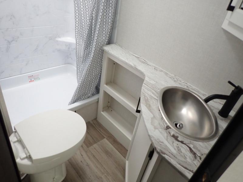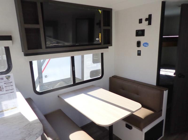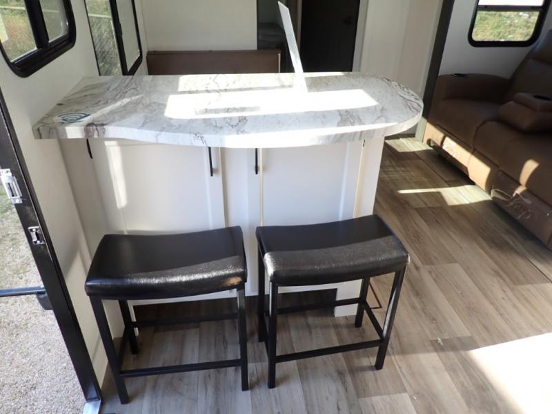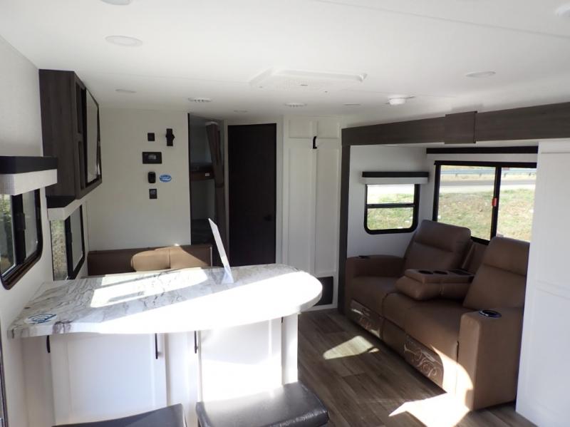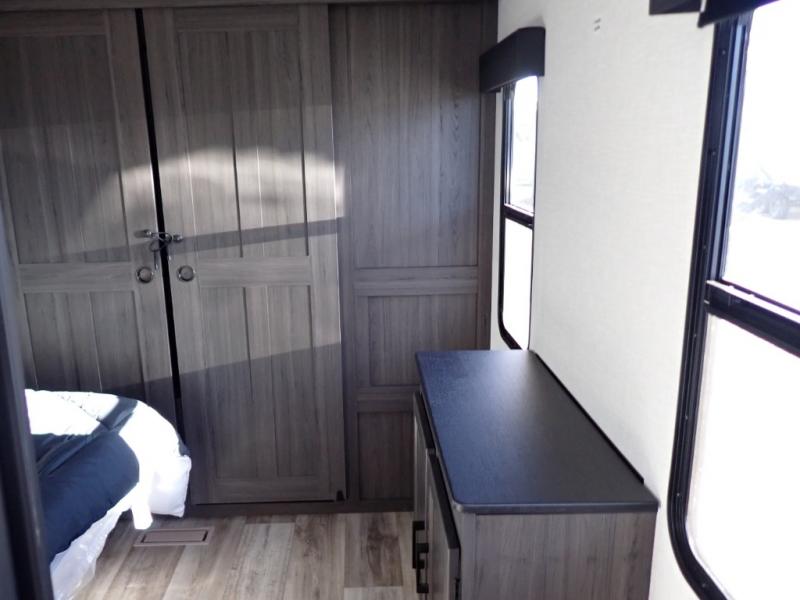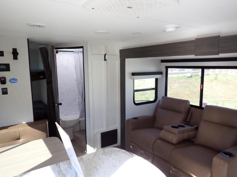 What a great family camper! The Stratus 302VBH is perfect for you and your kiddos! Room to sleep 8! Private front bedroom with slideout. You will appreciate the extra room having an east/west queen bed will provide. There's also a huge front closet. Rear double over double bunks. When you factor in the breakfast bar, the really stylish Modern Farmhouse decor, the outside kitchen, and all the storage options both inside and out, you truly have a winner in this family-focused bunkhouse.
