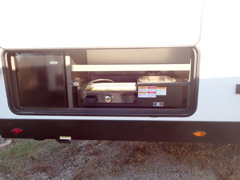Sleep tight with your family on the road! This travel trailer is special for the whole family since it has plenty of space for sleep. First we have the 60" x 80" queen bed, the 51" x 75" double size bunk bed, you can also two people on the sit n' slide dinette and one more on the 70" sofa. Cook delicious dinner in the incredible kitchen. It includes stainless steel sink with cover and dish drying racks, three cooktop burner, 10 cu. refrigerator, pantry and an over head cabinet. However you can also have an amazing cooking time outside thanks to the outdoor kitchen, ideal ideal to share a meal with your family while enjoying nature and its surroundings. Store your belongings in the large closet beside the bed and also in the pass thru storage. Finally, take a relaxing bath in the full bathroom furnished with a 30" x 36" shower.