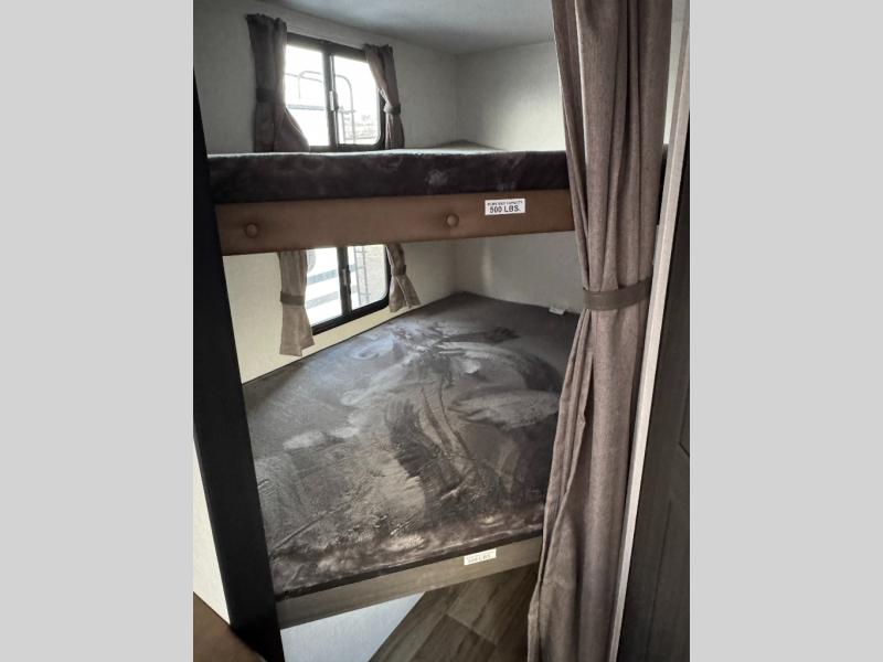 Sleep tight with your family on the road! This travel trailer is special for the whole family since it has plenty of space for sleep. First, we have the 60" x 80" queen bed, the 51" x 75" double size bunk beds, you can also have one person on the sit n' slide dinette and one more on the 70" sofa. Cook delicious dinner in the incredible kitchen. It includes stainless steel sink with cover and dish drying racks, three cooktop burner, 10 cu. refrigerator, pantry and an overhead cabinet. However, you can also have an amazing cooking time outside thanks to the campfire cafe, ideal to share a meal with your family while enjoying nature and its surroundings. Store your belongings in the large closet beside the bed and also in the pass thru storage. Finally, take a relaxing bath in the full bathroom furnished with a 30" x 36" shower.