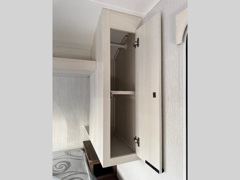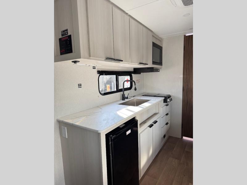 You'll love camping in this travel trailer with bunk beds for your guests or little ones! Once you've unloaded the exterior baggage doors, you can head inside to make lunch on the two-burner cooktop. There is also a microwave oven and a 3.3 cu. ft. 12V refrigerator for perishables. A booth dinette will provide a place to enjoy your meal at, and an additional guest can even sleep here if needed. After a day of exploring outdoors, you can freshen up in the private bath with corner floating shelves and a 30" x 36" shower!