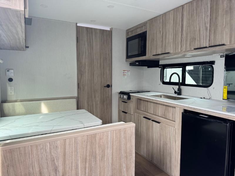 This is the perfect couple's trailer or for those who enjoy solo camping. Once you've unloaded the exterior baggage doors, you can put out the 12' awning, then head inside to make lunch on the two-burner cooktop. There is also a microwave oven and a 3.3 cu. ft. 12V refrigerator for perishables. A booth dinette will provide a place to enjoy your meal at, and an additional guest can sleep here if need be. After a day of exploring outdoors, you can freshen up in the full rear bath that includes a 30" x 36" shower with a skylight and a linen closet for clean towels!