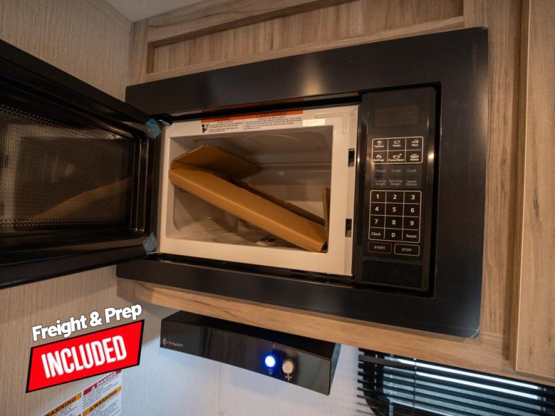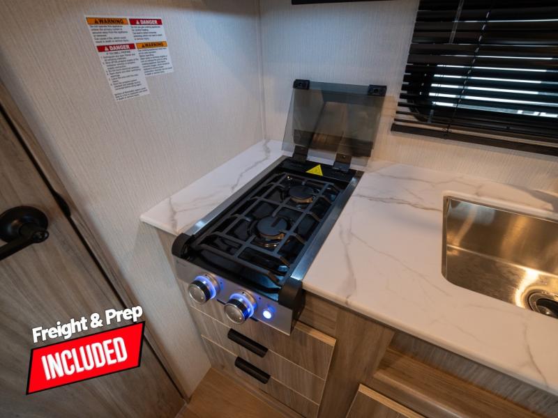 This is the perfect couple's trailer or for those who enjoy solo camping. Once you've unloaded the exterior baggage doors, you can put out the 12' awning, then head inside to make lunch on the two-burner cooktop. There is also a microwave oven and a 3.3 cu. ft. 12V refrigerator for perishables. A booth dinette will provide a place to enjoy your meal at, and an additional guest can sleep here if need be. After a day of exploring outdoors, you can freshen up in the full rear bath that includes a 30" x 36" shower with a skylight and a linen closet for clean towels!