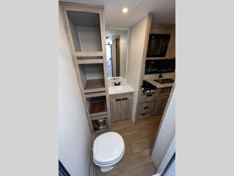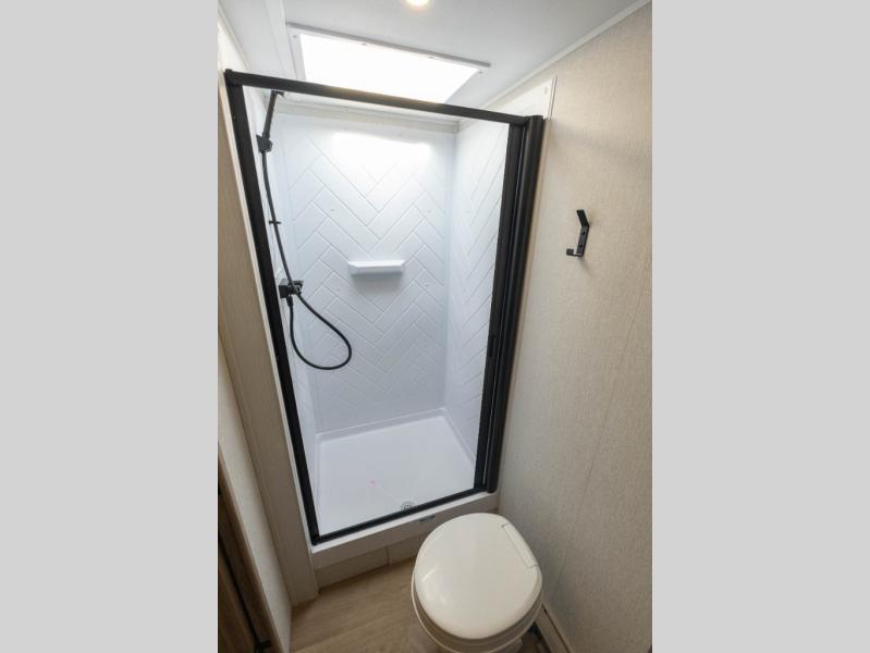This is the perfect couple's trailer or for those who enjoy solo camping. Once you've unloaded the exterior baggage doors, you can put out the 12' power awning, then head inside to make lunch on the two-burner cooktop. There is also a microwave oven and a 3.3 cu. ft. 12V refrigerator for perishables. A booth dinette will provide a place to enjoy your meal at, and an additional guest can sleep here if need be. After a day of exploring outdoors, you can freshen up in the full rear bath that includes a 30" x 36" shower with a skylight and a linen closet for clean towels!