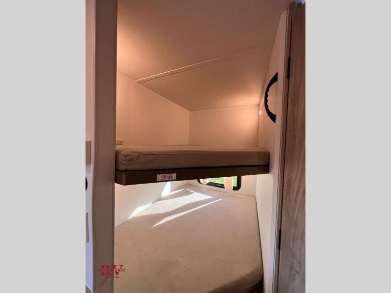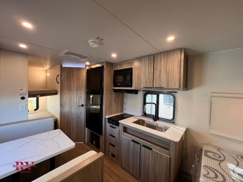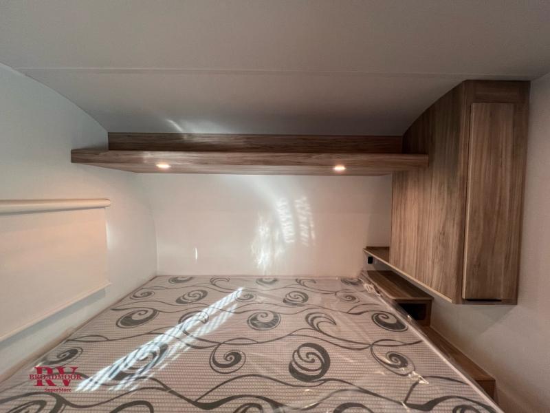 This travel trailer is designed to make camping more comfortable, affordable, and fun for the whole family! The front 60" x 80" queen bed offers a comfortable place to lay your head at night and a shirt closet to hang your clothes. There are a set of 48" x 68" bunk beds for others to sleep, and you can even transform the 38" x 68" booth dinette into extra sleeping space. The fully equipped kitchen has everything you need to prepare a delicious home cooked meal and a 12V refrigerator to store any leftovers. After a fun-filled day, head to the rear corner bathroom to freshen up in the 30" x 36" shower with a skylight to let in some natural lighting!