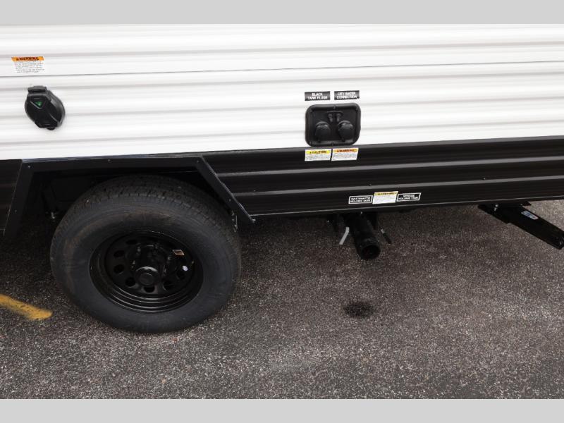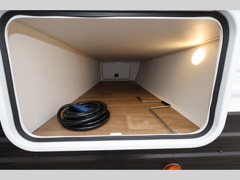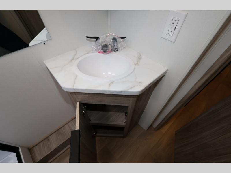 This travel trailer is designed to make camping more comfortable, affordable, and fun for the whole family! The front 60" x 80" queen bed offers a comfortable place to lay your head at night and a shirt closet to hang your clothes. There are a set of 48" x 68" bunk beds for others to sleep, and you can even transform the 38" x 68" booth dinette into extra sleeping space. The fully equipped kitchen has everything you need to prepare a delicious home cooked meal and a 12V refrigerator to store any leftovers. After a fun-filled day, head to the rear corner bathroom to freshen up in the 30" x 36" shower with a skylight to let in some natural lighting!