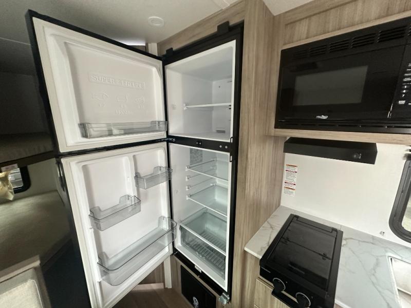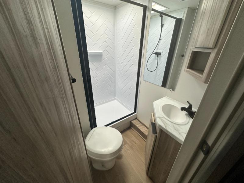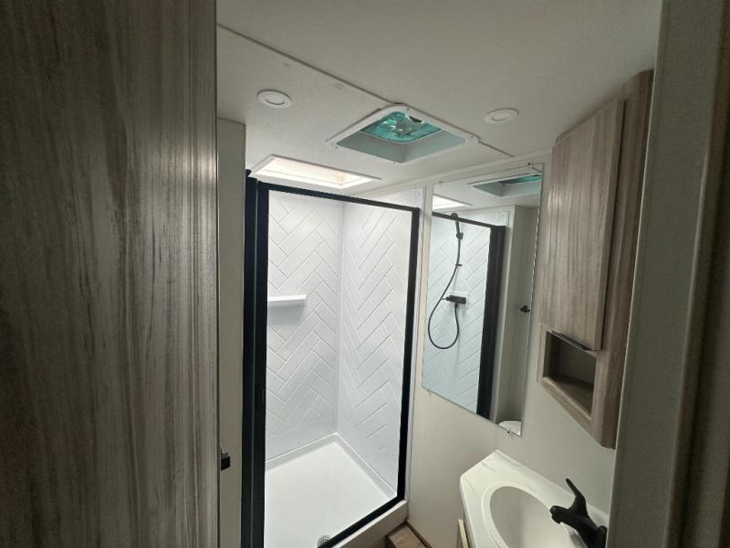 This travel trailer is designed to make camping more comfortable, affordable, and fun for the whole family! The front 60" x 80" queen bed offers a comfortable place to lay your head at night and a shirt closet to hang your clothes. There are a set of 48" x 68" bunk beds for others to sleep, and you can even transform the 38" x 68" booth dinette into extra sleeping space. The fully equipped kitchen has everything you need to prepare a delicious home cooked meal and a 12V refrigerator to store any leftovers. After a fun-filled day, head to the rear corner bathroom to freshen up in the 30" x 36" shower with 14" x 22" skylight to let in some natural lighting!