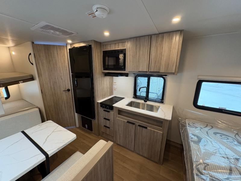 This travel trailer is designed to make camping more comfortable, affordable, and fun for the whole family! The front 60" x 80" queen bed offers a comfortable place to lay your head at night and a shirt closet to hang your clothes. There are a set of 48" x 68" bunk beds for others to sleep, and you can even transform the 38" x 68" booth dinette into extra sleeping space. The fully equipped kitchen has everything you need to prepare a delicious home cooked meal and a 12V refrigerator to store any leftovers. After a fun-filled day, head to the rear corner bathroom to freshen up in the 30" x 36" shower with a skylight to let in some natural lighting!