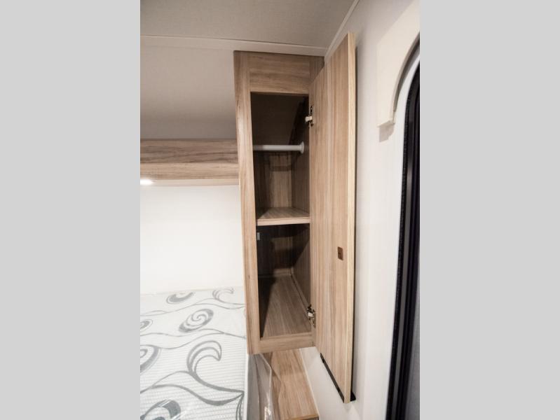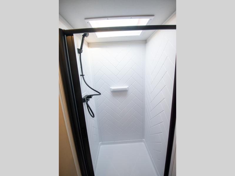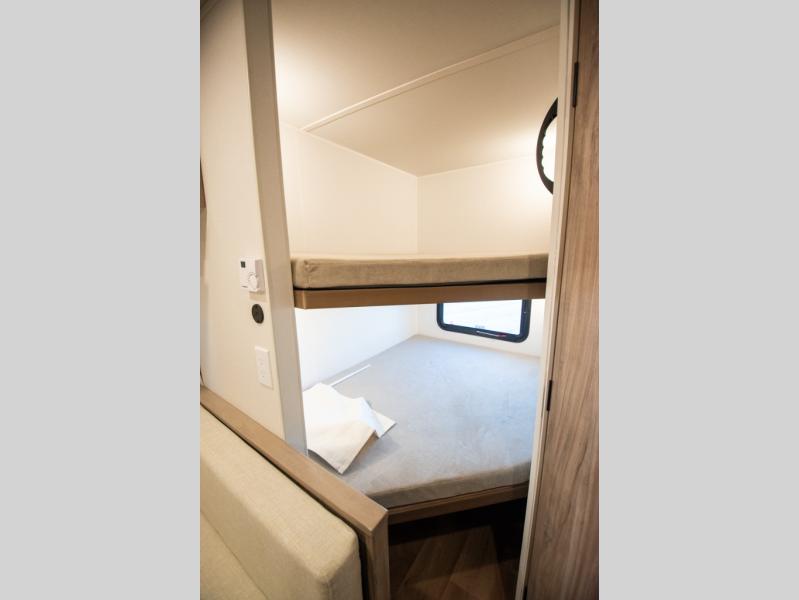 This travel trailer is designed to make camping more comfortable, affordable, and fun for the whole family! The front 60" x 80" queen bed offers a comfortable place to lay your head at night and a shirt closet to hang your clothes. There are a set of 48" x 68" bunk beds for others to sleep, and you can even transform the 38" x 68" booth dinette into extra sleeping space. The fully equipped kitchen has everything you need to prepare a delicious home cooked meal and a 12V refrigerator to store any leftovers. After a fun-filled day, head to the rear corner bathroom to freshen up in the 30" x 36" shower with a skylight to let in some natural lighting!