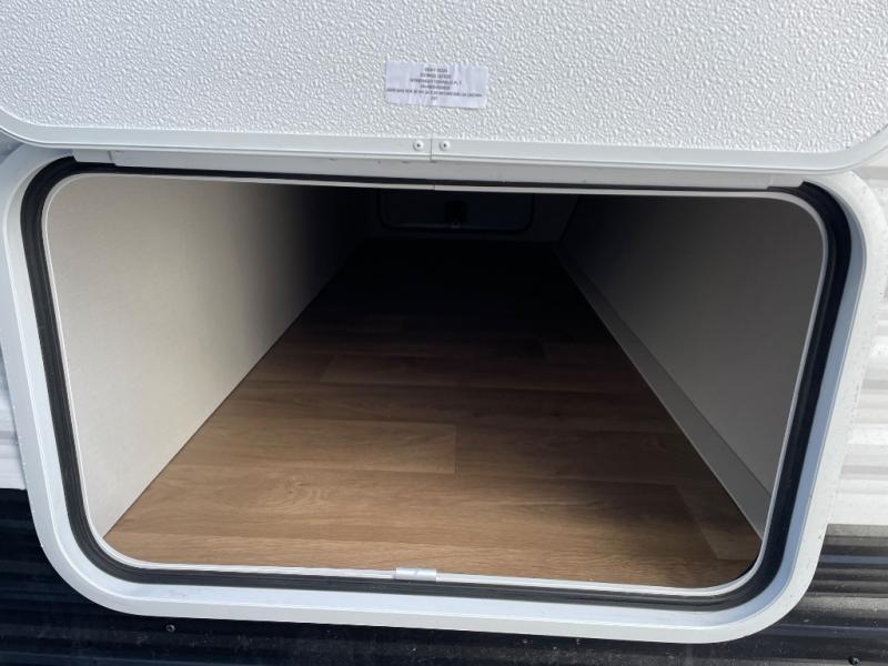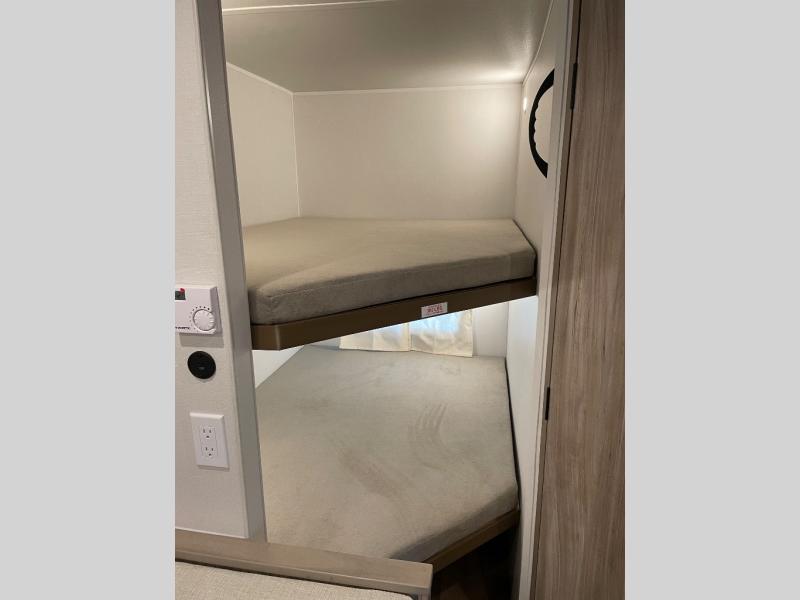 This travel trailer is designed to make camping more comfortable, affordable, and fun for the whole family! The front 60" x 80" queen bed offers a comfortable place to lay your head at night and a shirt closet to hang your clothes. There are a set of 48" x 68" bunk beds for others to sleep, and you can even transform the 38" x 68" booth dinette into extra sleeping space. The fully equipped kitchen has everything you need to prepare a delicious home cooked meal and a 12V refrigerator to store any leftovers. After a fun-filled day, head to the rear corner bathroom to freshen up in the 30" x 36" shower with a skylight to let in some natural lighting!