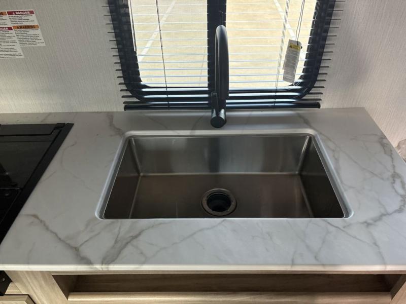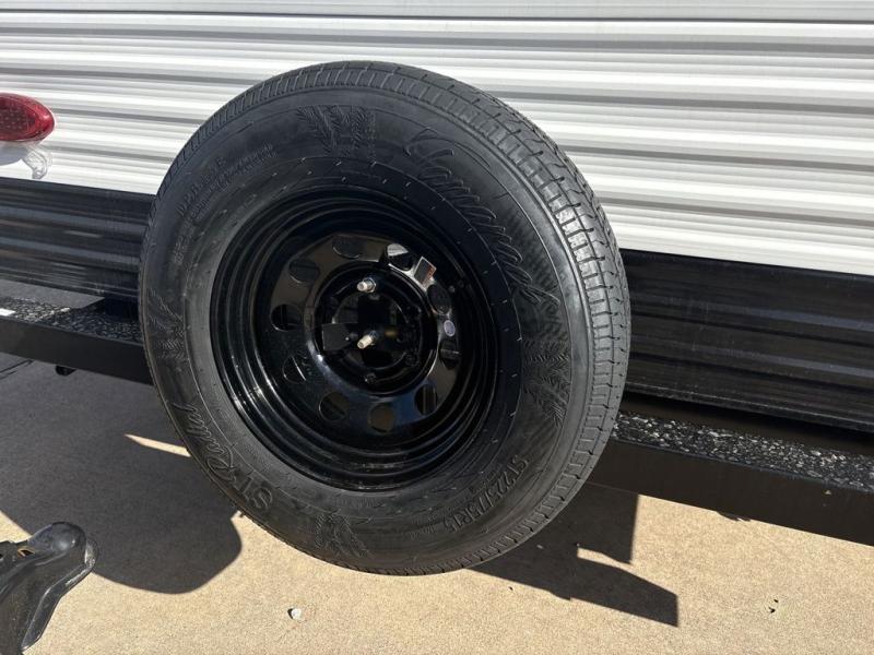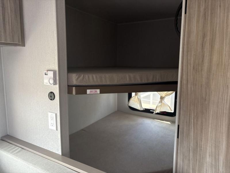 This travel trailer is designed to make camping more comfortable, affordable, and fun for the whole family! The front 60" x 80" queen bed offers a comfortable place to lay your head at night and a shirt closet to hang your clothes. There are a set of 48" x 68" bunk beds for others to sleep, and you can even transform the 38" x 68" booth dinette into extra sleeping space. The fully equipped kitchen has everything you need to prepare a delicious home cooked meal and a 12V refrigerator to store any leftovers. After a fun-filled day, head to the rear corner bathroom to freshen up in the 30" x 36" shower with a skylight to let in some natural lighting!
