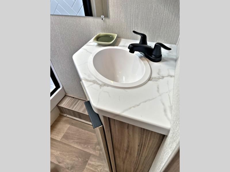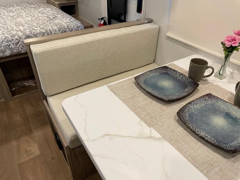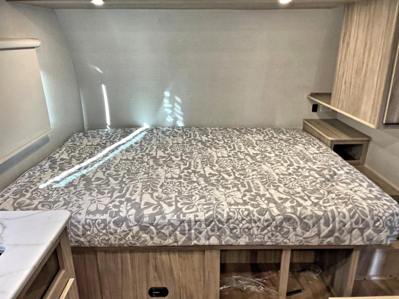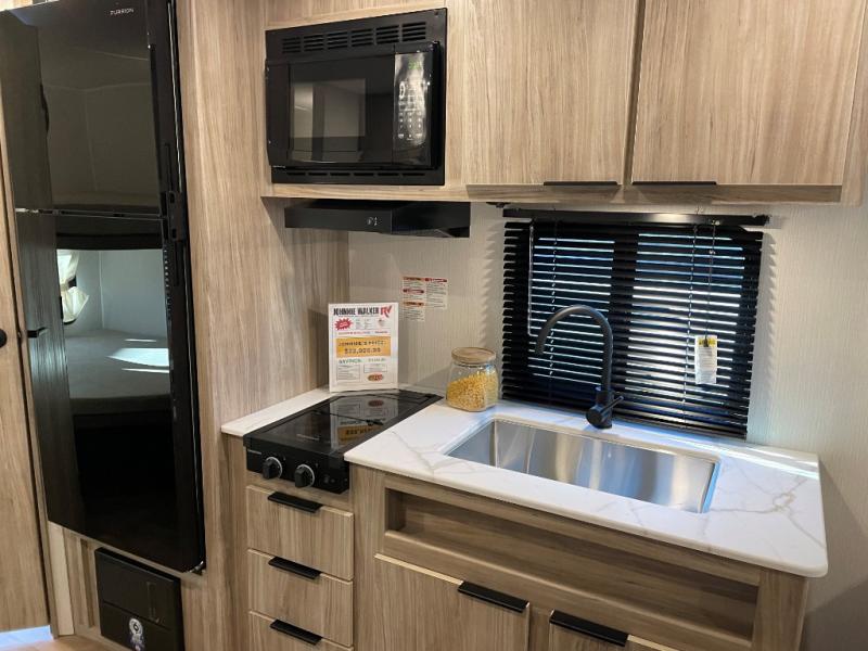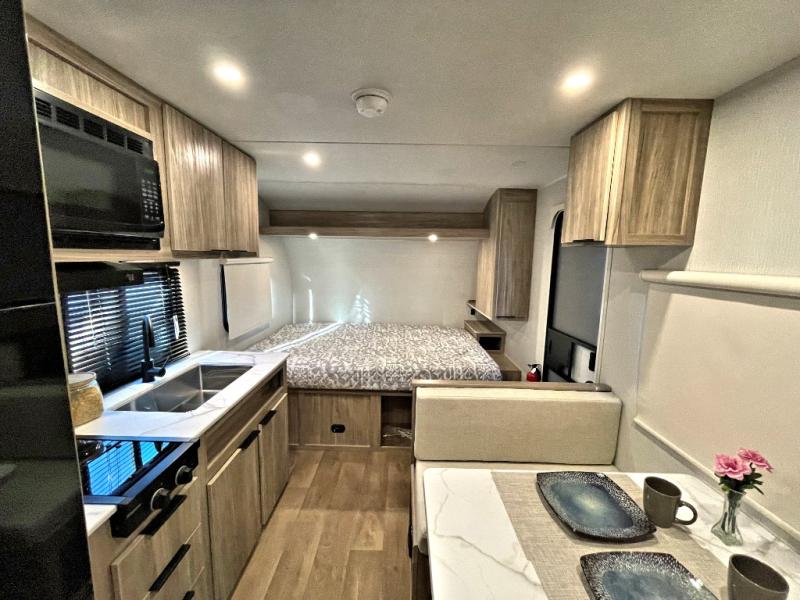 This travel trailer is designed to make camping more comfortable, affordable, and fun for the whole family! The front 60" x 80" queen bed offers a comfortable place to lay your head at night and a shirt closet to hang your clothes. There are a set of 48" x 68" bunk beds for others to sleep, and you can even transform the 38" x 68" booth dinette into extra sleeping space. The fully equipped kitchen has everything you need to prepare a delicious home cooked meal and a 12V refrigerator to store any leftovers. After a fun-filled day, head to the rear corner bathroom to freshen up in the 30" x 36" shower with a skylight to let in some natural lighting!