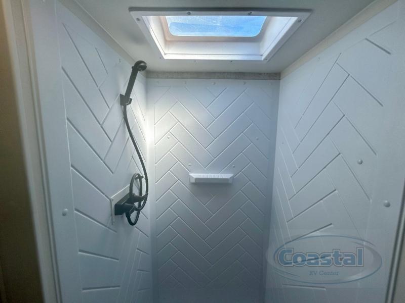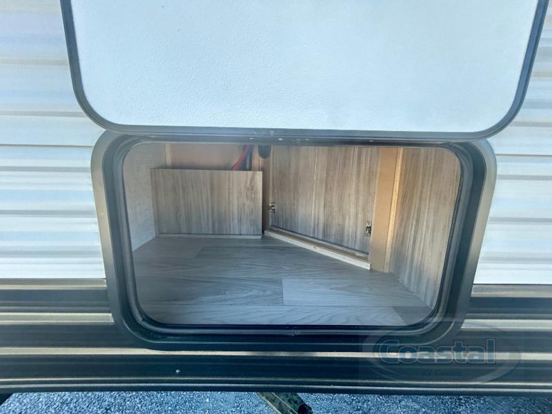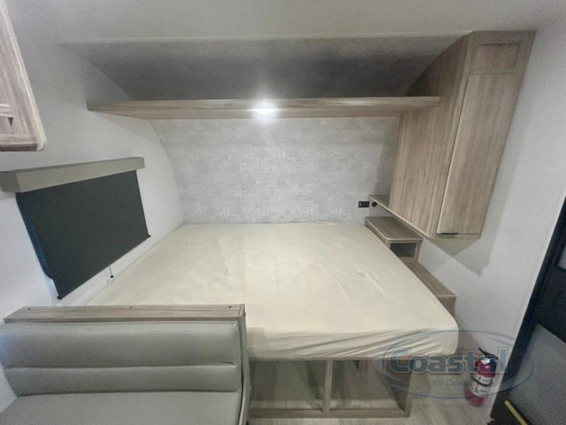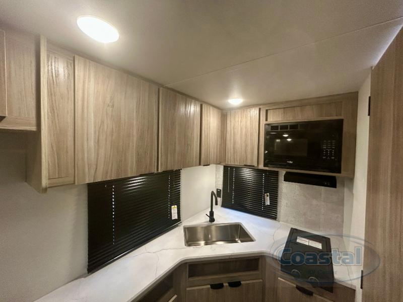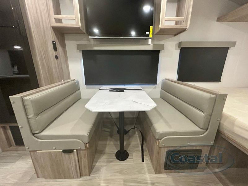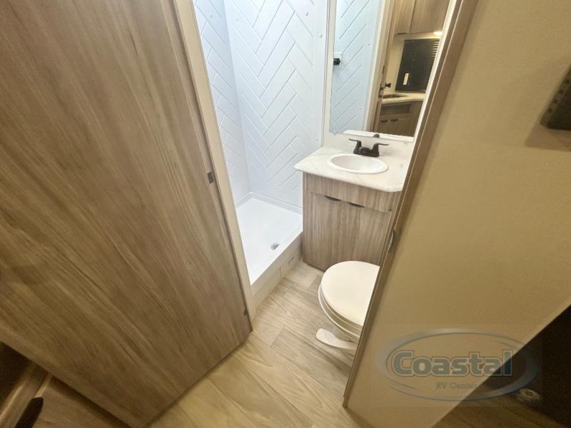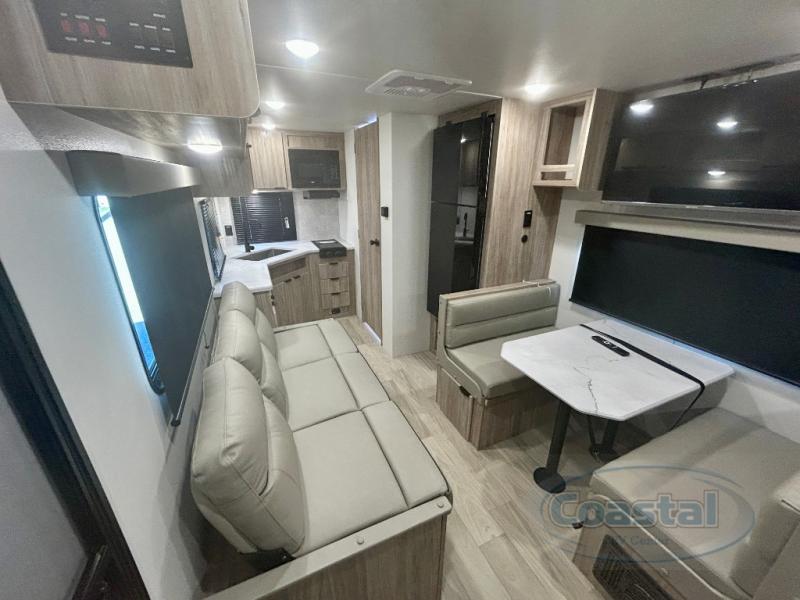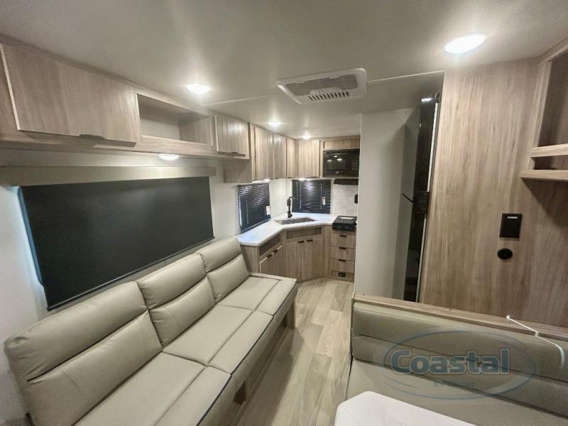 Enjoy generations of fun in this travel trailer! The front 60" x 80" queen bed offers a comfortable place to lay your head at night and a shirt closet to hang your clothes. You can even transform the 64" flip-out sofa and 38" x 68" booth dinette into extra sleeping space. The rear corner kitchen has everything you need to prepare a delicious home cooked meal and a 12V refrigerator to store any leftovers. After a fun-filled day, head to the rear corner bathroom to freshen up in the 30" x 36" shower with 14" x 22" skylight to let in some natural lighting!