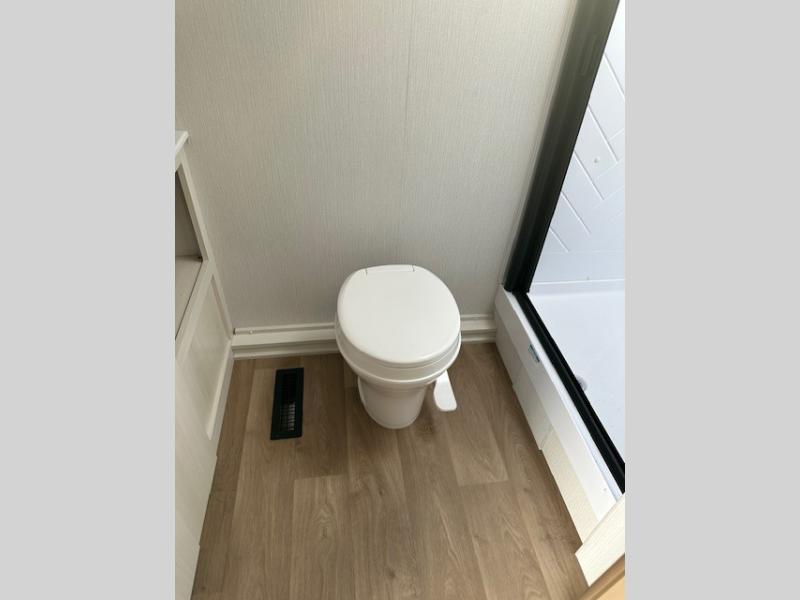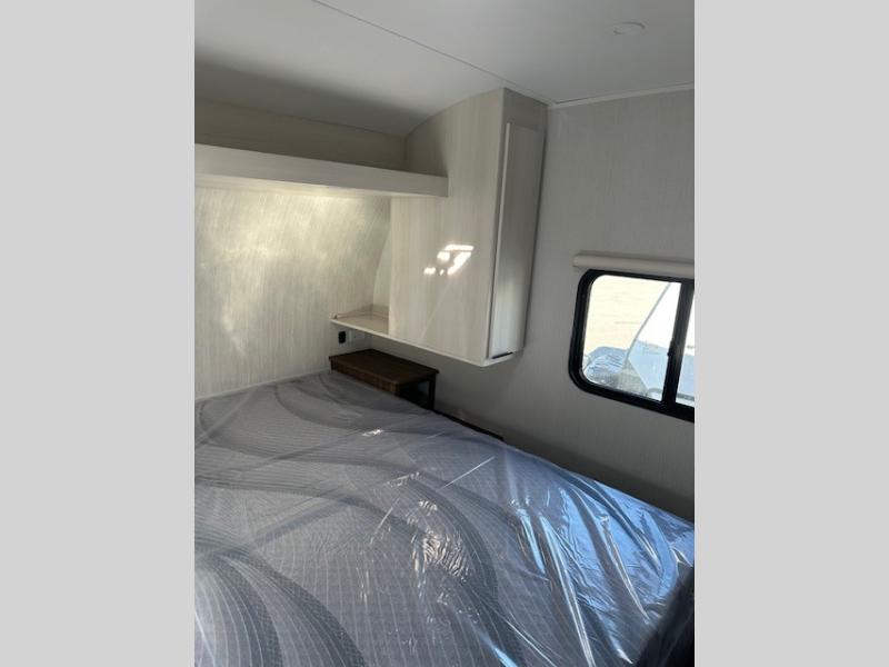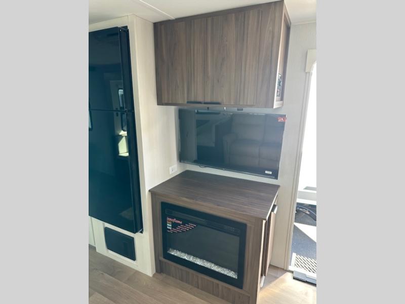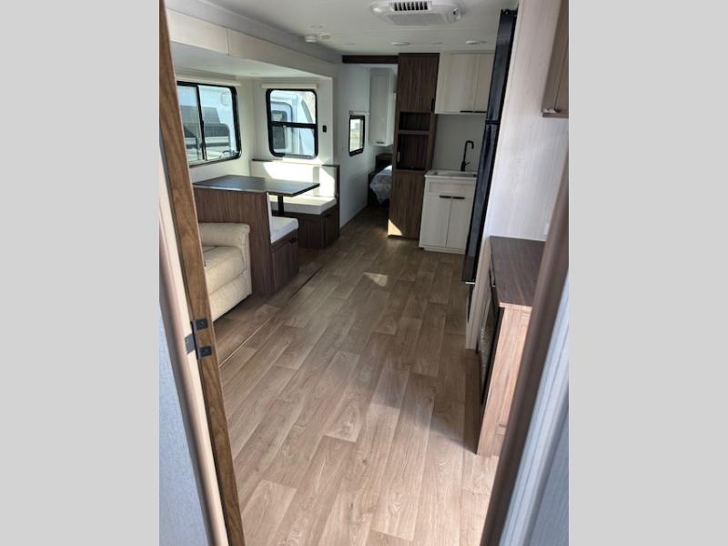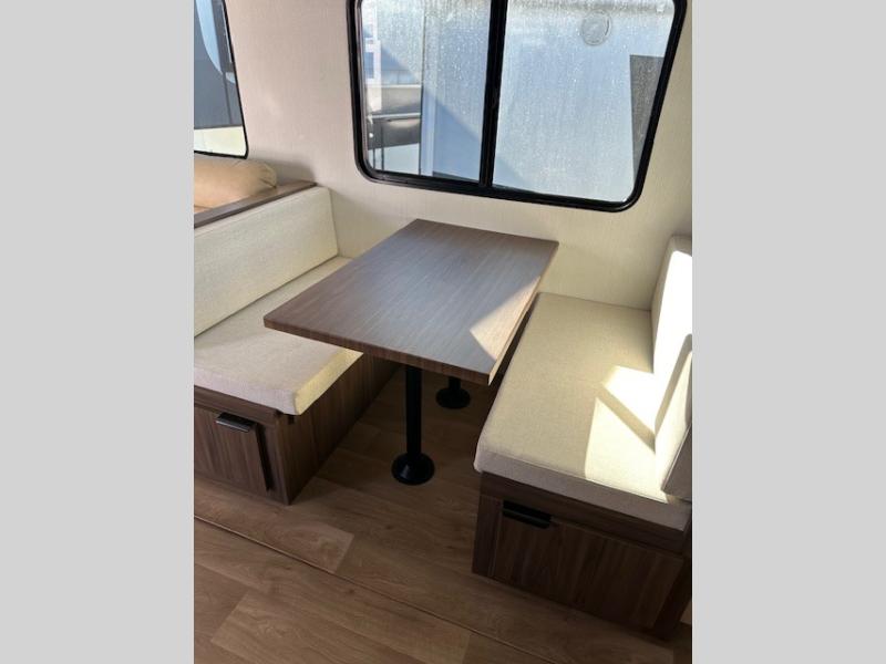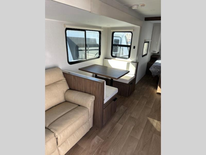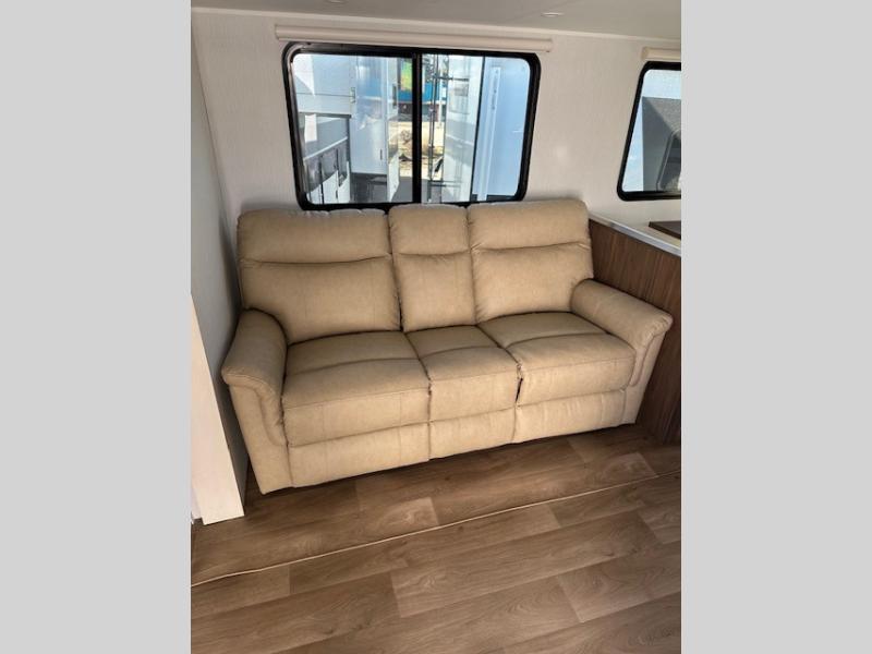 You'll feel right at home when you camp in this travel trailer! The large slide out gives you plenty of space to relax on the theater seating, play games at the booth dinette, and cook in the full kitchen. An adult or two little ones can sleep on the booth dinette at night, and if you're needing additional sleeping space, just choose the optional tri-fold sofa in place of the theater seating. You'll appreciate having the front private bedroom all to yourselves, complete with an Olympic queen bed, dual bedside wardrobes, and underbed storage. And don't overlook the full bath conveniently tucked in the back of the unit for added privacy!