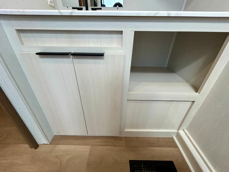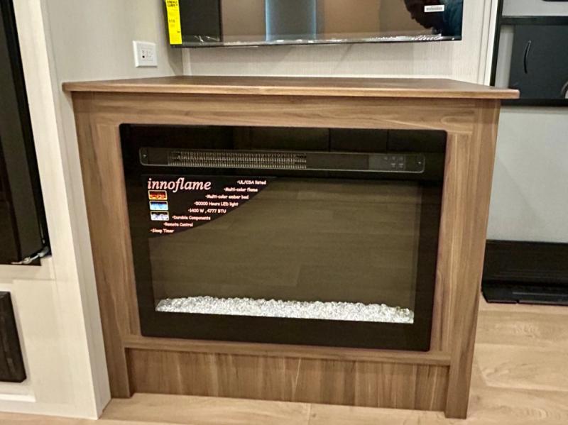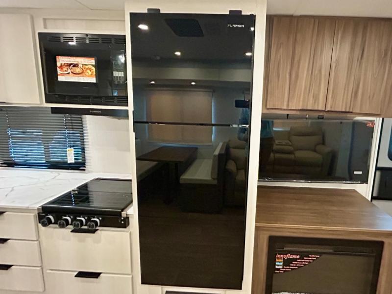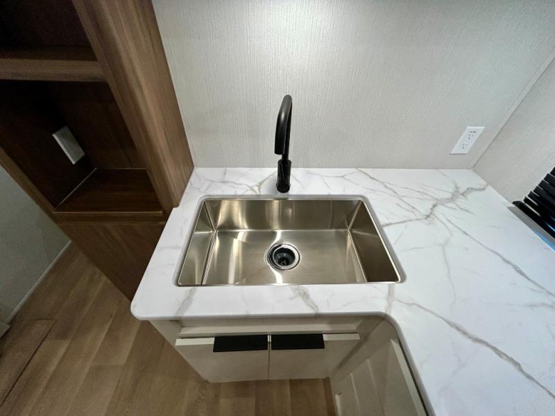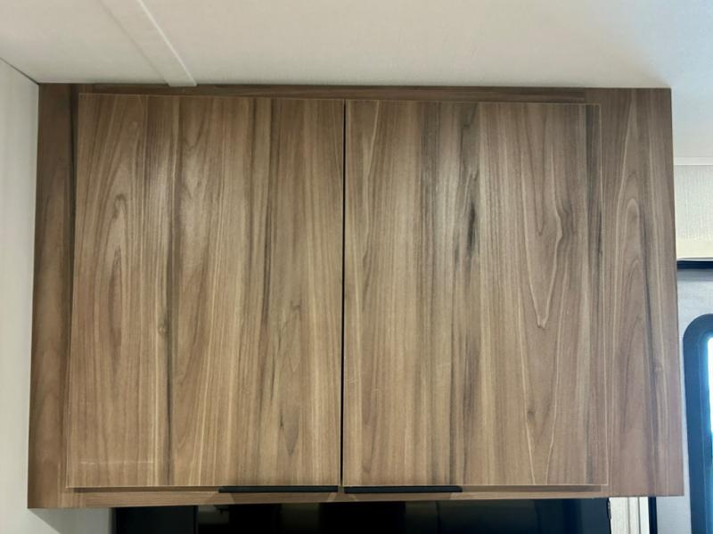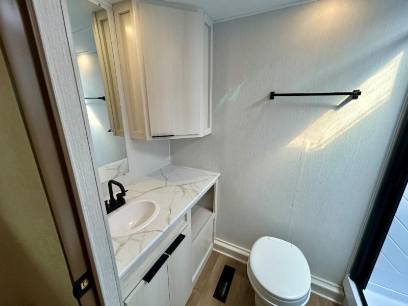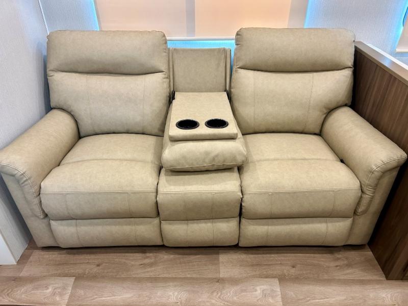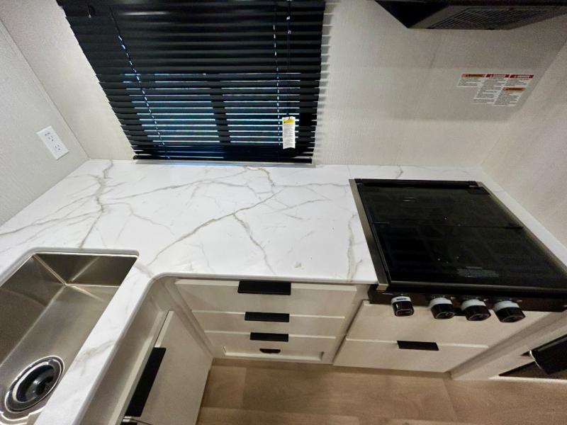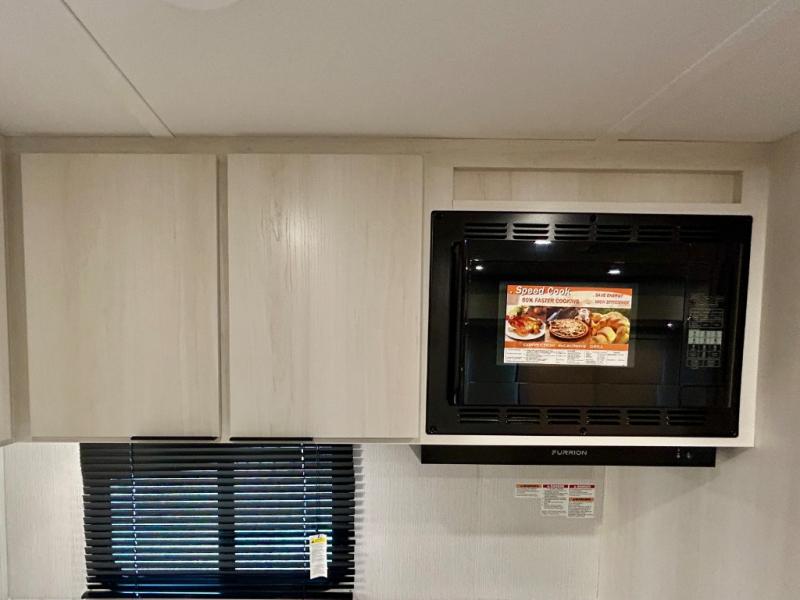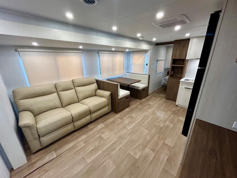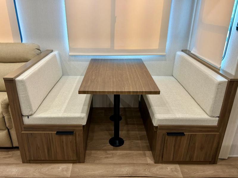You'll feel right at home when you camp in this travel trailer! The large slide out gives you plenty of space to relax on the theater seating, play games at the booth dinette, and cook in the full kitchen. An adult or two little ones can sleep on the booth dinette at night, and if you're needing additional sleeping space, just choose the optional tri-fold sofa in place of the theater seating. You'll appreciate having the front private bedroom all to yourselves, complete with an Olympic queen bed, dual bedside wardrobes, and underbed storage. And don't overlook the full bath conveniently tucked in the back of the unit for added privacy!