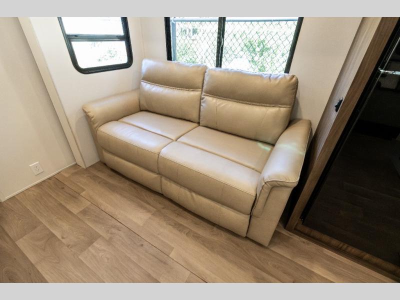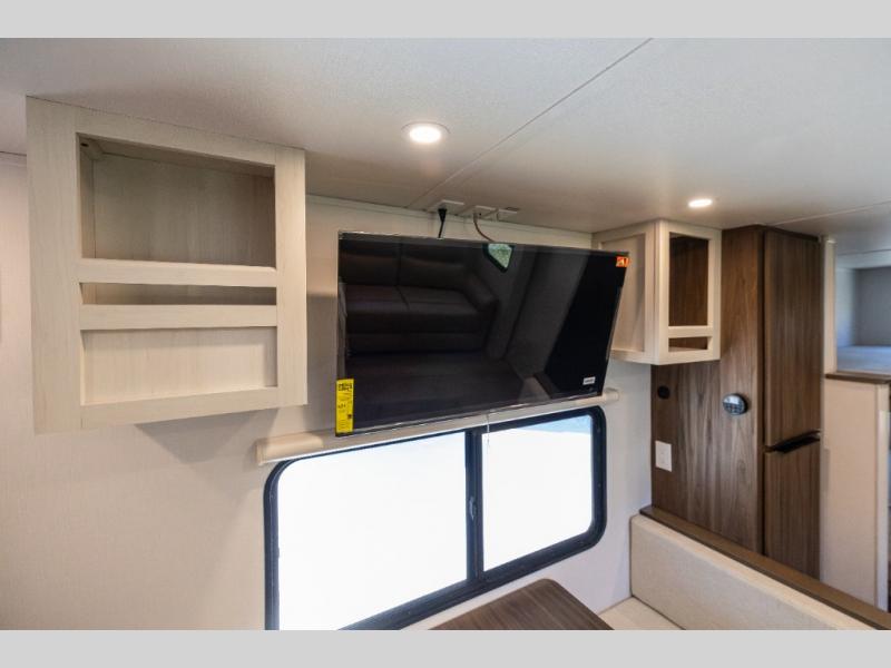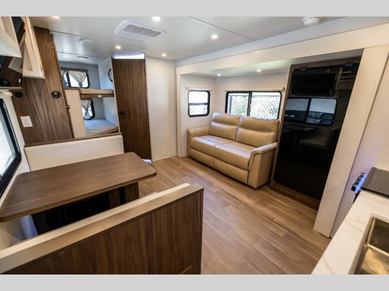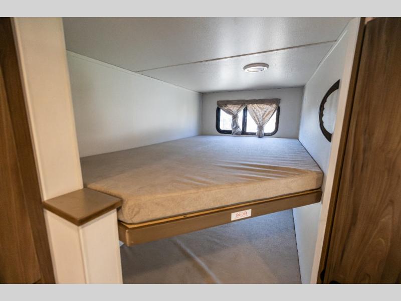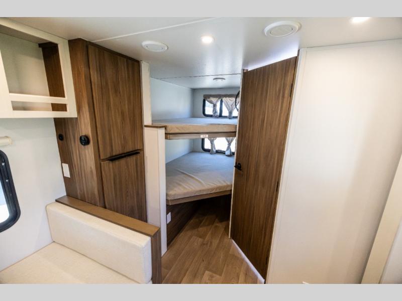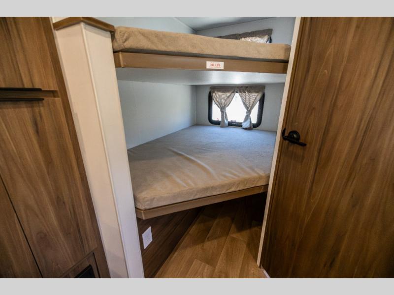 Your family of six will enjoy camping in this Access camper. You will have the choice of cooking both inside and out with the accessible outdoor kitchen featuring a pull-out griddle, 1.6 cu. ft. refrigerator and handy pull-out 11.75" x 20" drawer for cooking utensils, hot pads, etc. On the inside, a three burner cooktop makes whipping up family meals a breeze and there is a 10 cu. ft. refrigerator as well. For sleeping, your family will find comfort in a set of 32" x 74" bunks, a booth dinette that can also be transformed into sleeping for two at night, plus the jackknife sofa and private bedroom which features a queen bed up front. Storage is abundant and can be found throughout in overhead cabinets, bedside wardrobes, and under the queen bed. On the exterior, you will also find a convenient exterior pass through storage compartment for lawn chairs, outdoor games, fishing poles, and more.