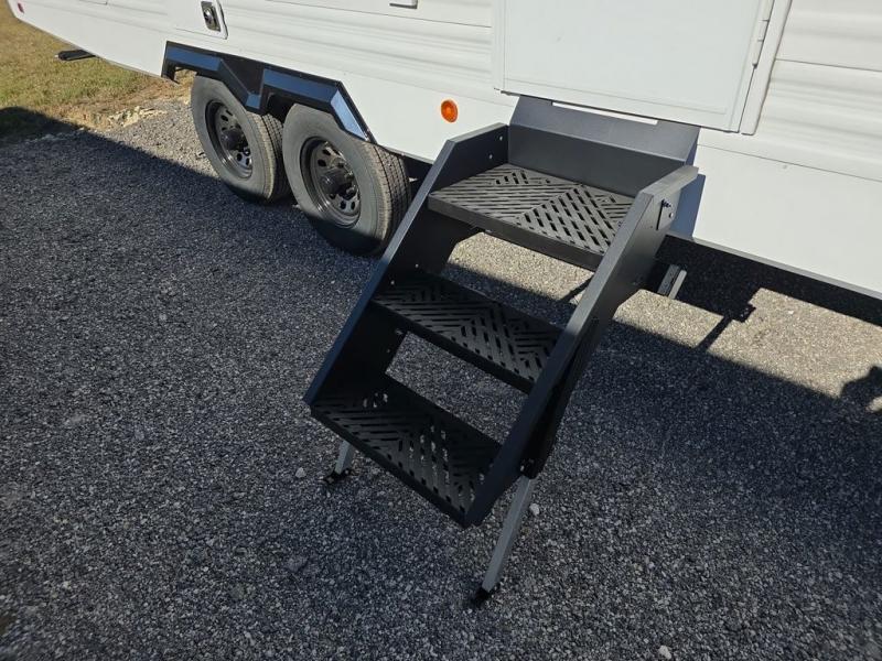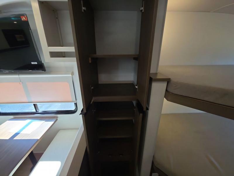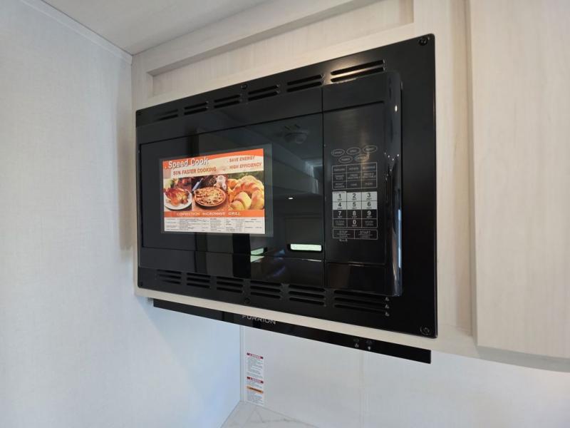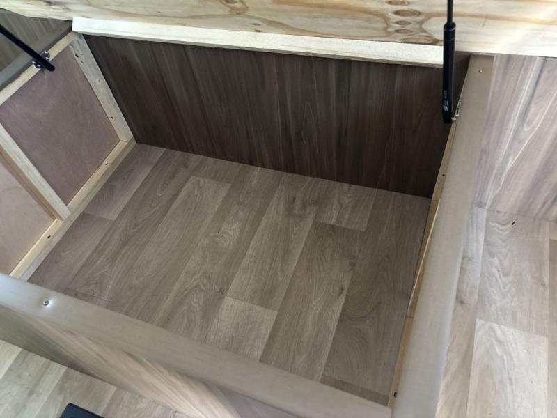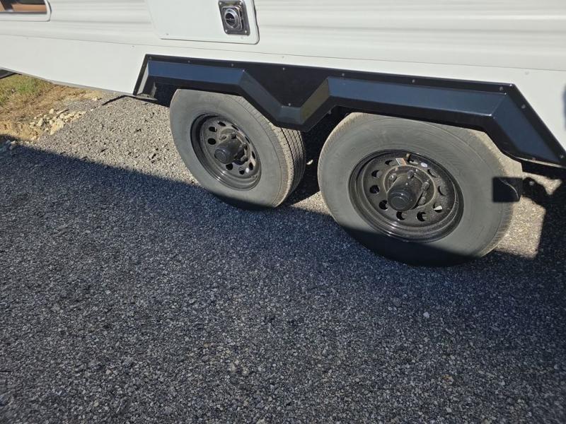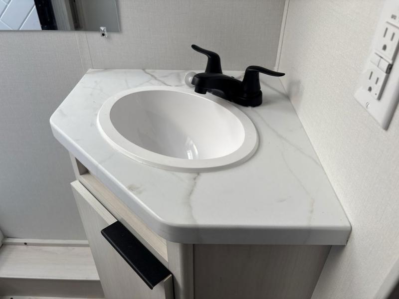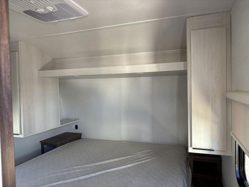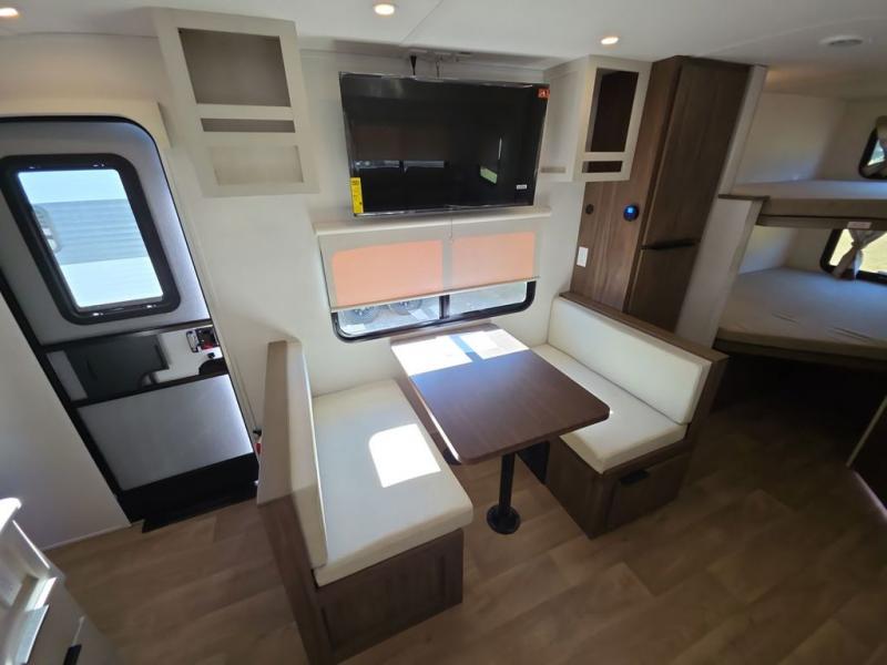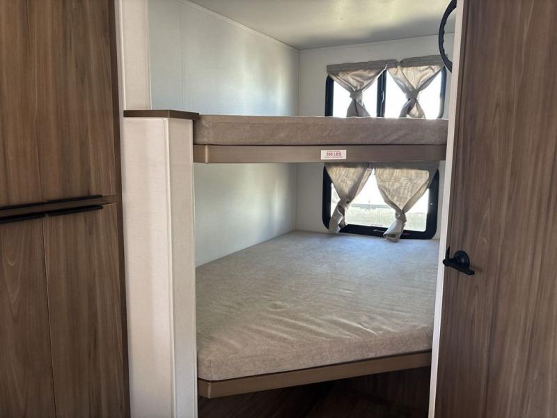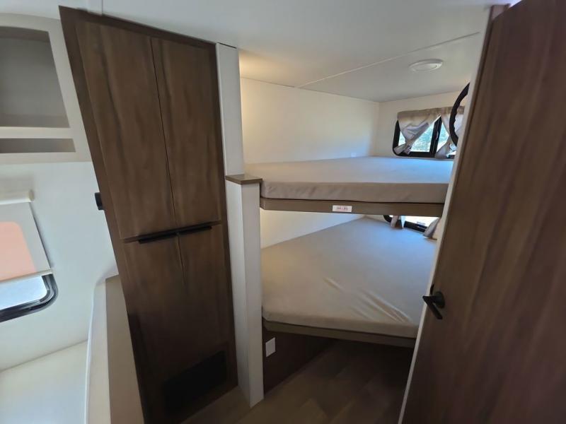 Weekend trips to the campground are made easy in this spacious travel trailer for eight! There is a front private bedroom with a space saving sliding door, a 66" x 80" queen bed, and dual wardrobes to keep your things tidy. The bunks in the back will provide compact sleeping space for guests, and there is a tri-fold sofa slide out and a booth dinette in the combined kitchen and living area for even more accommodations. A wardrobe/pantry is found beside the booth dinette to keep snacks stocked, and an optional TV can be added if you want to enjoy movie nights! The chef of your group is sure to appreciate the flip-up counter for more prep space, along with all the appliances needed to create their best meals.