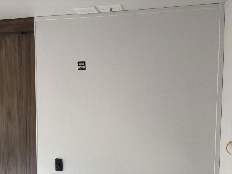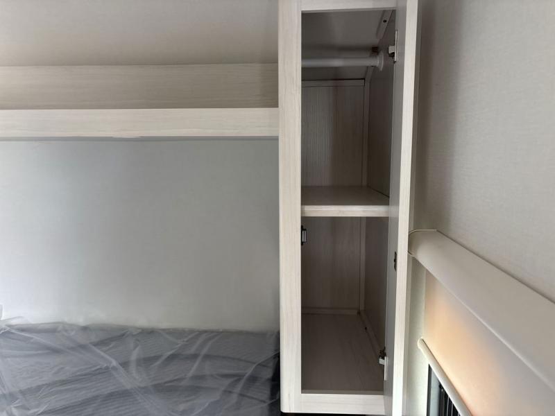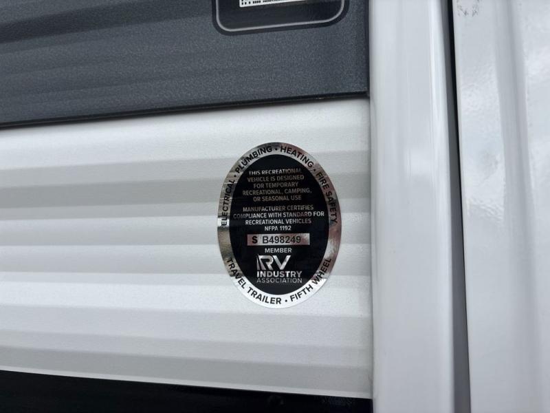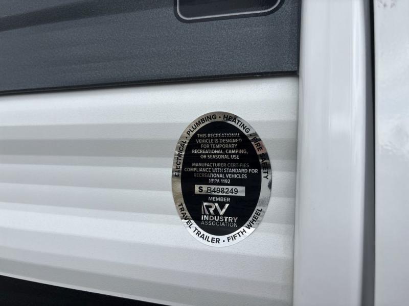 Weekend trips to the campground are made easy in this spacious travel trailer for eight! There is a front private bedroom with a space saving sliding door, a 66" x 80" queen bed, and dual wardrobes to keep your things tidy. The bunks in the back will provide compact sleeping space for guests, and there is a tri-fold sofa slide out and a booth dinette in the combined kitchen and living area for even more accommodations. A wardrobe/pantry is found beside the booth dinette to keep snacks stocked, and an optional TV can be added if you want to enjoy movie nights! The chef of your group is sure to appreciate the flip-up counter for more prep space, along with all the appliances needed to create their best meals.