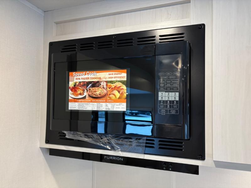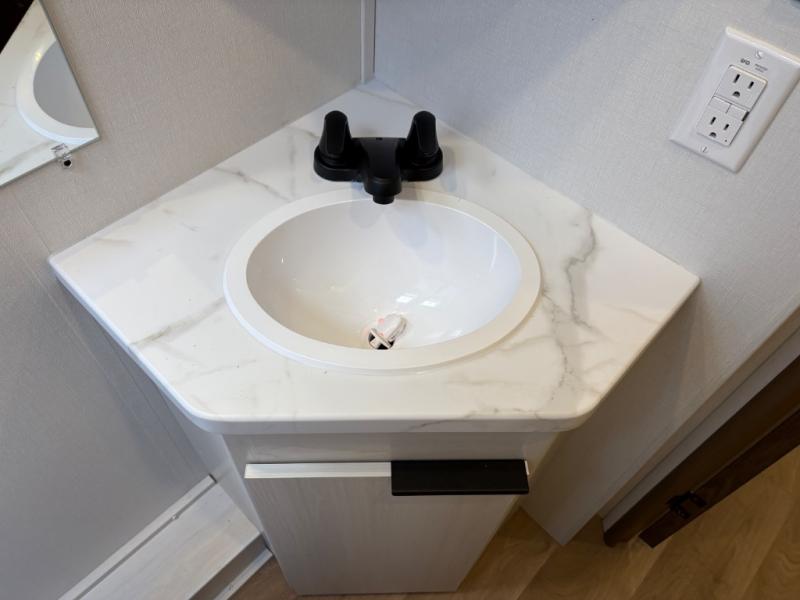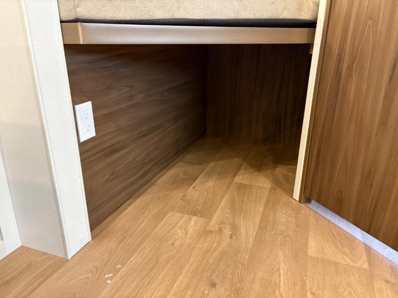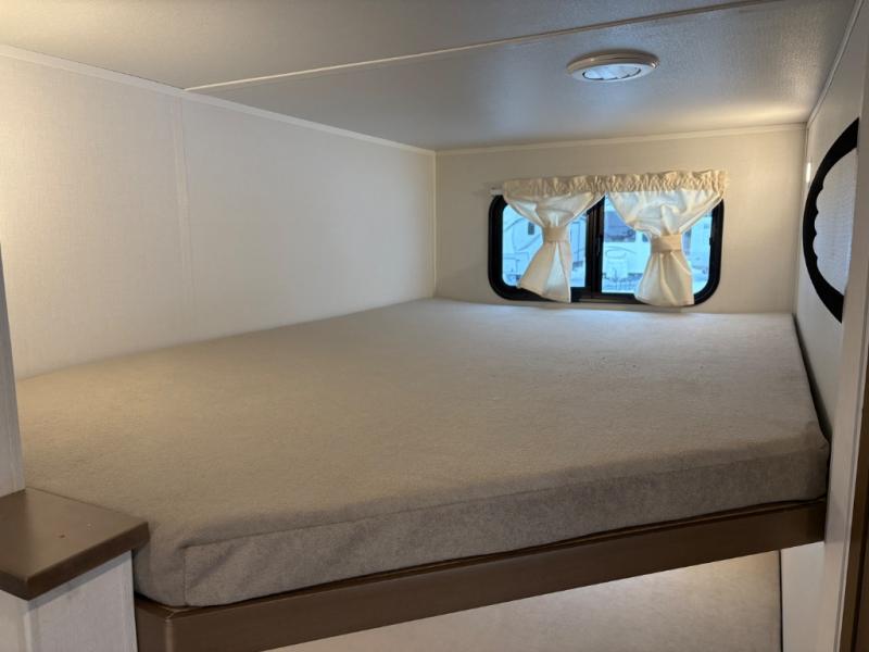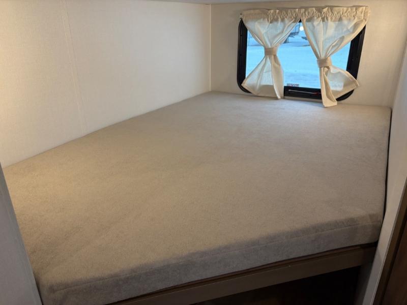 Weekend trips to the campground are made easy in this spacious travel trailer for eight! There is a front private bedroom with a space saving sliding door, a 66" x 80" queen bed, and dual wardrobes to keep your things tidy. The bunks in the back will provide compact sleeping space for guests, and there is a tri-fold sofa slide out and a booth dinette in the combined kitchen and living area for even more accommodations. A wardrobe/pantry is found beside the booth dinette to keep snacks stocked, and an optional TV can be added if you want to enjoy movie nights! The chef of your group is sure to appreciate the flip-up counter for more prep space, along with all the appliances needed to create their best meals.
