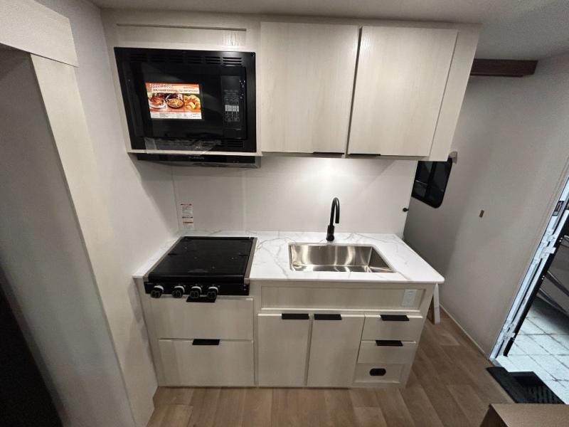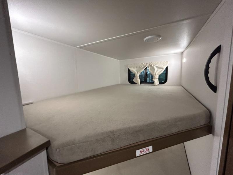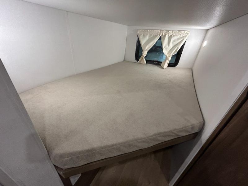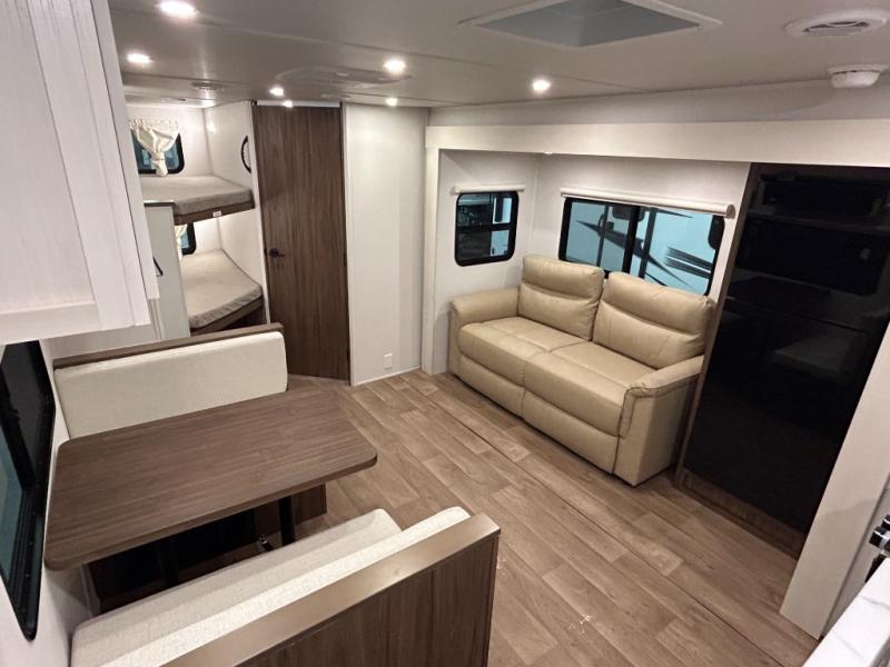 Weekend trips to the campground are made easy in this spacious travel trailer for eight! There is a front private bedroom with a space saving sliding door, a 66" x 80" queen bed, and dual wardrobes to keep your things tidy. The bunks in the back will provide compact sleeping space for guests, and there is a tri-fold sofa slide out and a booth dinette in the combined kitchen and living area for even more accommodations. A wardrobe/pantry is found beside the booth dinette to keep snacks stocked, and an optional TV can be added if you want to enjoy movie nights! The chef of your group is sure to appreciate the flip-up counter for more prep space, along with all the appliances needed to create their best meals.