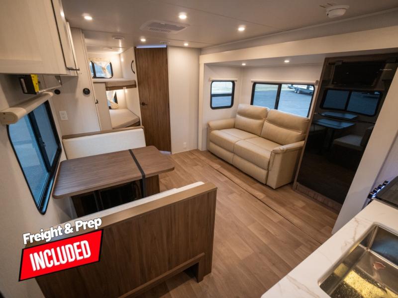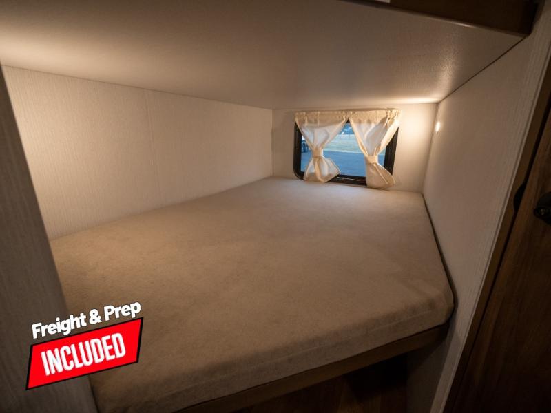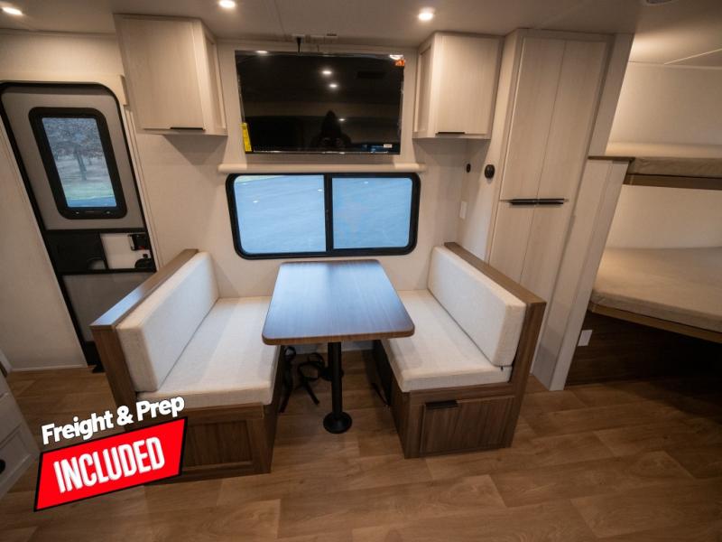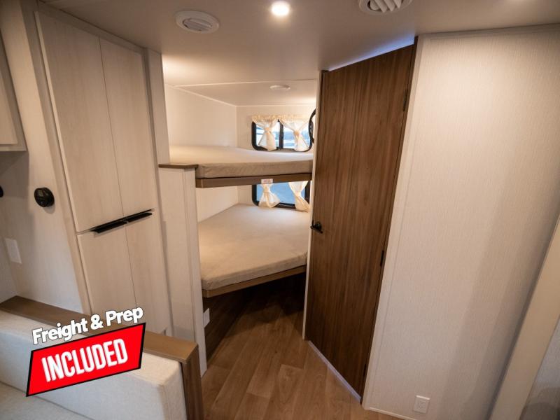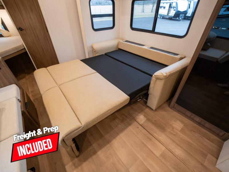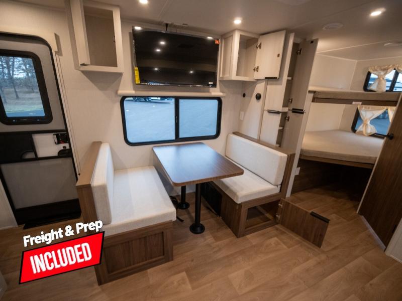 Weekend trips to the campground are made easy in this spacious travel trailer for eight! There is a front private bedroom with a space saving sliding door, a 66" x 80" queen bed, and dual wardrobes to keep your things tidy. The bunks in the back will provide compact sleeping space for guests, and there is a tri-fold sofa slide out and a booth dinette in the combined kitchen and living area for even more accommodations. A wardrobe/pantry is found beside the booth dinette to keep snacks stocked, and an optional TV can be added if you want to enjoy movie nights! The chef of your group is sure to appreciate the flip-up counter for more prep space, along with all the appliances needed to create their best meals.
