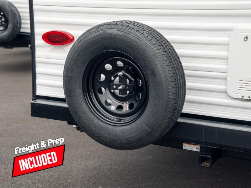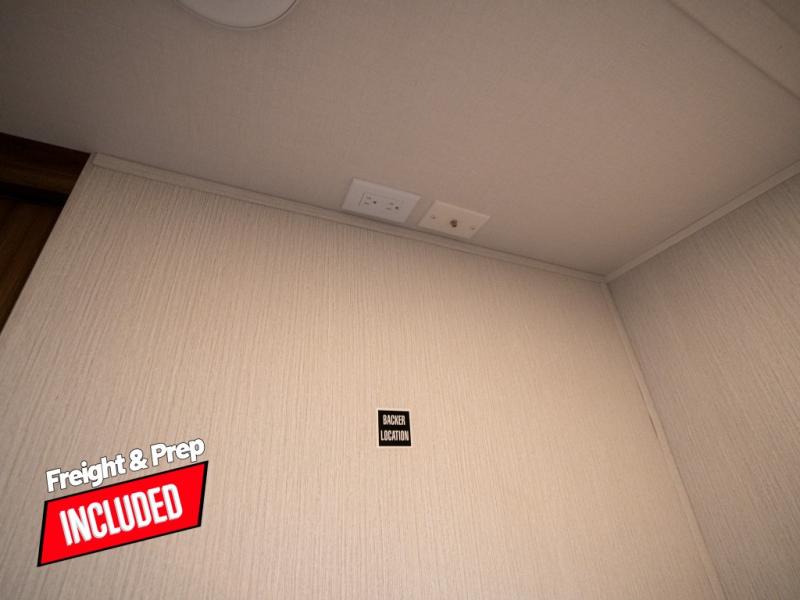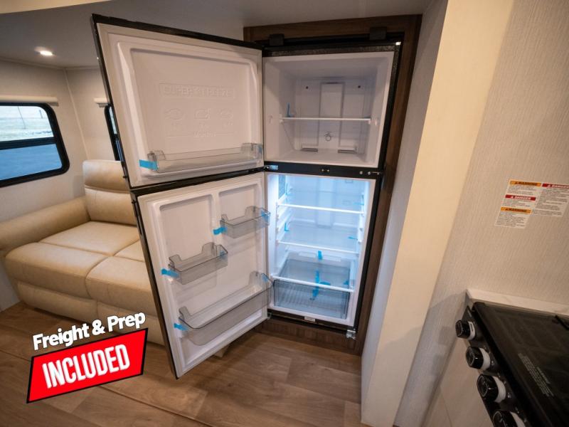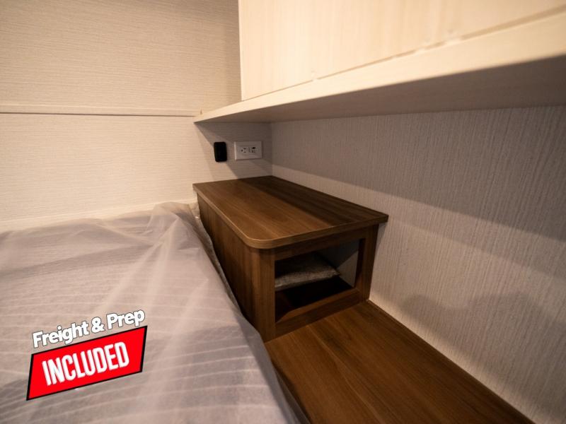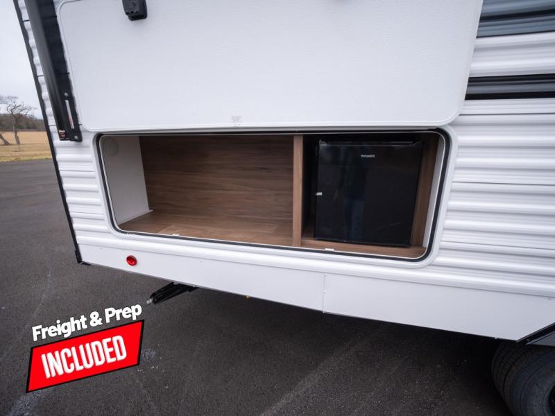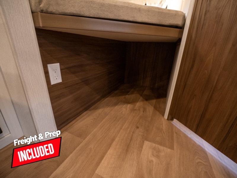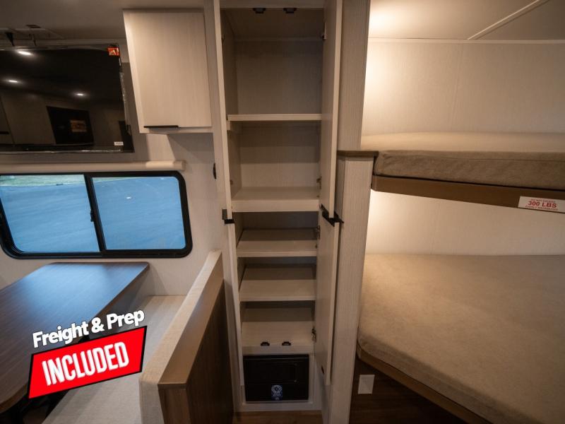 Weekend trips to the campground are made easy in this spacious travel trailer for eight! There is a front private bedroom with a space saving sliding door, a 66" x 80" queen bed, and dual wardrobes to keep your things tidy. The bunks in the back will provide compact sleeping space for guests, and there is a tri-fold sofa slide out and a booth dinette in the combined kitchen and living area for even more accommodations. A wardrobe/pantry is found beside the booth dinette to keep snacks stocked, and an optional TV can be added if you want to enjoy movie nights! The chef of your group is sure to appreciate the flip-up counter for more prep space, along with all the appliances needed to create their best meals.