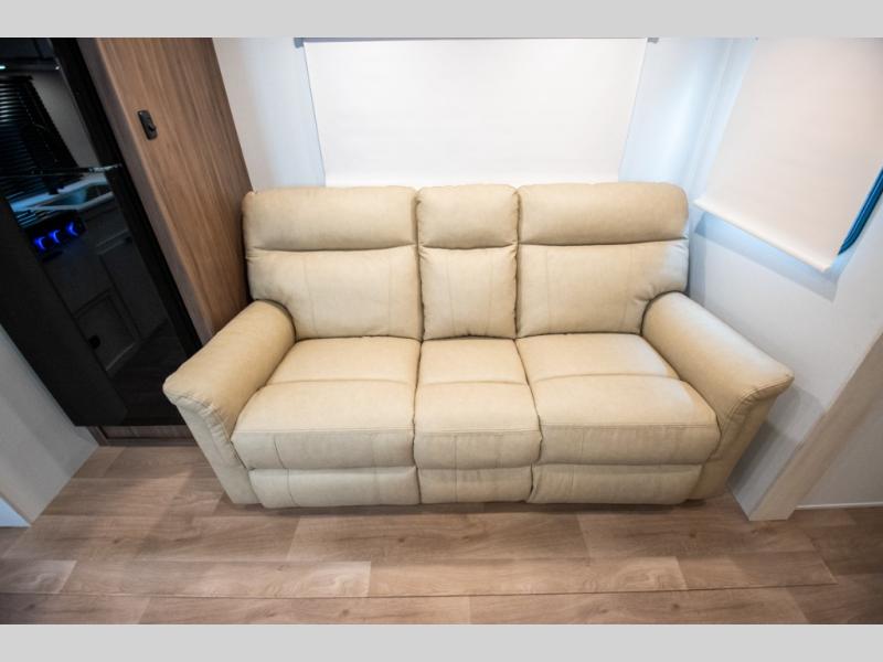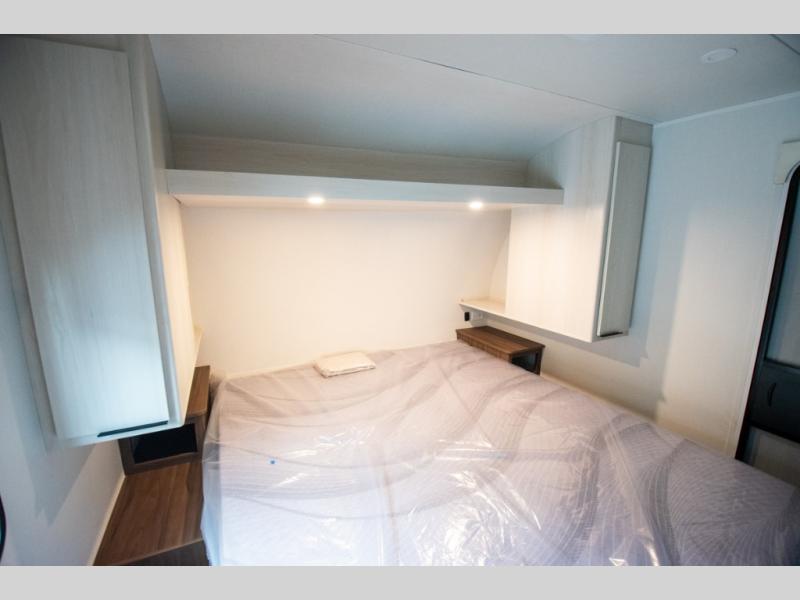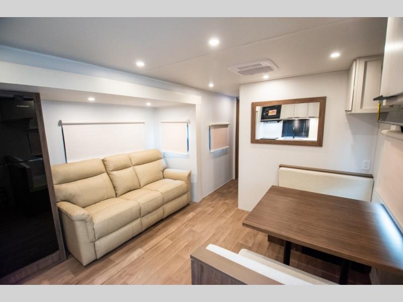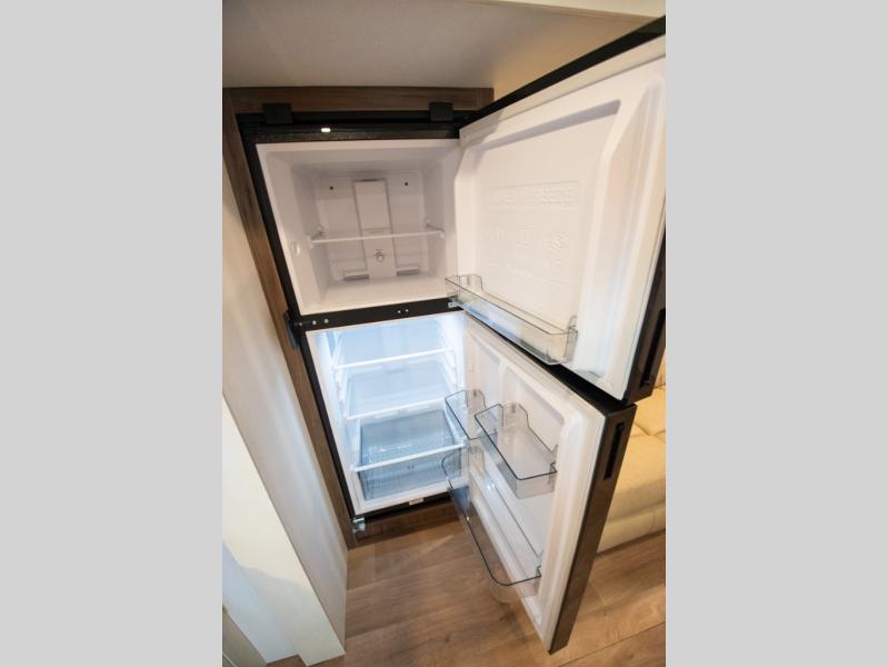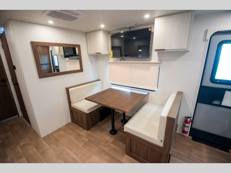 You'll love every minute spent in this spacious travel trailer! With dual entry doors, you can enter in through the rear kitchen or the front private bedroom! There are dual beside wardrobes here and a closet so you can keep your space organized, and the full bath is right next to the bedroom for easy nighttime use. Back to the kitchen, you'll find ample counter space to prep meals, a three-burner cooktop, plus a pantry and 10 cu. ft. 12V refrigerator for food storage. Your crew can dine at the booth dinette, then relax on the tri-fold sofa slide after dinner. And both of these pieces of furniture can double as sleeping space for guests!
