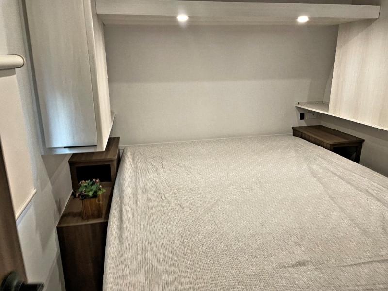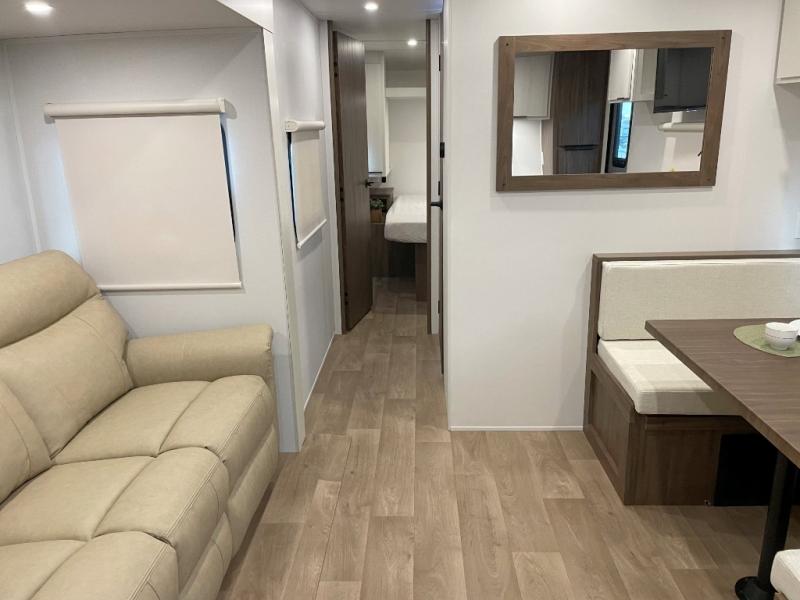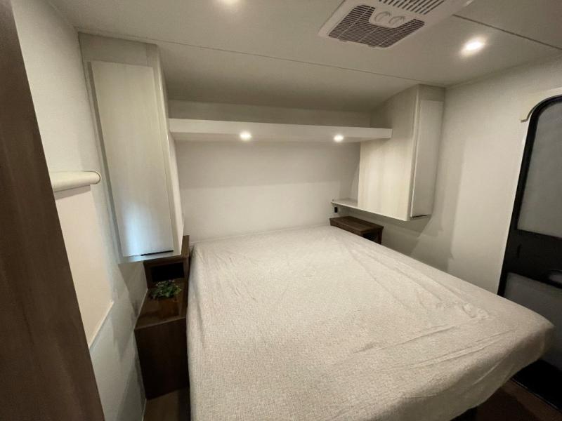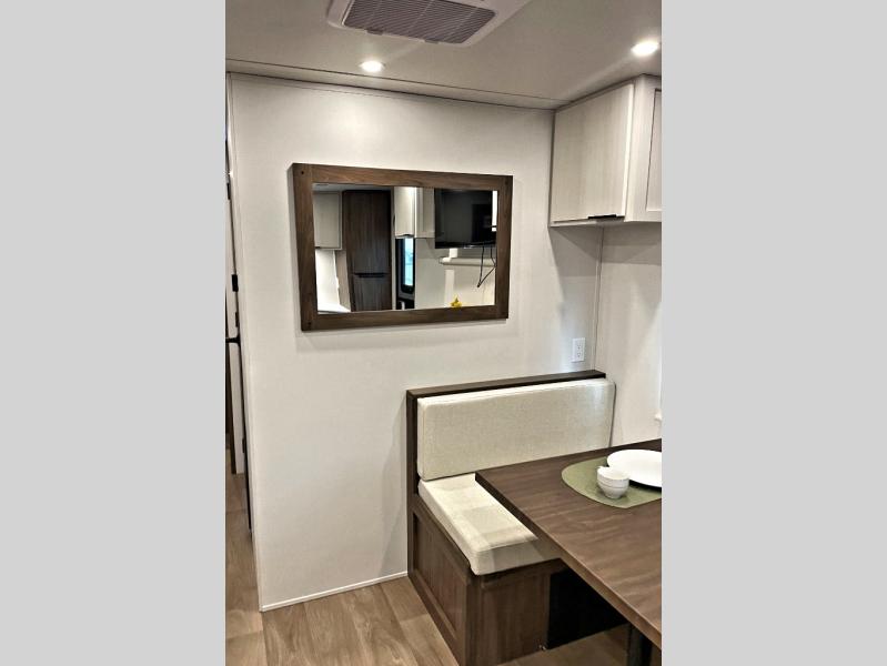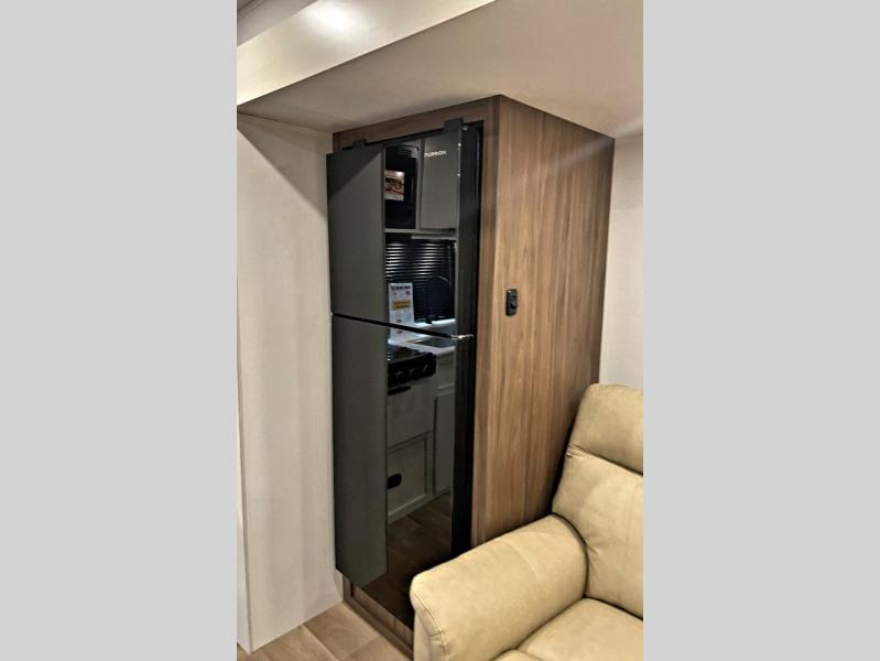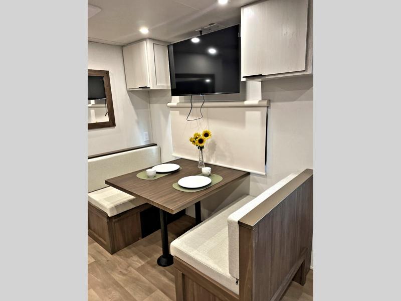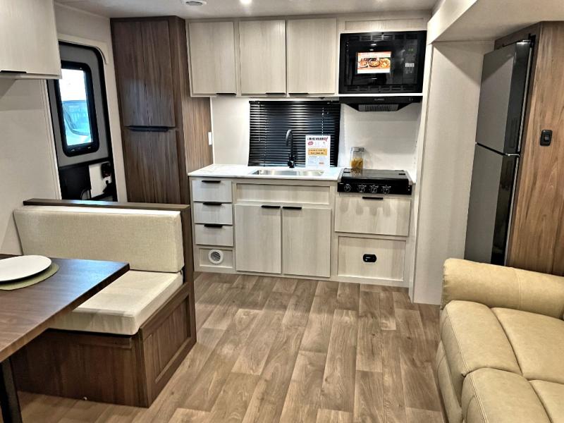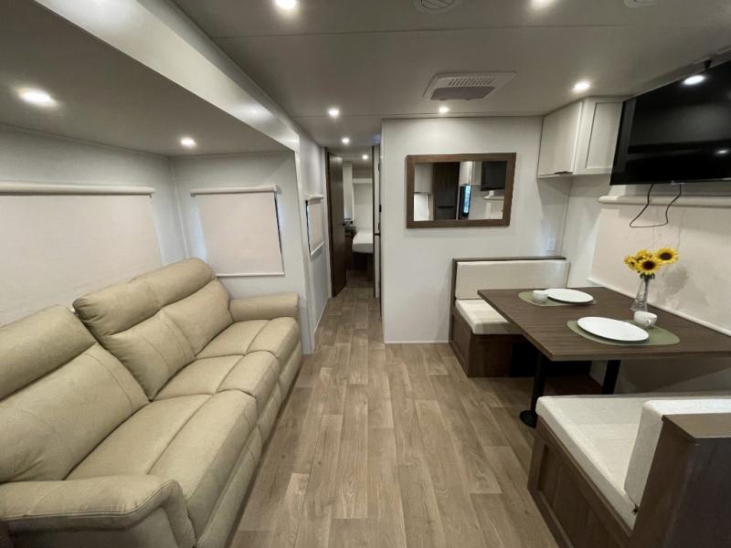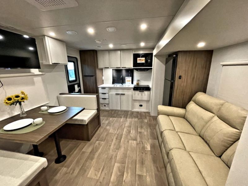 You'll love every minute spent in this spacious travel trailer! With dual entry doors, you can enter in through the rear kitchen or the front private bedroom! There are dual beside wardrobes here and a closet so you can keep your space organized, and the full bath is right next to the bedroom for easy nighttime use. Back to the kitchen, you'll find ample counter space to prep meals, a three-burner cooktop, plus a pantry and 10 cu. ft. 12V refrigerator for food storage. Your crew can dine at the booth dinette, then relax on the tri-fold sofa slide after dinner. And both of these pieces of furniture can double as sleeping space for guests!