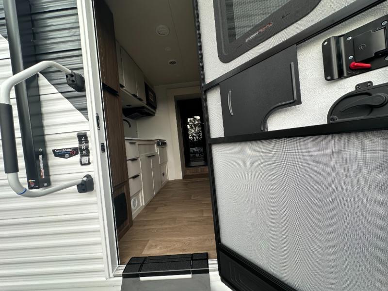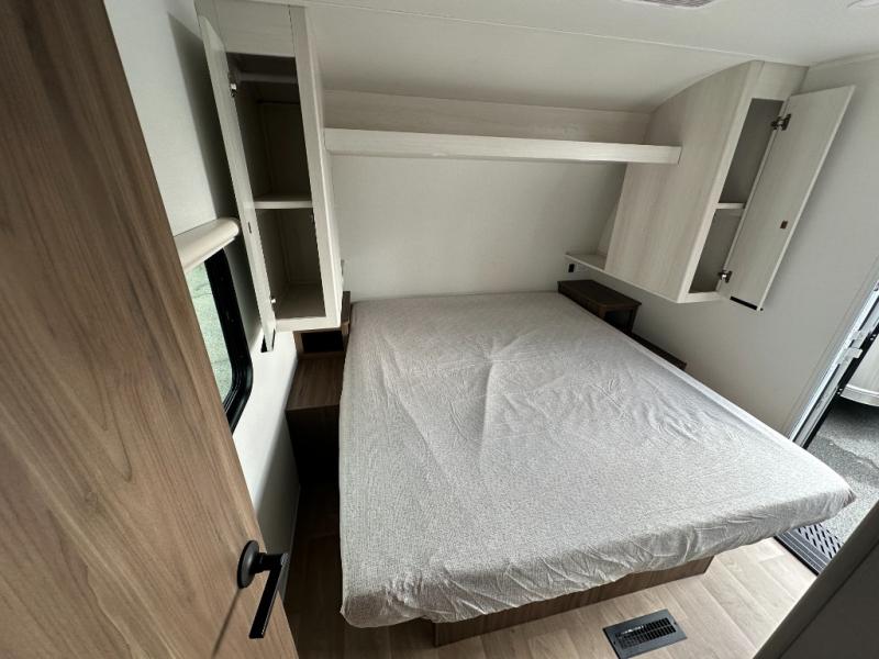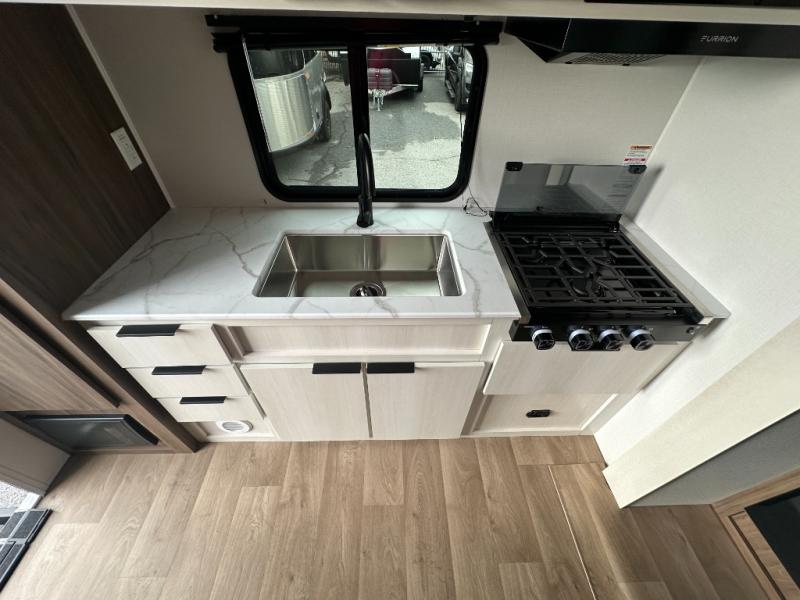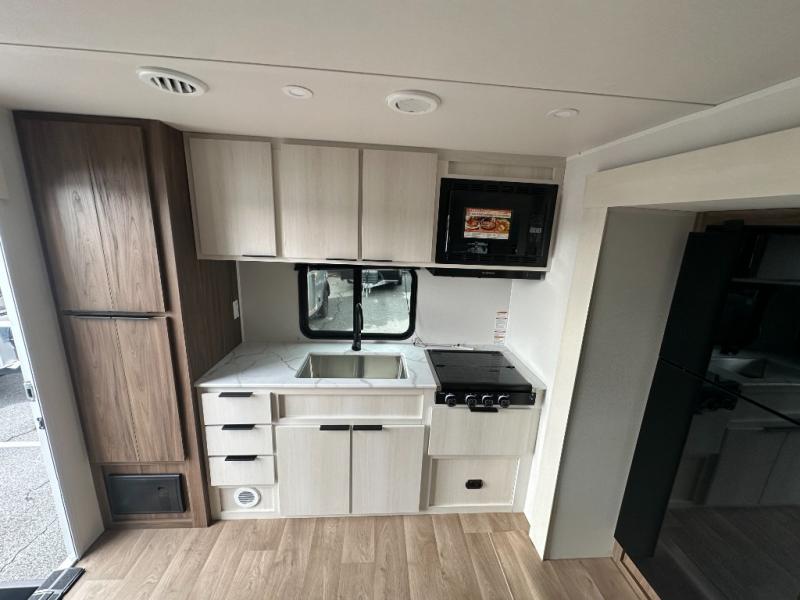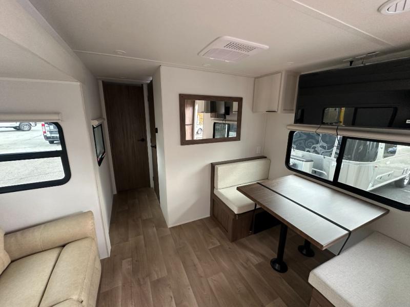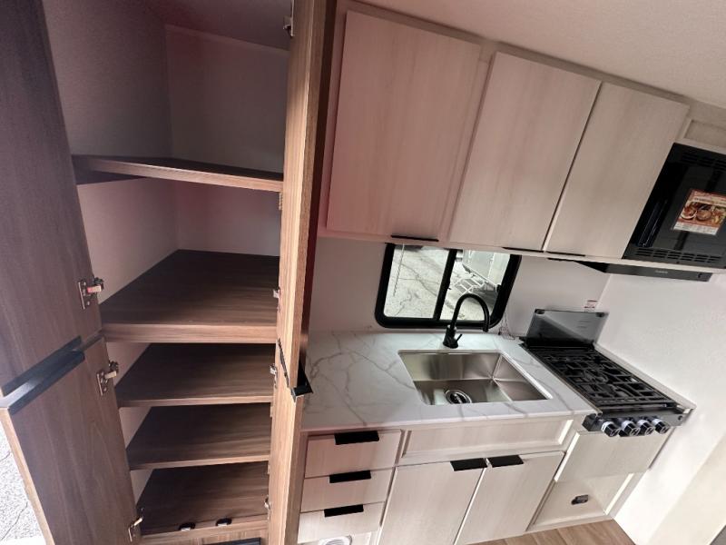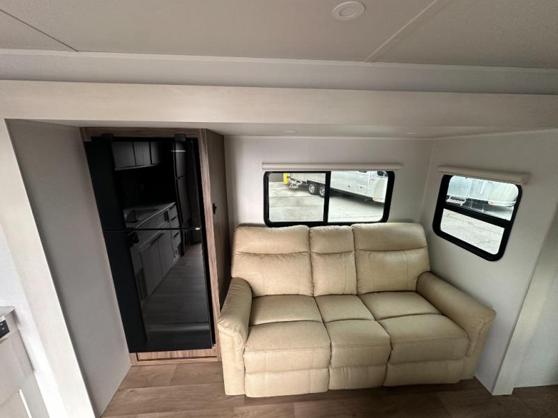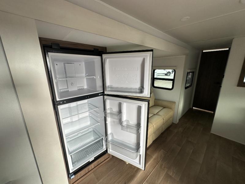 You'll love every minute spent in this spacious travel trailer! With dual entry doors, you can enter in through the rear kitchen or the front private bedroom! There are dual beside wardrobes here and a closet so you can keep your space organized, and the full bath is right next to the bedroom for easy nighttime use. Back to the kitchen, you'll find ample counter space to prep meals, a three-burner cooktop, plus a pantry and 10 cu. ft. 12V refrigerator for food storage. Your crew can dine at the booth dinette, then relax on the tri-fold sofa slide after dinner. And both of these pieces of furniture can double as sleeping space for guests!
