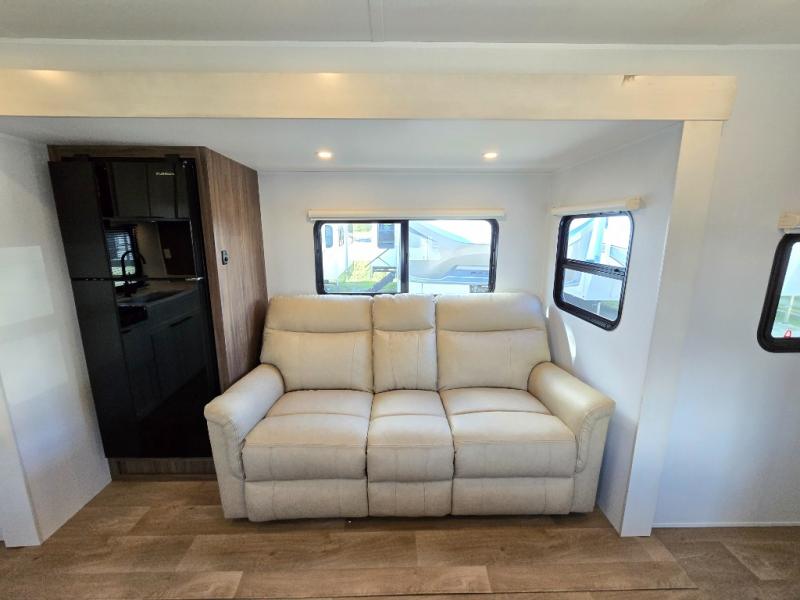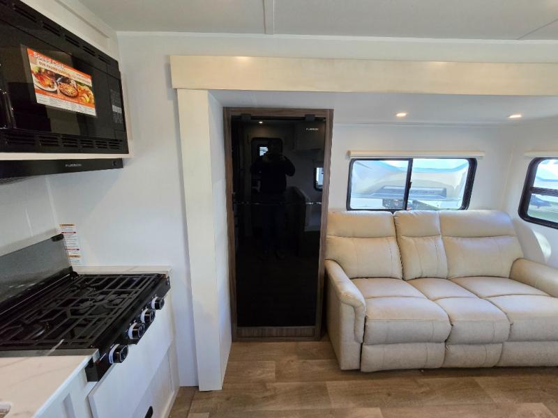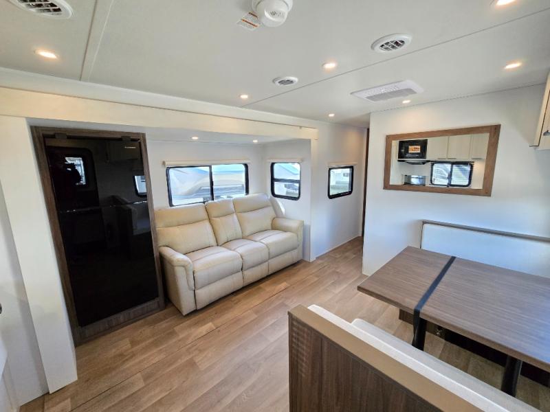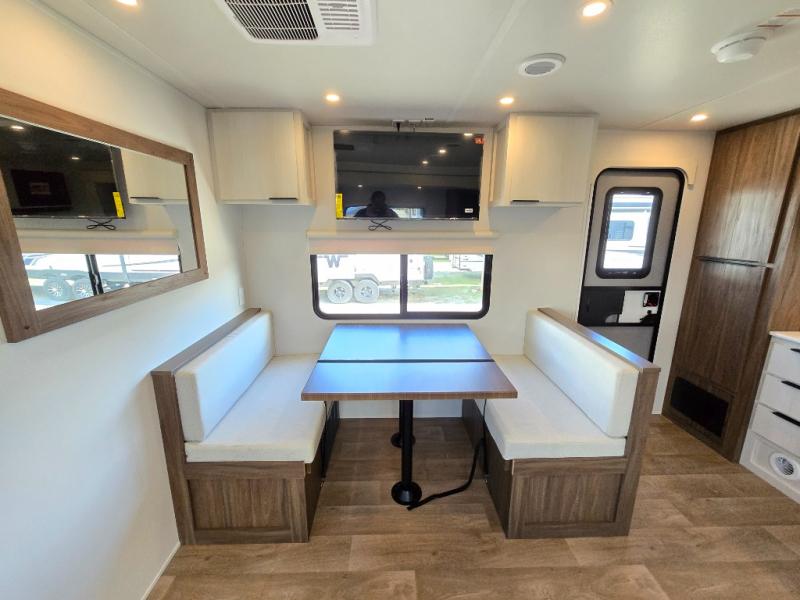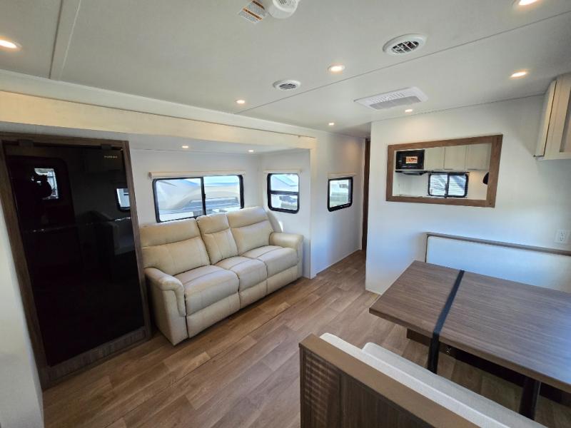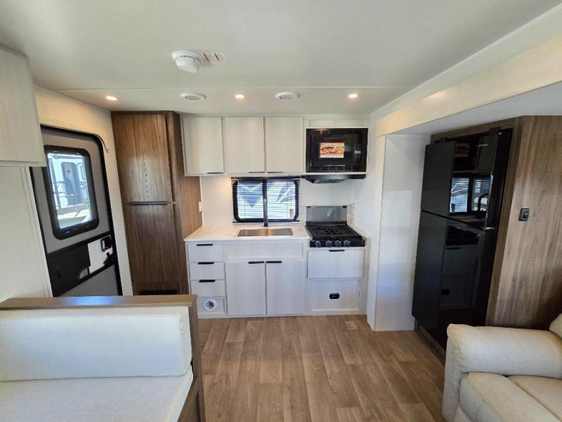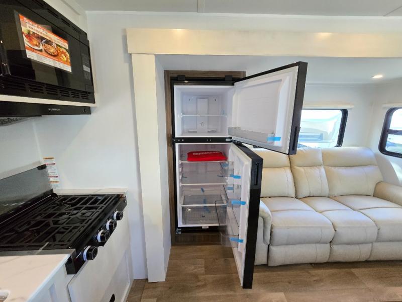 You'll love every minute spent in this spacious travel trailer! With dual entry doors, you can enter in through the rear kitchen or the front private bedroom! There are dual beside wardrobes here and a closet so you can keep your space organized, and the full bath is right next to the bedroom for easy nighttime use. Back to the kitchen, you'll find ample counter space to prep meals, a three-burner cooktop, plus a pantry and 10 cu. ft. 12V refrigerator for food storage. Your crew can dine at the booth dinette, then relax on the tri-fold sofa slide after dinner. And both of these pieces of furniture can double as sleeping space for guests!
