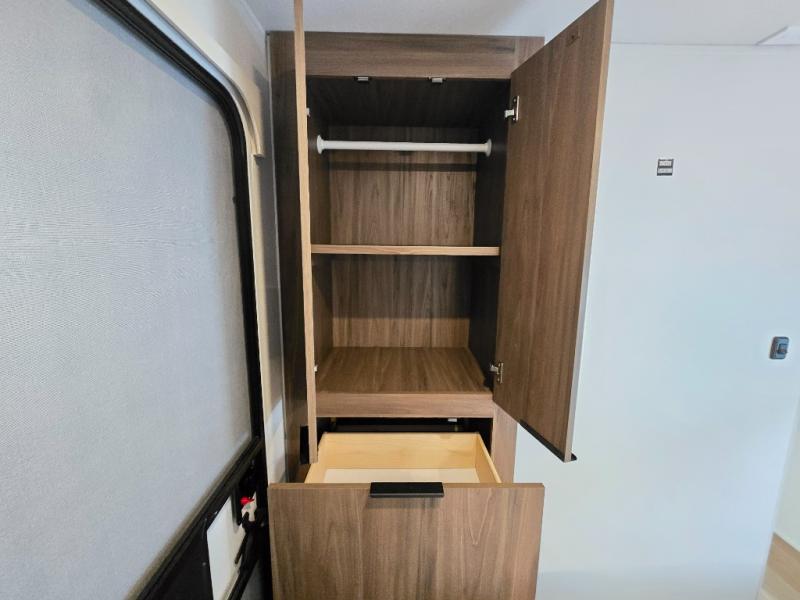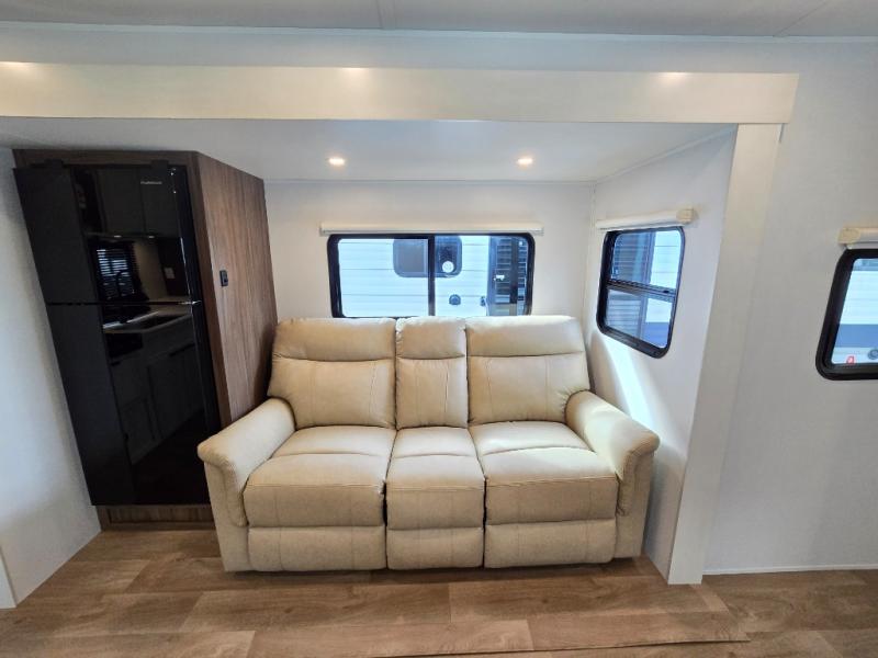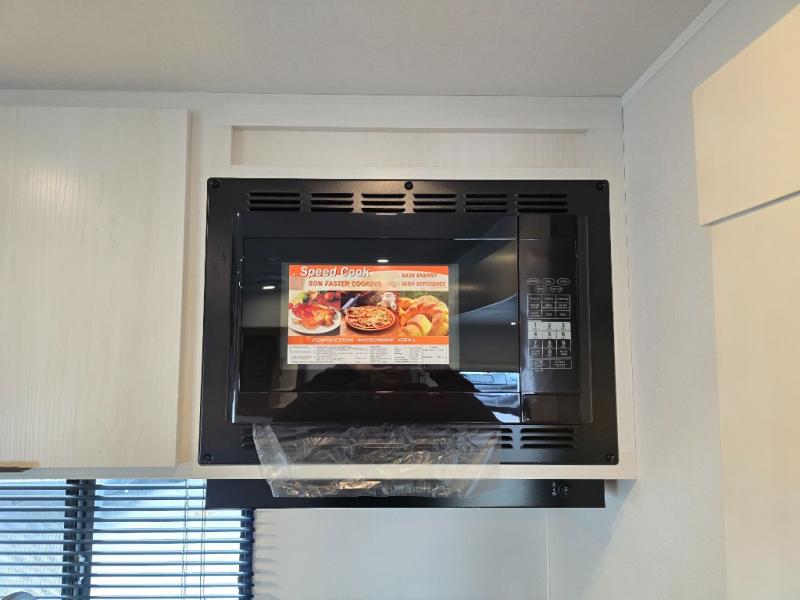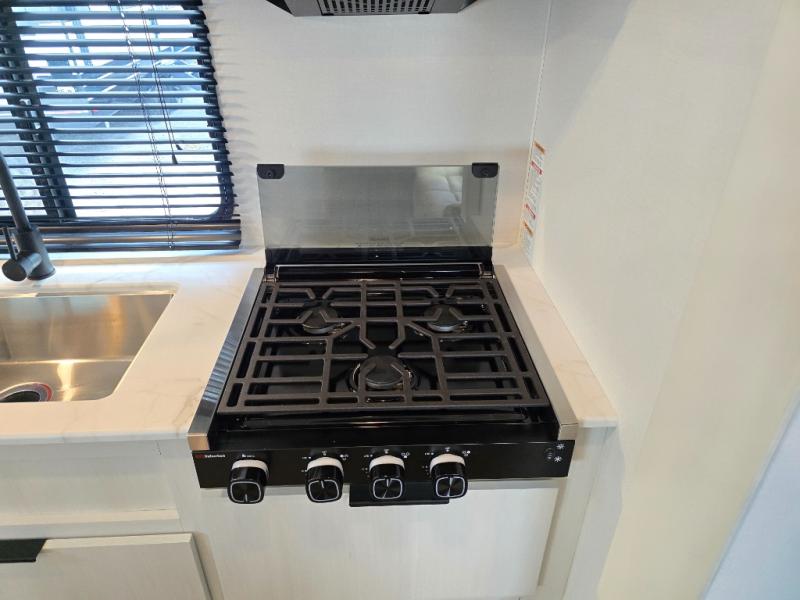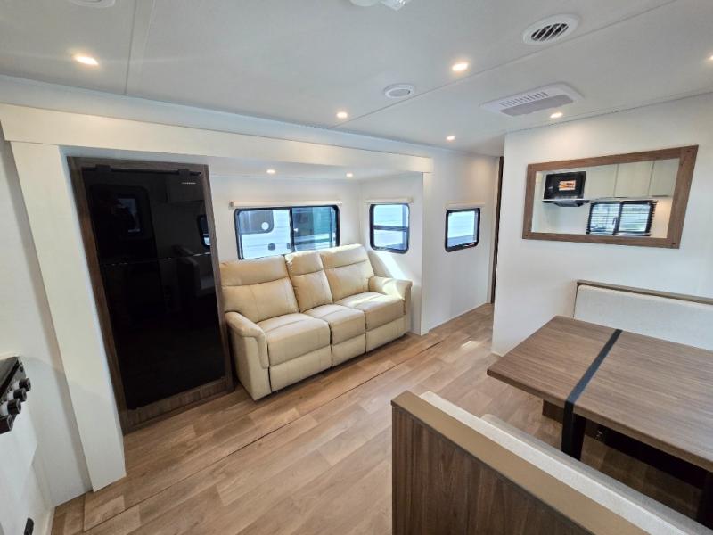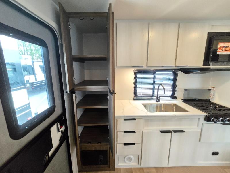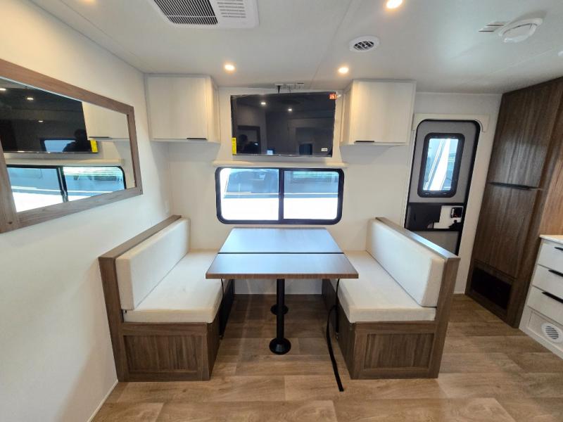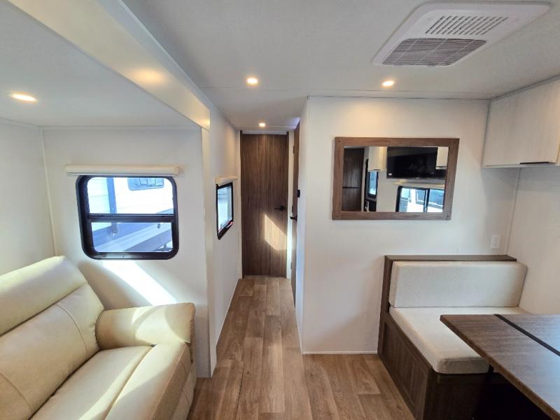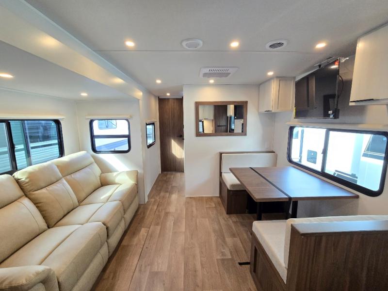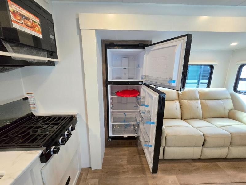 You'll love every minute spent in this spacious travel trailer! With dual entry doors, you can enter in through the rear kitchen or the front private bedroom! There are dual beside wardrobes here and a closet so you can keep your space organized, and the full bath is right next to the bedroom for easy nighttime use. Back to the kitchen, you'll find ample counter space to prep meals, a three-burner cooktop, plus a pantry and 10 cu. ft. 12V refrigerator for food storage. Your crew can dine at the booth dinette, then relax on the tri-fold sofa slide after dinner. And both of these pieces of furniture can double as sleeping space for guests!