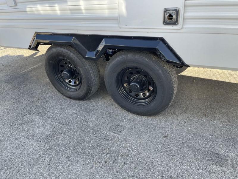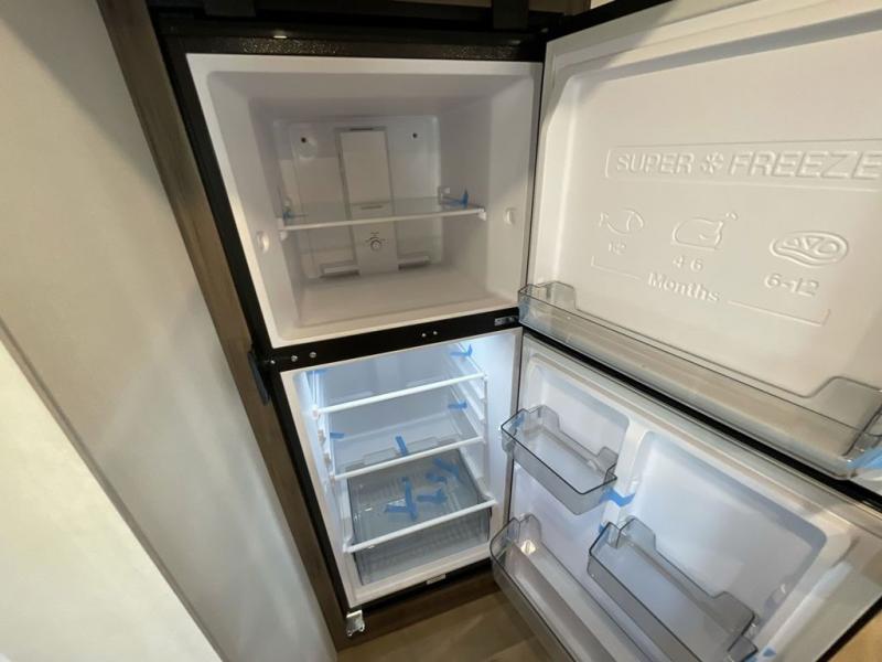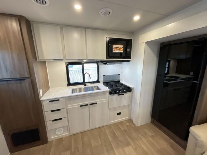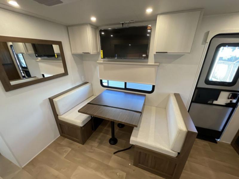 You'll love every minute spent in this spacious travel trailer! With dual entry doors, you can enter in through the rear kitchen or the front private bedroom! There are dual beside wardrobes here and a closet so you can keep your space organized, and the full bath is right next to the bedroom for easy nighttime use. Back to the kitchen, you'll find ample counter space to prep meals, a three-burner cooktop, plus a pantry and 10 cu. ft. 12V refrigerator for food storage. Your crew can dine at the booth dinette, then relax on the tri-fold sofa slide after dinner. And both of these pieces of furniture can double as sleeping space for guests!
