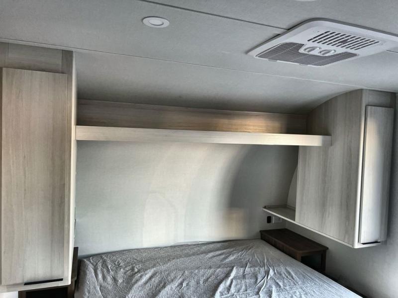 You'll love every minute spent in this spacious travel trailer! With dual entry doors, you can enter in through the rear kitchen or the front private bedroom! There are dual beside wardrobes here and a closet so you can keep your space organized, and the full bath is right next to the bedroom for easy nighttime use. Back to the kitchen, you'll find ample counter space to prep meals, a three-burner cooktop, plus a pantry and 10 cu. ft. 12V refrigerator for food storage. Your crew can dine at the booth dinette, then relax on the tri-fold sofa slide after dinner. And both of these pieces of furniture can double as sleeping space for guests!