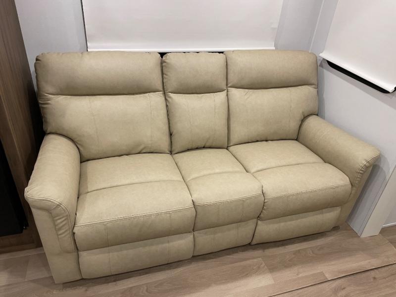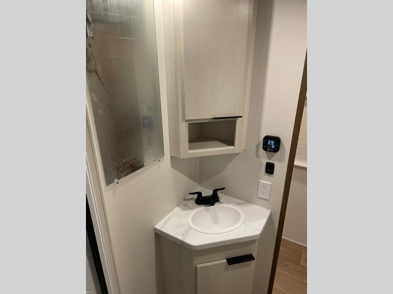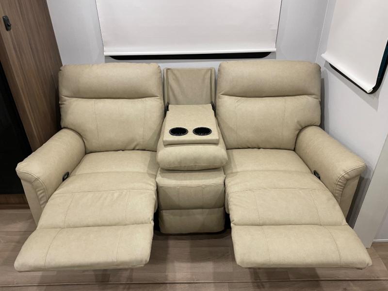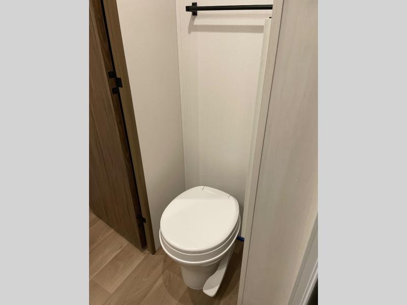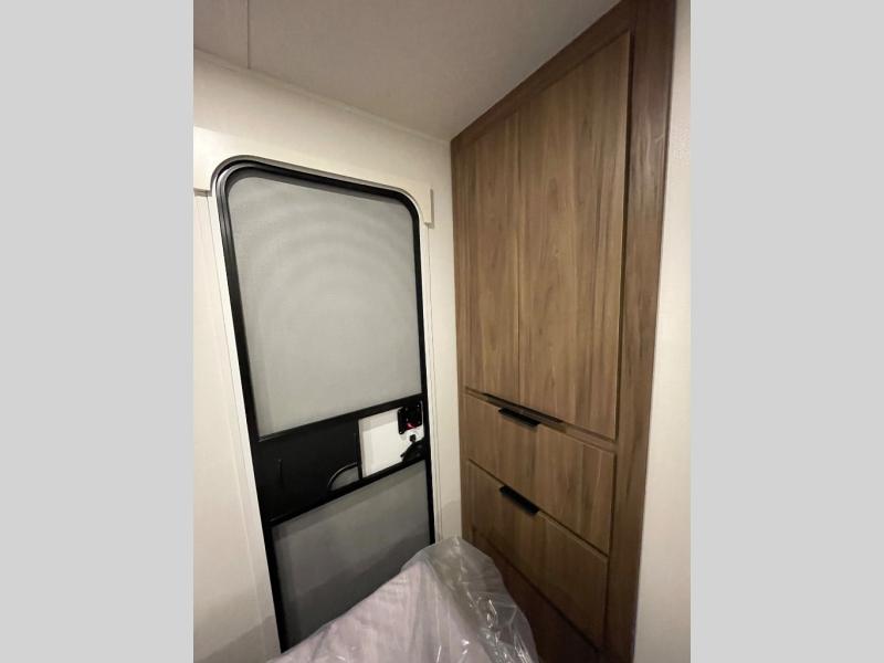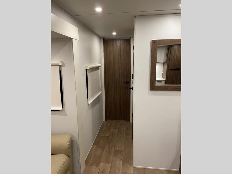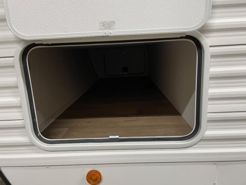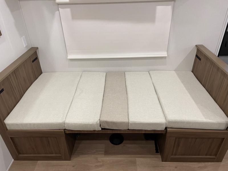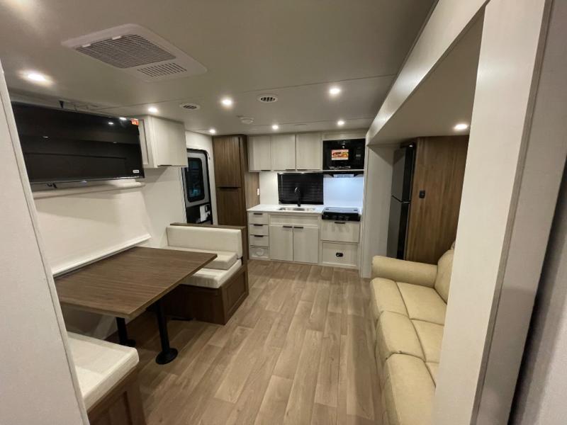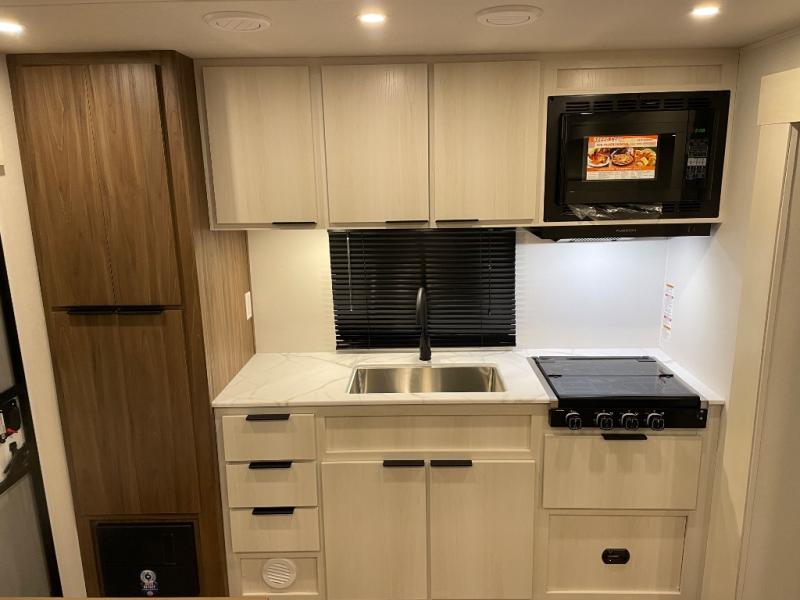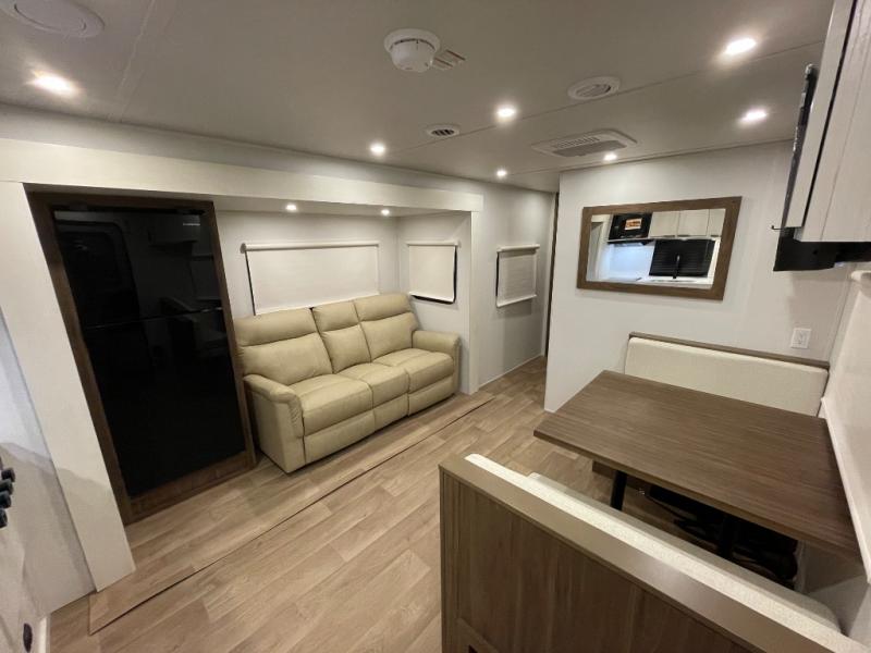 You'll love every minute spent in this spacious travel trailer! With dual entry doors, you can enter in through the rear kitchen or the front private bedroom! There are dual beside wardrobes here and a closet so you can keep your space organized, and the full bath is right next to the bedroom for easy nighttime use. Back to the kitchen, you'll find ample counter space to prep meals, a three-burner cooktop, plus a pantry and 10 cu. ft. 12V refrigerator for food storage. Your crew can dine at the booth dinette, then relax on the tri-fold sofa slide after dinner. And both of these pieces of furniture can double as sleeping space for guests!