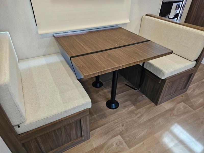 Tri-fold sofa and booth dinette convert into additional sleeping space