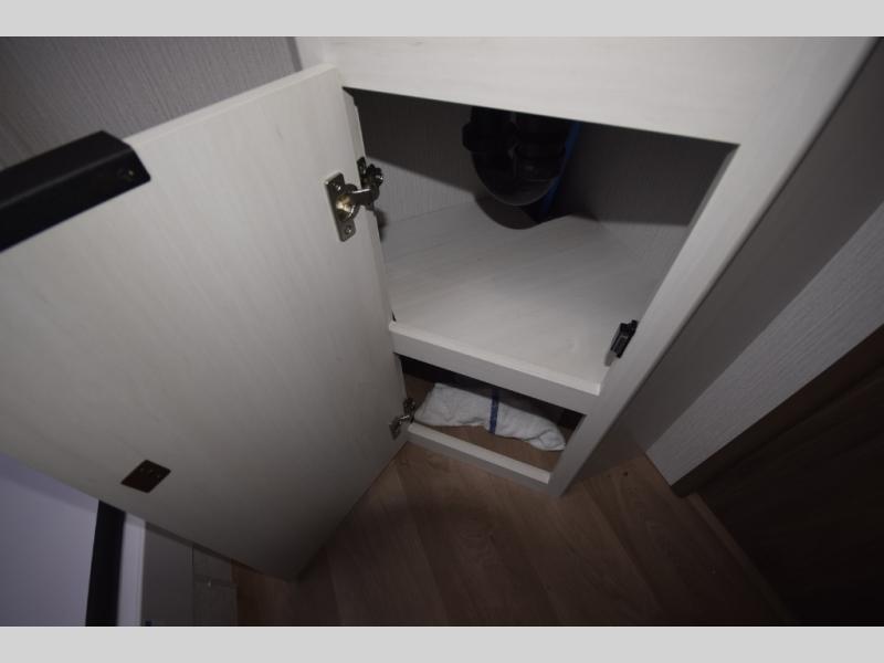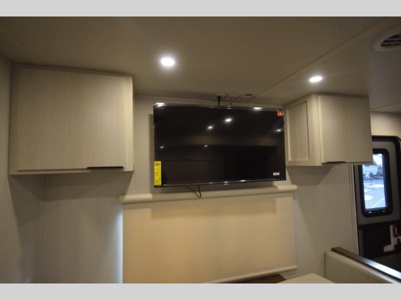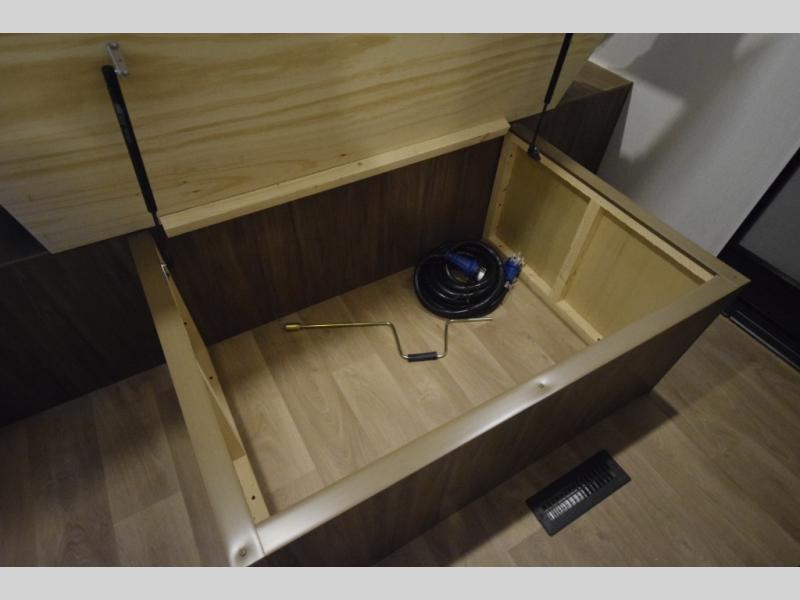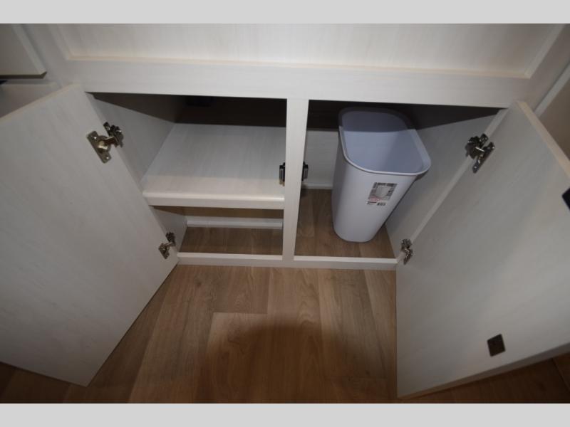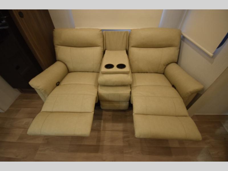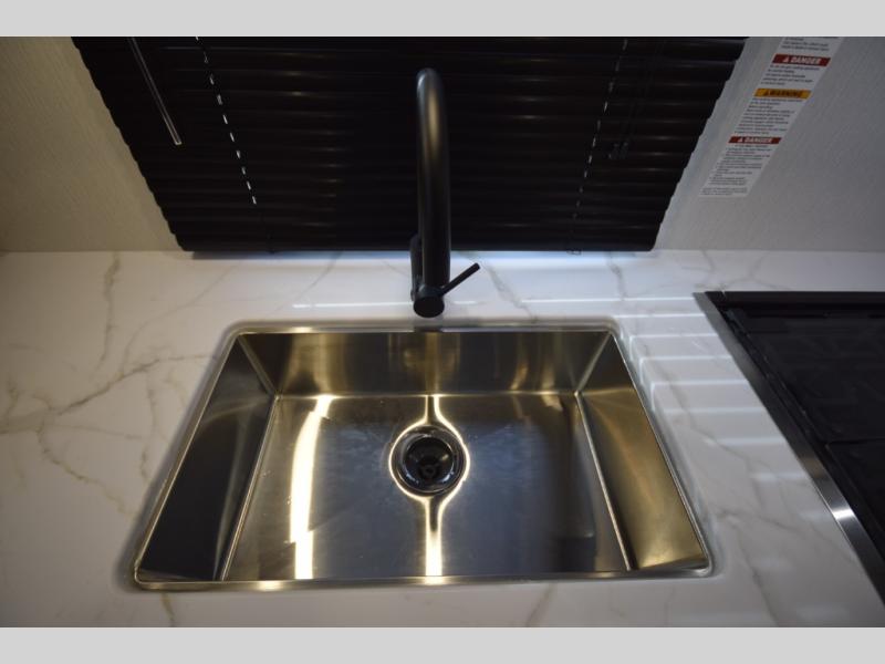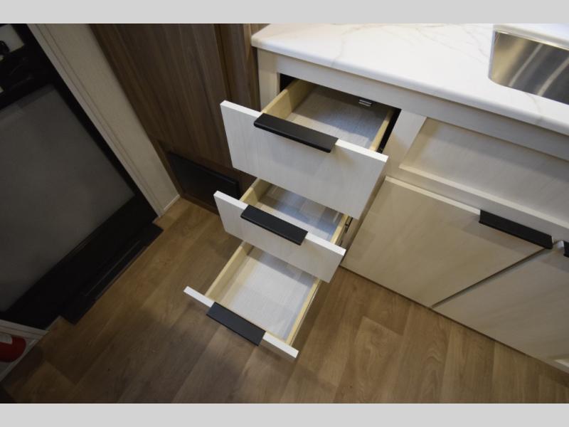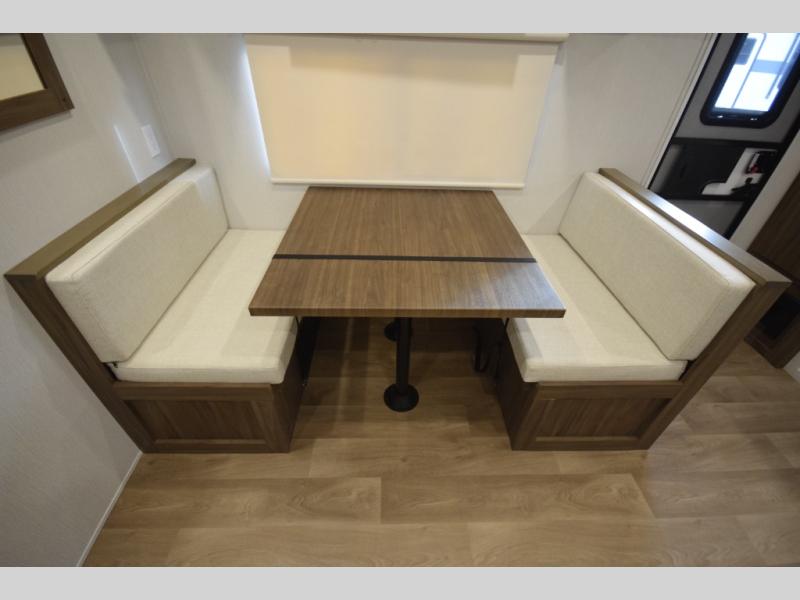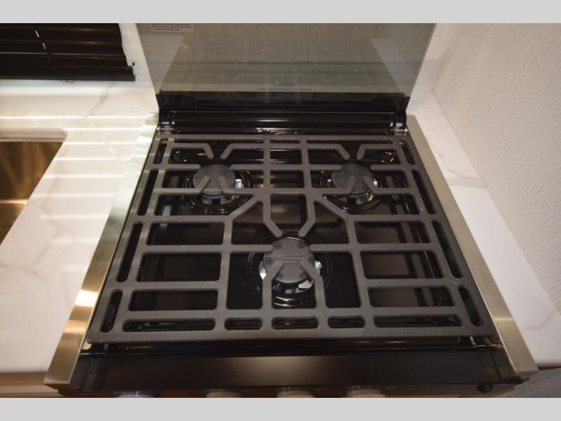 Head to the rear kitchen and discover a functional, well-designed space perfect for cooking on the go. With generous counter space, a three-burner cooktop, a large pantry, and a 10 cu. ft. 12V refrigerator, meal prep is simple whether you’re camping for a weekend or traveling long-term. After dinner, gather around the booth dinette or stretch out on the tri-fold sofa slide—both of which easily convert into additional sleeping space for guests.