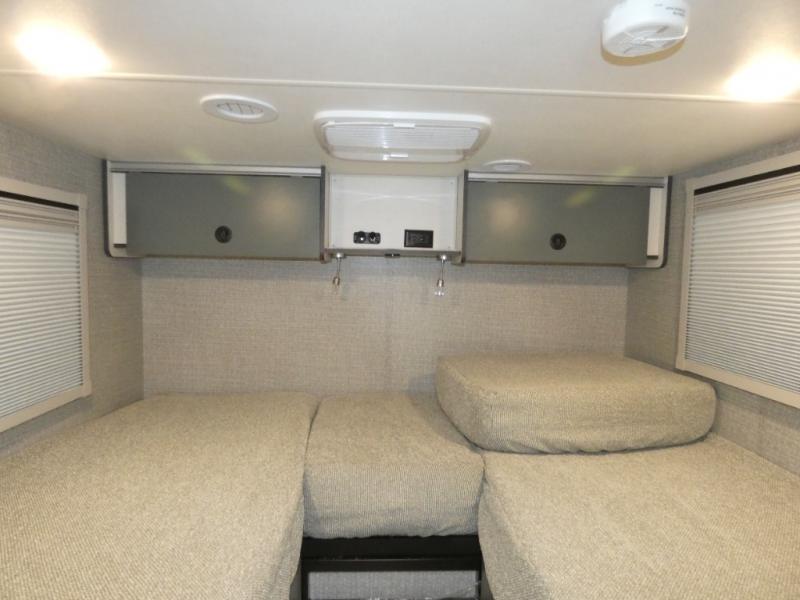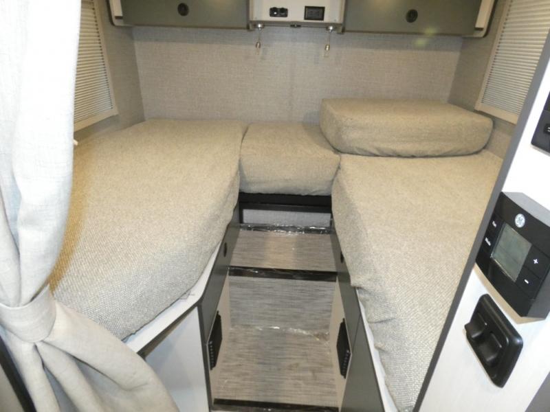 This EKKO all-wheel drive Class C gas motorhome is just unbelievably functional! Not only do you have plenty of storage space for all of your gear with the gear garage, under-bed storage, pantry, and 5.3-cubic foot refrigerator, but you also have a 24" x 30" wet bath with a pivoting lavatory wall so you can stay clean without having to stop at rest areas along the way. The cab area is excellently appointed with a radio/rearview monitor system, swivel/recline cab seats, and many driving safety features. Since the cab seats can swivel, you can use them as another place to sit down and eat at the fold-down table, and you can also use the swivel/adjustable work table for the passenger cab seat or as an extended countertop in the kitchen.