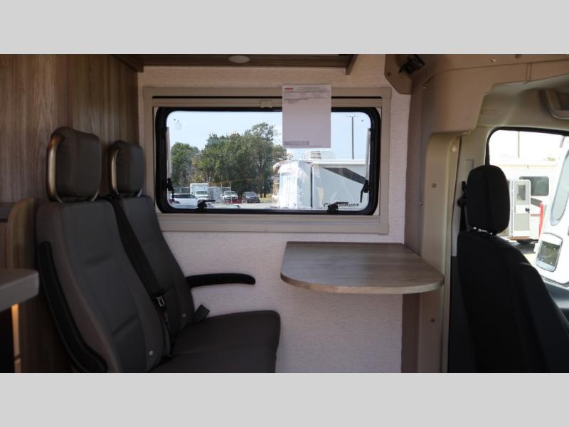 This EKKO all-wheel drive Class C gas motorhome is just unbelievably functional! Not only do you have plenty of storage space for all of your gear with the gear garage, under-bed storage, pantry, and 5.3-cubic foot refrigerator, but you also have a 24" x 30" wet bath with a pivoting lavatory wall so you can stay clean without having to stop at rest areas along the way. The cab area is excellently appointed with a radio/rearview monitor system, swivel/recline cab seats, and many driving safety features. Since the cab seats can swivel, you can use them as another place to sit down and eat at the fold-down table, and you can also use the swivel/adjustable work table for the passenger cab seat or as an extended countertop in the kitchen. Above the dining area is an access point to the optional pop-top sleeping area which would come in handy if you travel with multiple people.