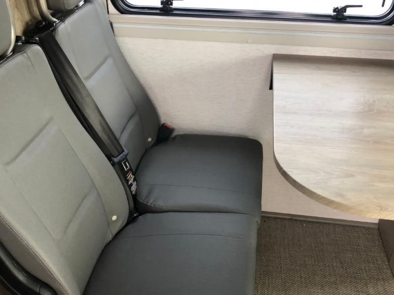 This EKKO all-wheel drive Class C gas motorhome is just unbelievably functional! Not only do you have plenty of storage space for all of your gear with the gear garage, under-bed storage, pantry, and 5.3-cubic foot refrigerator, but you also have a 24" x 30" wet bath with a pivoting lavatory wall so you can stay clean without having to stop at rest areas along the way. The cab area is excellently appointed with a radio/rearview monitor system, swivel/recline cab seats, and many driving safety features. Since the cab seats can swivel, you can use them as another place to sit down and eat at the fold-down table, and you can also use the swivel/adjustable work table for the passenger cab seat or as an extended countertop in the kitchen. Above the dining area is an access point to the optional pop-top sleeping area which would come in handy if you travel with multiple people.