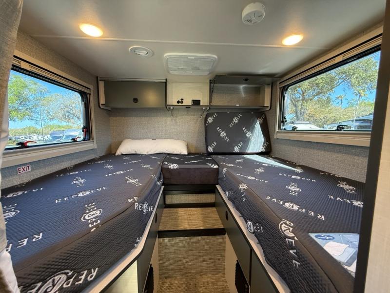 Inside the Ekko 22A, the layout is designed for versatility. The rear sleeping area features dual twin beds with memory foam mattresses that easily convert into a spacious king, allowing you to configure the space for sleeping or extra storage.