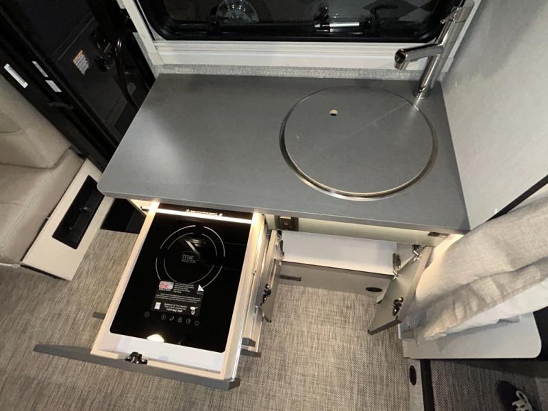 You will love the versatility found throughout this motorhome! Starting with the multifunctional lounge that can convert into four different modes. The flexible wet-dry bath has a pivoting lavatory wall, a 24" x 30" shower, an Oxygenics shower head to wash up, and even robe hooks to hang your towel afterwards. Keep your bellies full with delicious home cooked meals prepared in the versatile galley with the portable single burner induction range top, convection microwave oven, and 5.3 cu. ft. single door 12V refrigerator, plus a galley drawer/counter extension base. The heated gear garage has a L-track cargo tie down system with removable floor liner, 110V/12V charging ports and LED lighting to see clearly day or night!