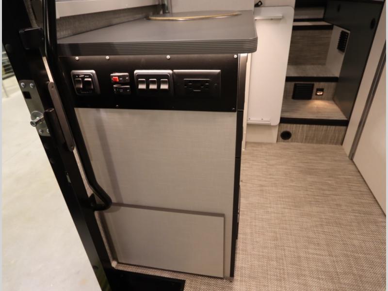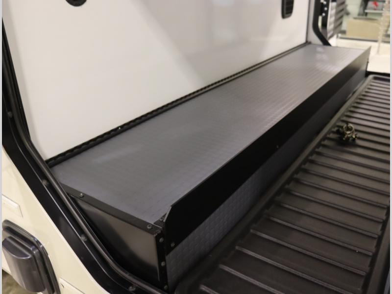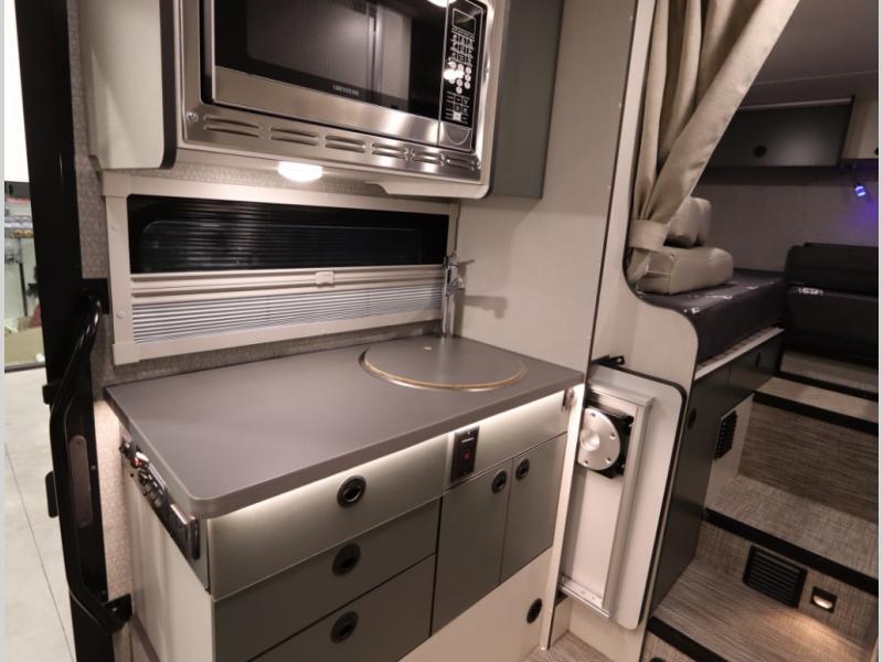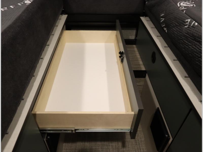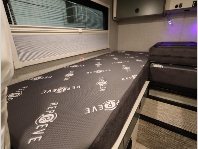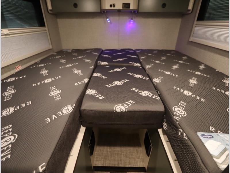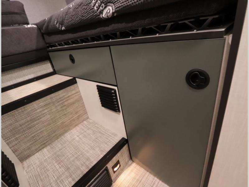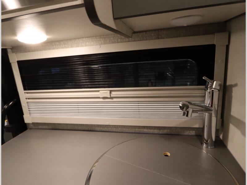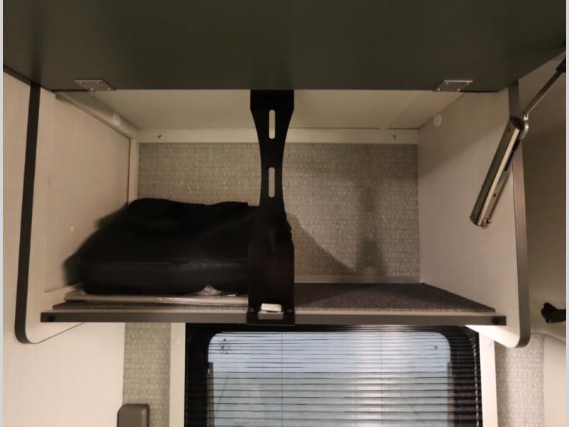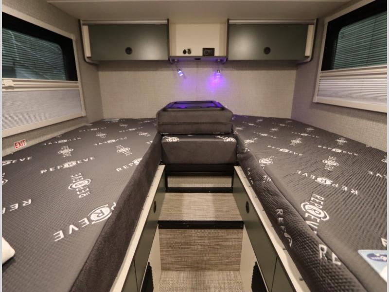 The EKKO 23B features a new modular front living area with dual seat belt locations, 4 total, that can be configured as a large forward facing dinette, cross coach dinette, dual sofas, or a 30x78 inch sleeping surface. Add the Luno Life cab bed, the EKKO 23B has sleeping for 4. A pop top addition can sleep an additional 2 for a total of 6!