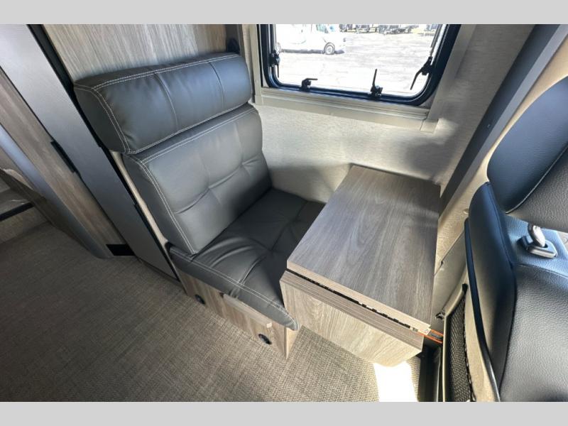 This EKKO all-wheel drive Class C gas motorhome is just unbelievably functional! Not only do you have plenty of storage space for all of your gear with the gear garage, under-bed storage, pantry, and 5.3-cubic foot refrigerator, but you also have a 24" x 30" wet bath with a pivoting lavatory wall so you can stay clean without having to stop at rest areas along the way. The cab area is excellently appointed with a radio/rearview monitor system, swivel/recline cab seats, and many driving safety features. Since the cab seats can swivel, you can use them as another place to sit down and eat at the fold-down table, and you can also use the swivel/adjustable work table for the passenger cab seat or as an extended countertop in the kitchen. Above the dining area is an access point to the optional pop-top sleeping area which would come in handy if you travel with multiple people.