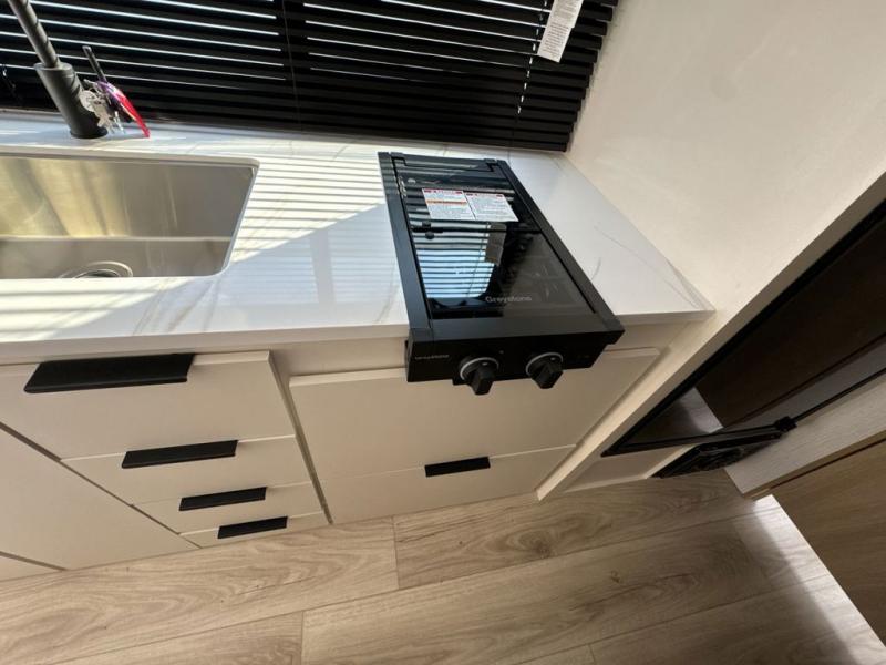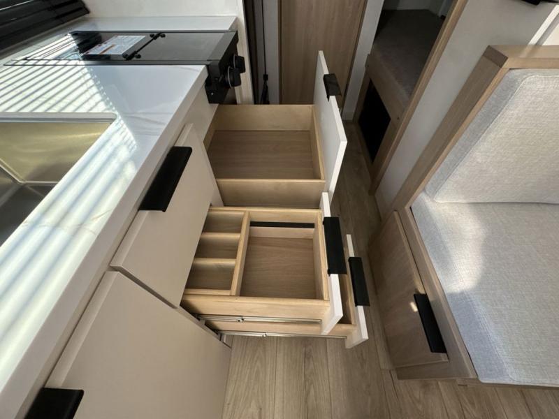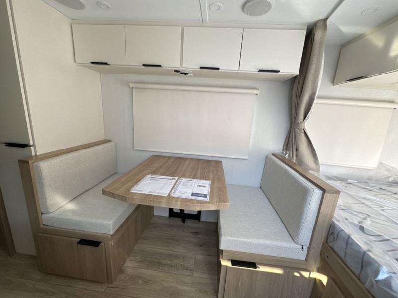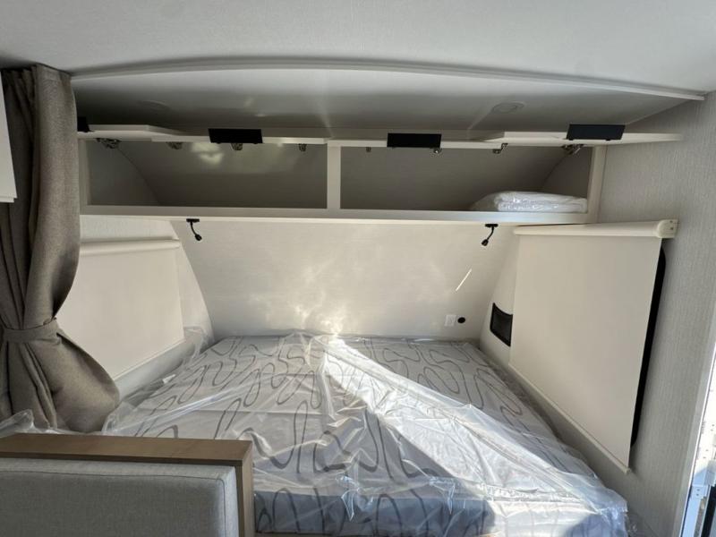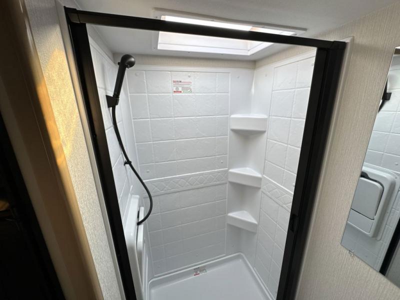 Pack your bags and load up the kids to head out on a great camping adventure as a family! There is a front 54" x 74" full-size bed for you and a set of rear corner bunk beds for the kids, plus they can bring a friend to sleep on the 32" x 74" booth dinette. You can prepare meals for the whole group with the three burner cooktop and the 10.3 cu. ft. 12V refrigerator, plus you can pop a bag of popcorn in the microwave for movie night with the Smart TV. And a private toilet and 24" x 36" shower next to the bunks and offers a great place to get ready for the day or bedtime.
