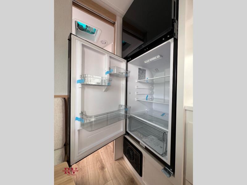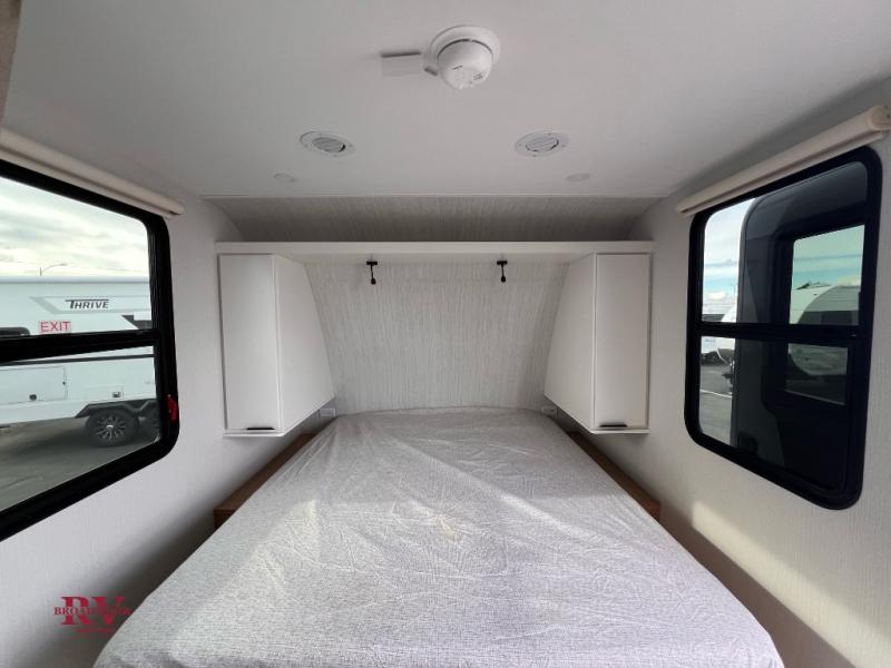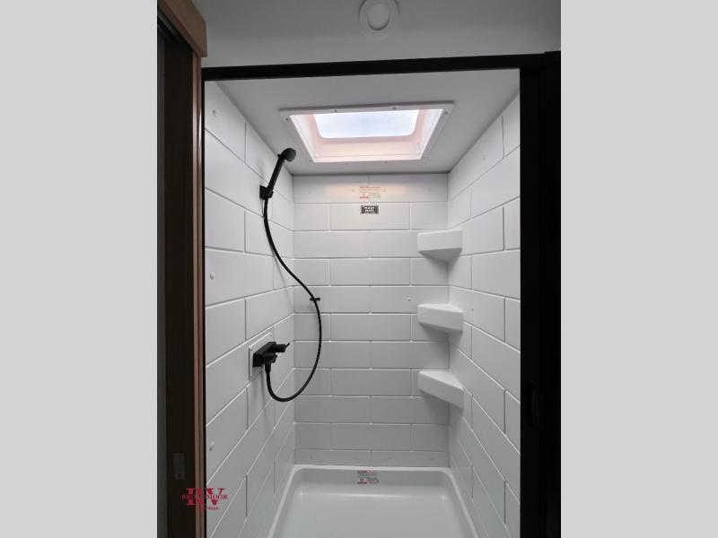 You'll love camping in this travel trailer with front RV queen bed and a divider curtain if you have a guest sleeping over on the booth dinette. You can whip up your best meals on the two-burner cooktop or in the convection microwave, and there is a 10-cu. ft. 12V refrigerator to keep your food fresh. A full rear bath will let you clean up after a day outdoors, and you'll appreciate the bath wardrobe/linen closet to keep clean towels and clothes close by!