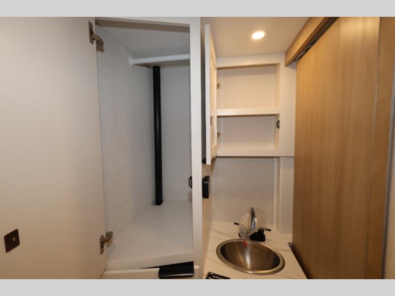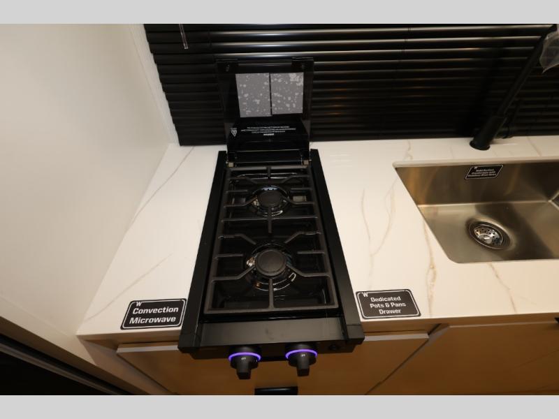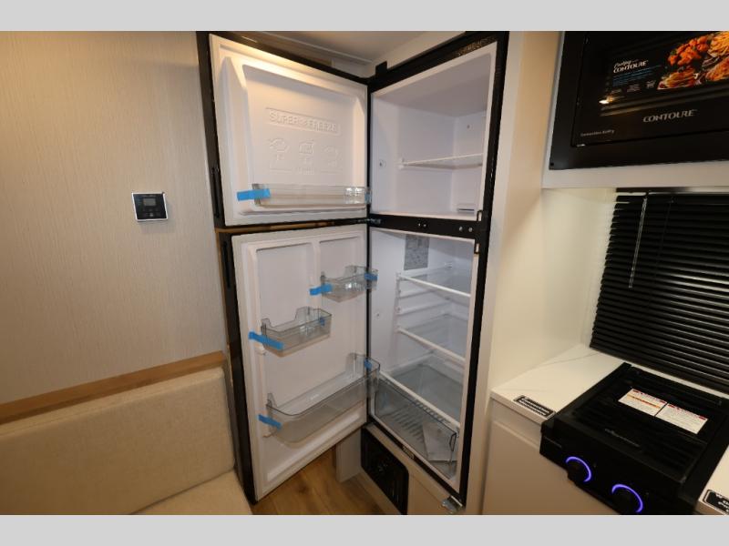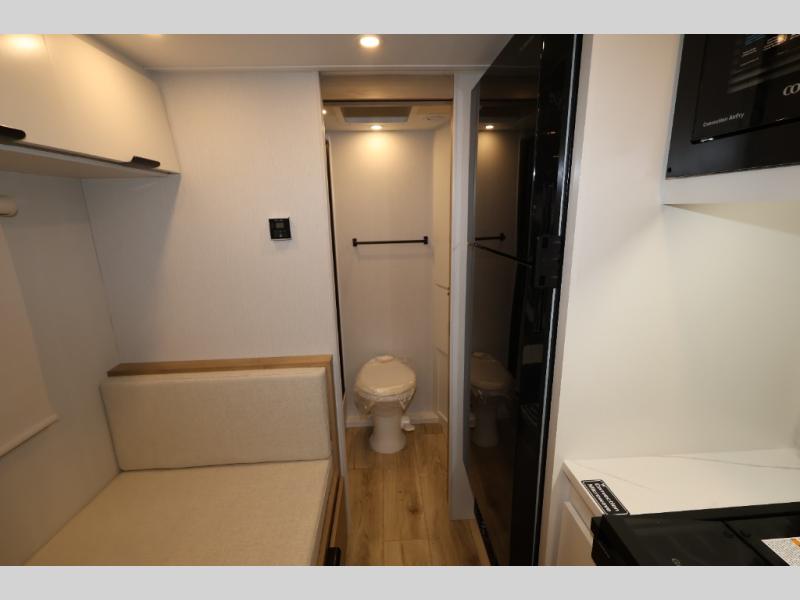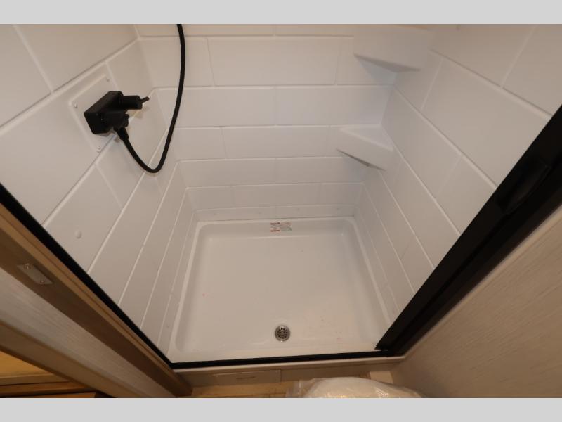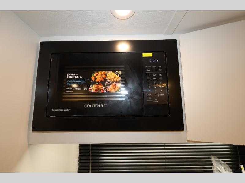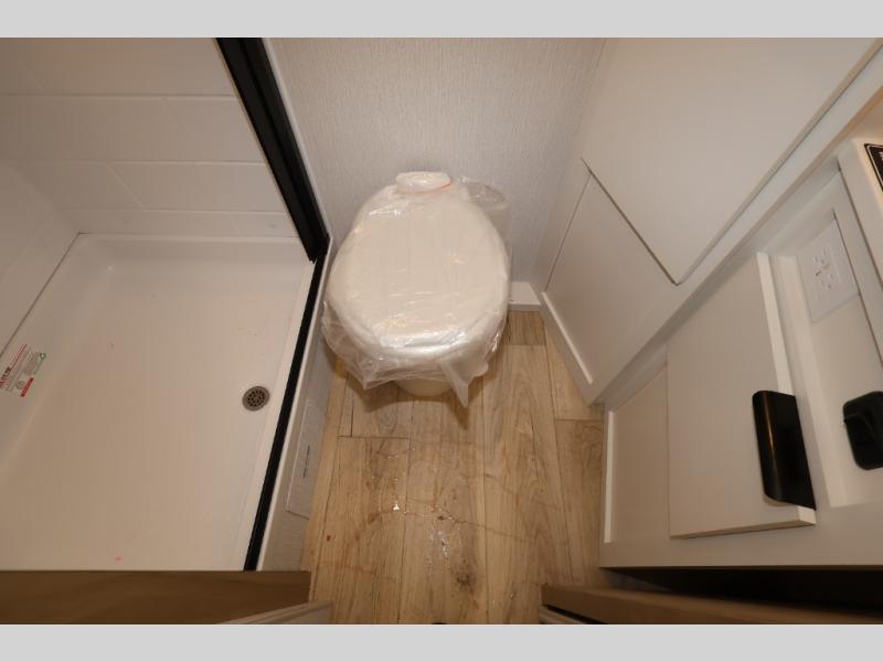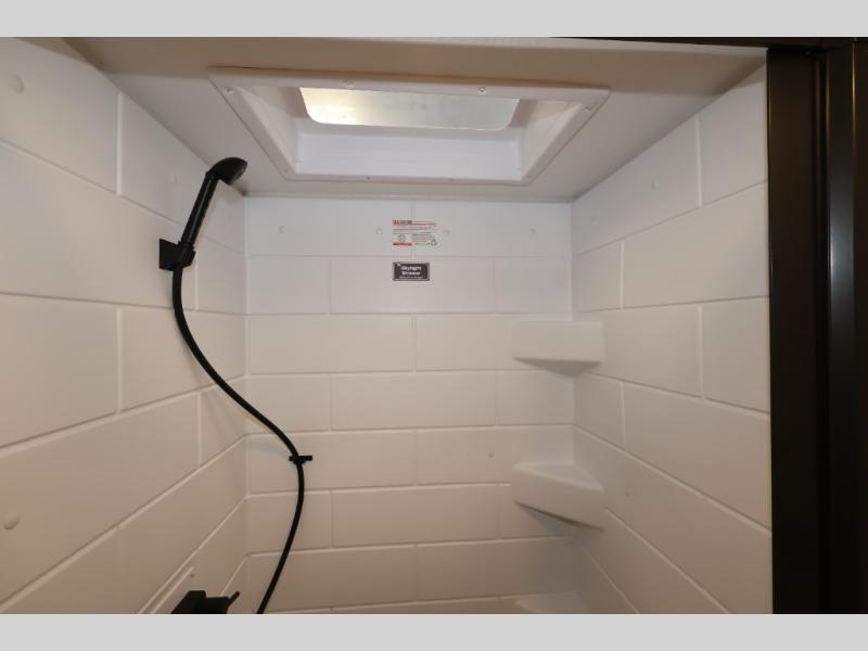 You'll love camping in this travel trailer with front RV queen bed and a divider curtain if you have a guest sleeping over on the booth dinette. You can whip up your best meals on the two-burner cooktop or in the convection microwave, and there is a 10-cu. ft. 12V refrigerator to keep your food fresh. A full rear bath will let you clean up after a day outdoors, and you'll appreciate the bath wardrobe/linen closet to keep clean towels and clothes close by!