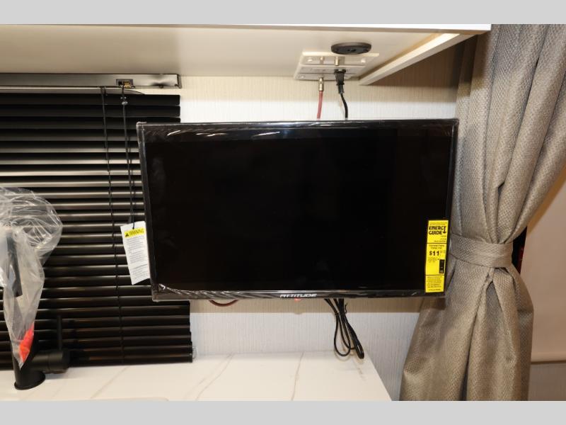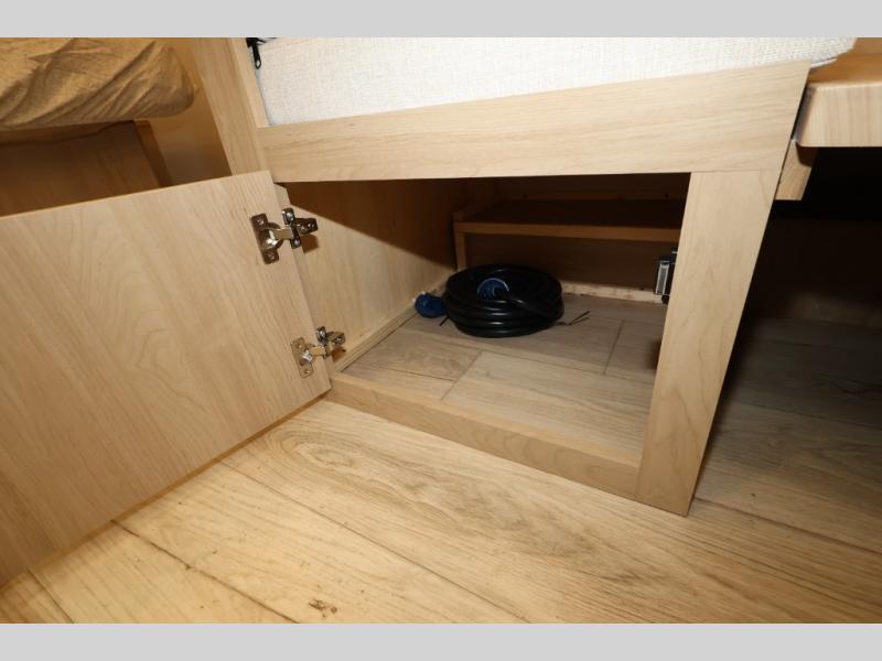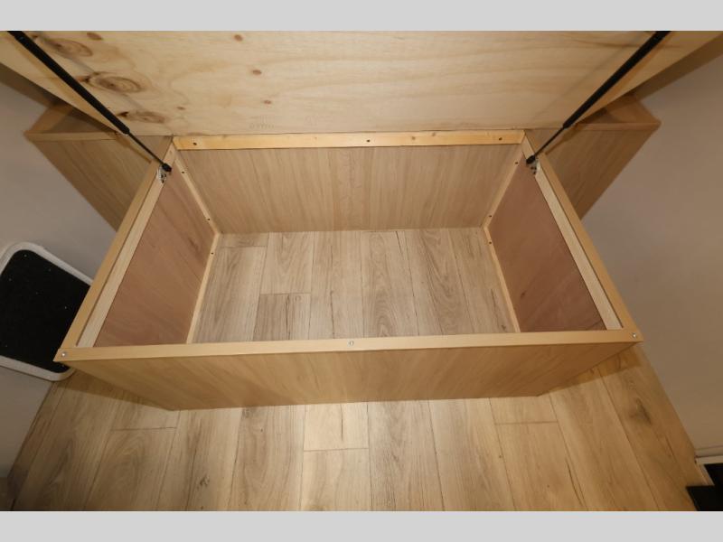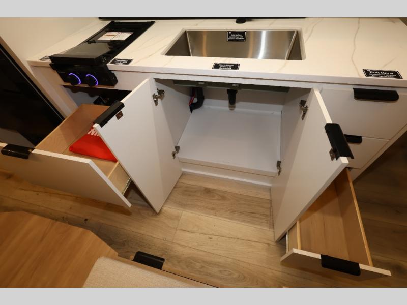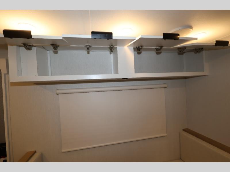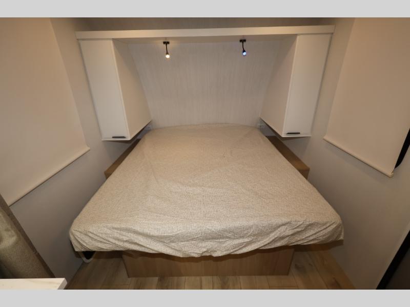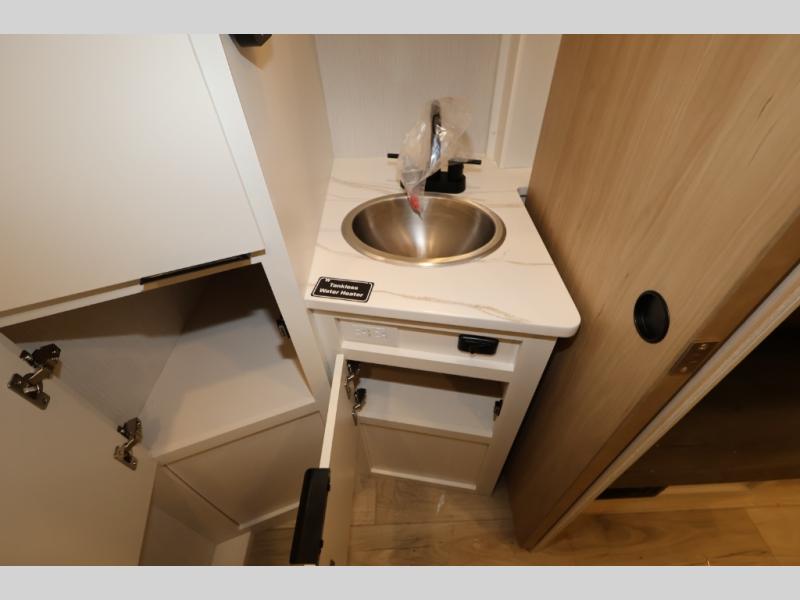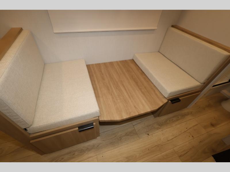 You'll love camping in this travel trailer with front RV queen bed and a divider curtain if you have a guest sleeping over on the booth dinette. You can whip up your best meals on the two-burner cooktop or in the convection microwave, and there is a 10-cu. ft. 12V refrigerator to keep your food fresh. A full rear bath will let you clean up after a day outdoors, and you'll appreciate the bath wardrobe/linen closet to keep clean towels and clothes close by!