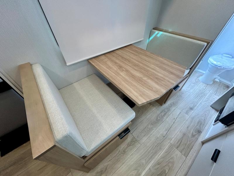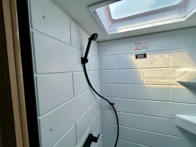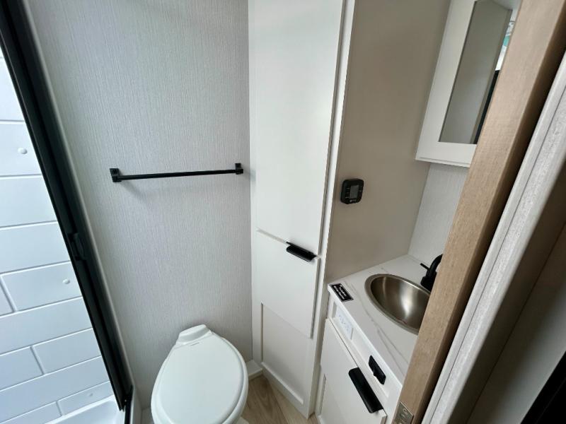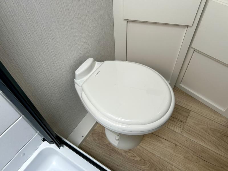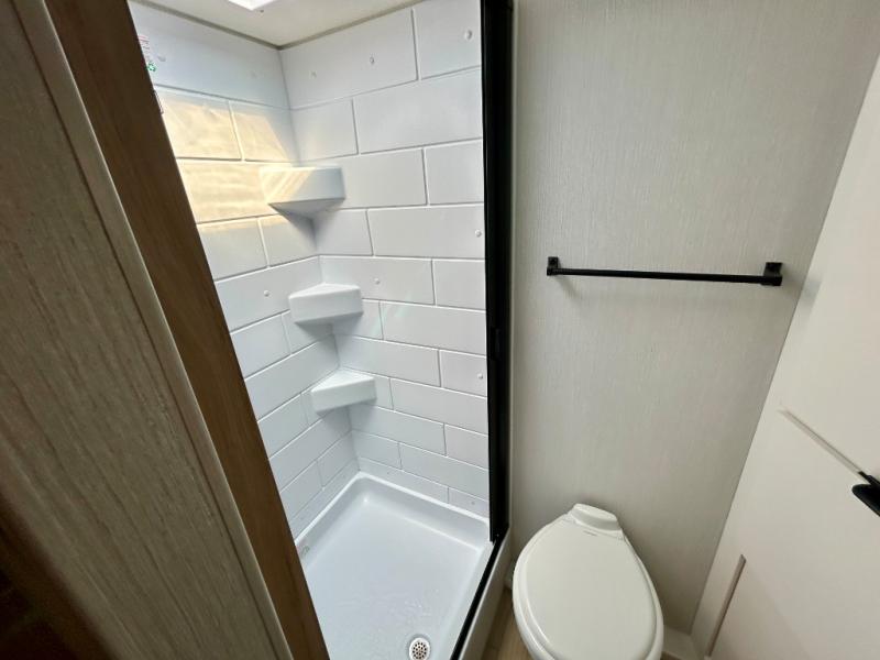 You'll love camping in this travel trailer with front RV queen bed and a divider curtain if you have a guest sleeping over on the booth dinette. You can whip up your best meals on the two-burner cooktop or in the convection microwave, and there is a 10-cu. ft. 12V refrigerator to keep your food fresh. A full rear bath will let you clean up after a day outdoors, and you'll appreciate the bath wardrobe/linen closet to keep clean towels and clothes close by!
